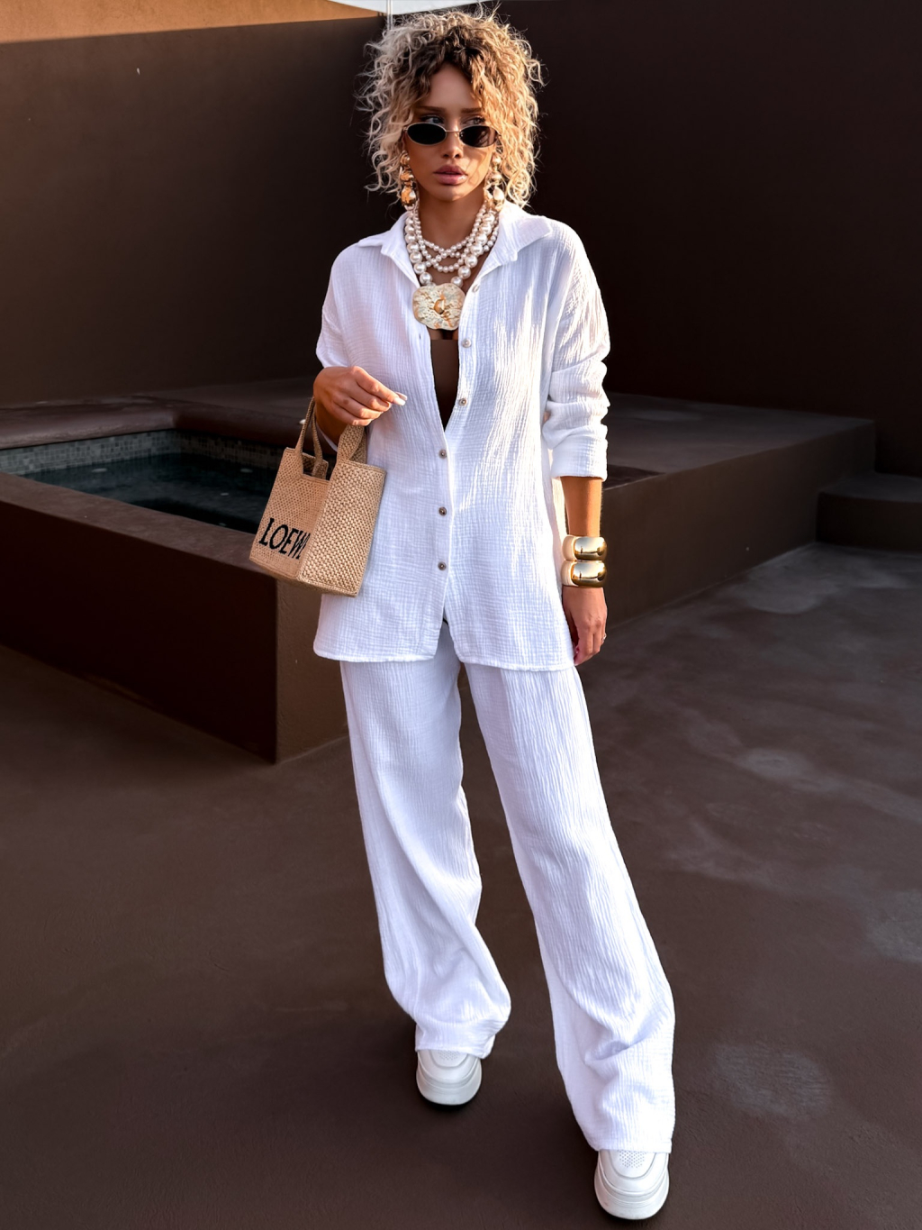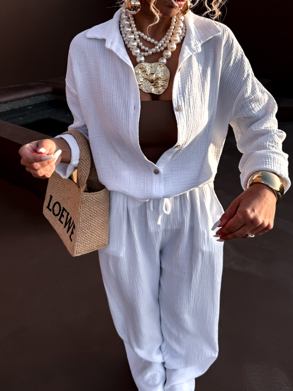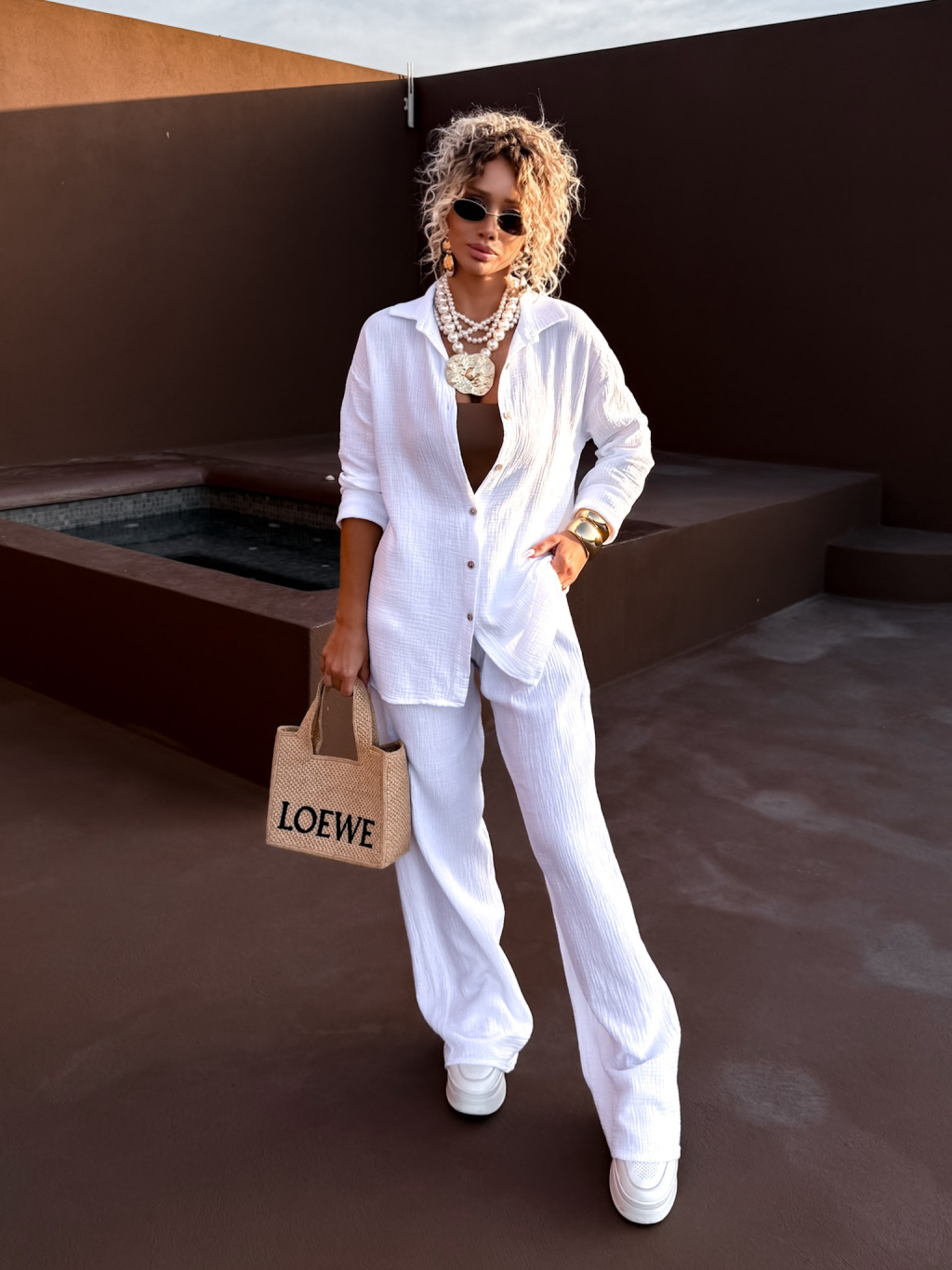 Bílý kalhotový mušelínový komplet THEIA s košilí