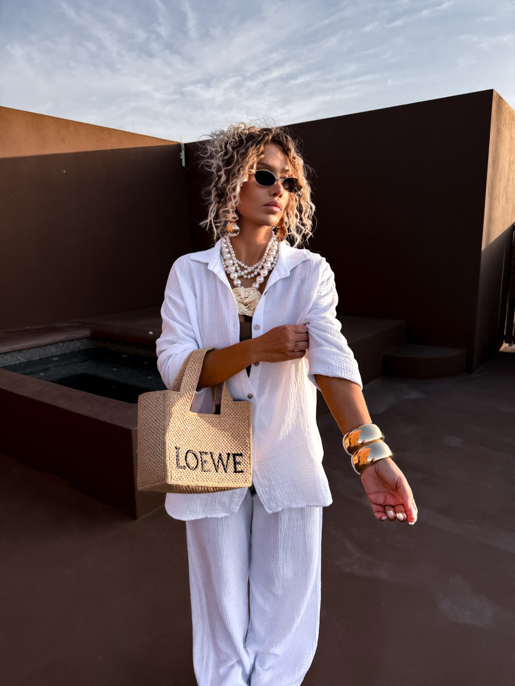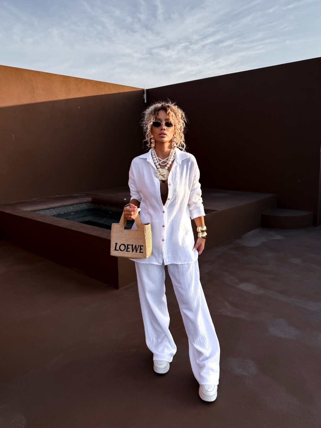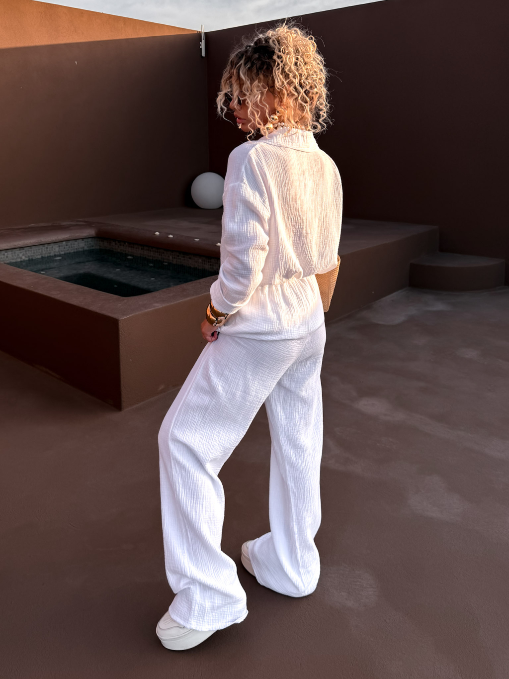 Bílý kalhotový mušelínový komplet THEIA s košilí