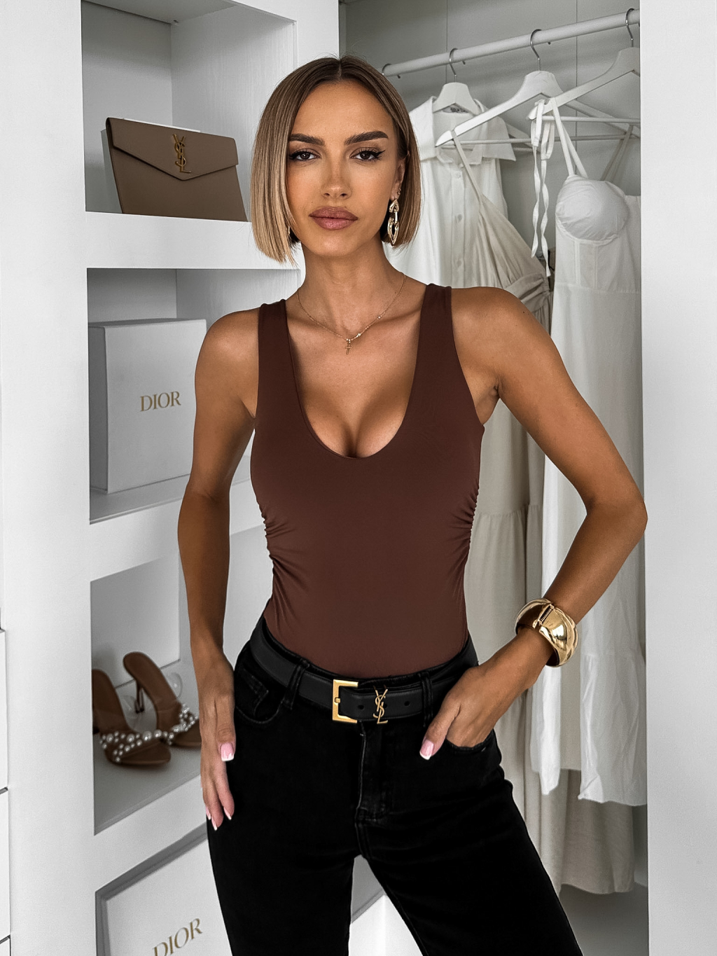 Hnědé elegantní body SARONE s výstřihem