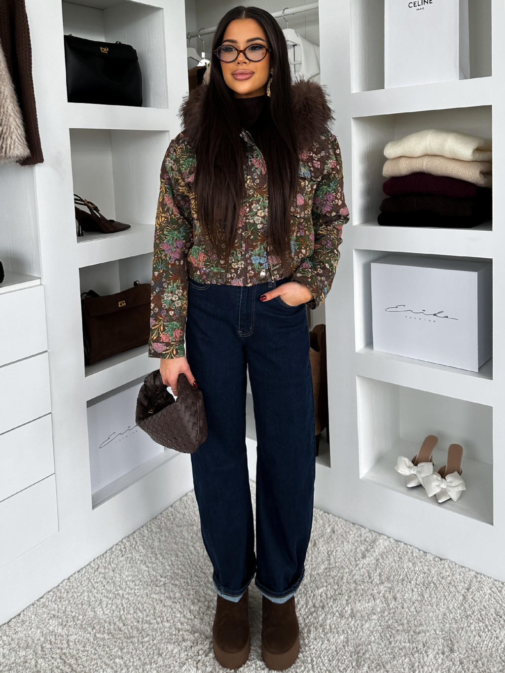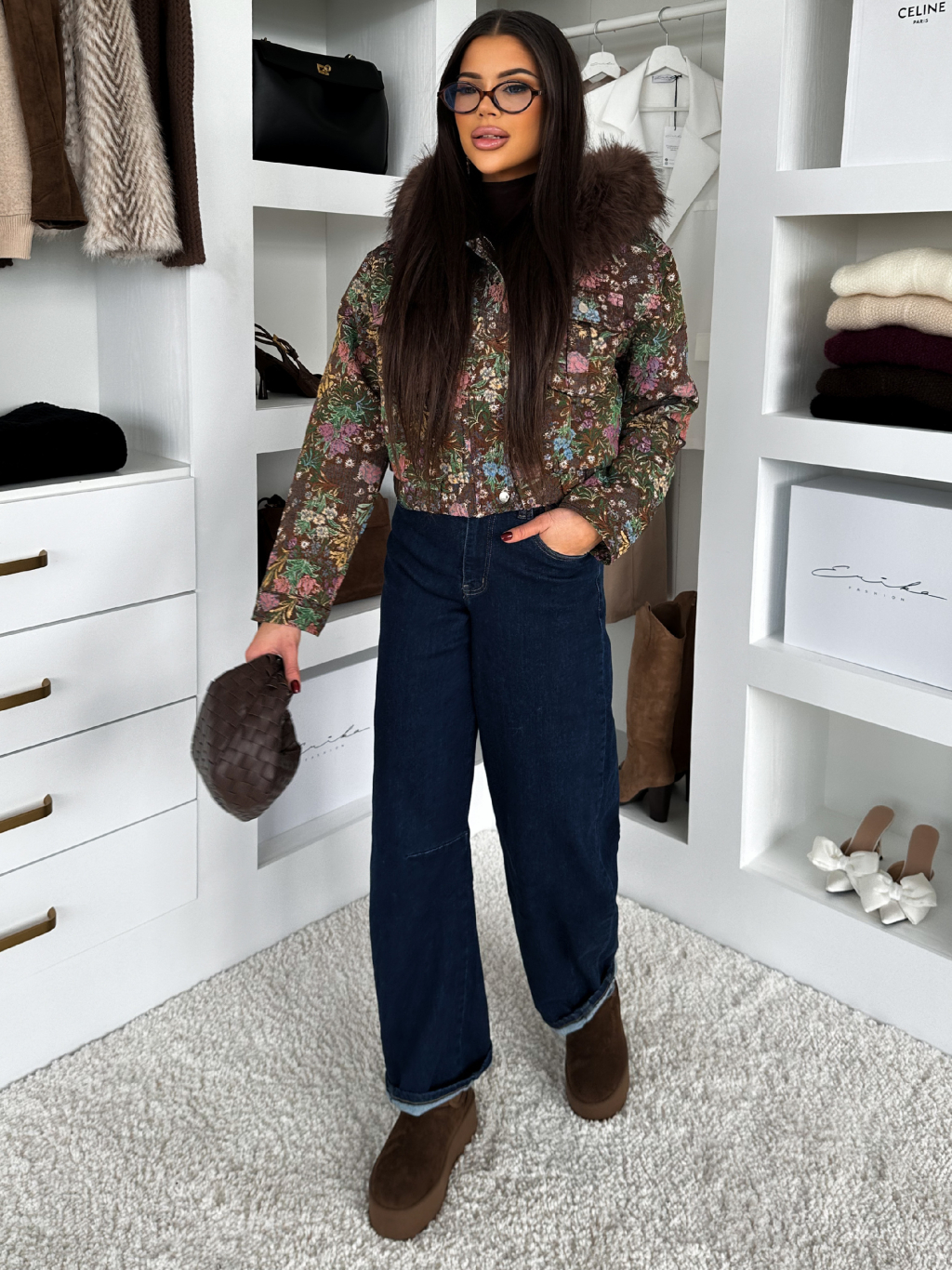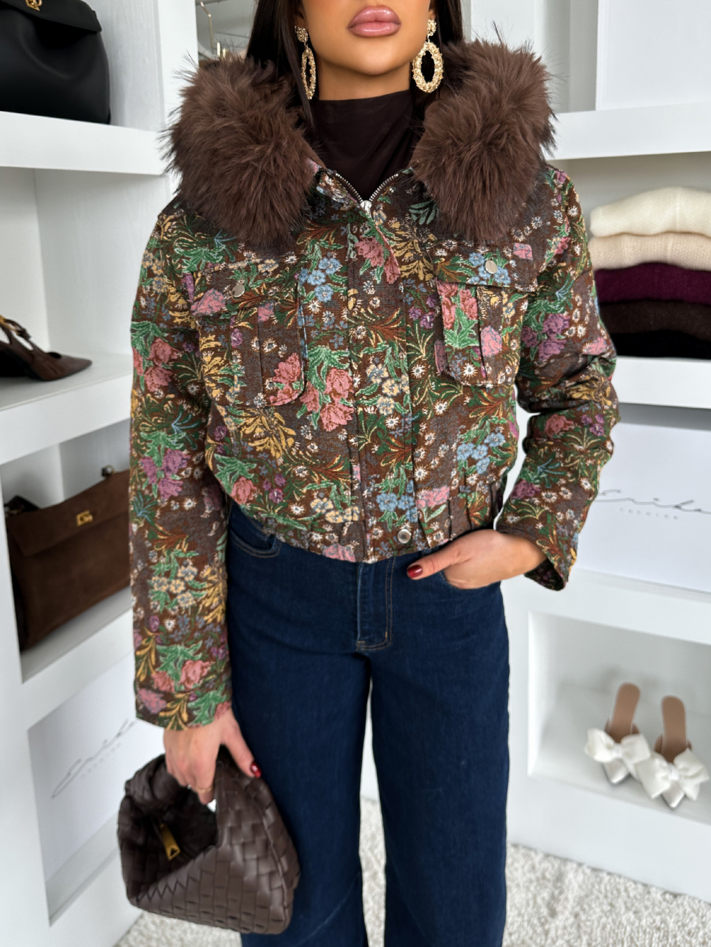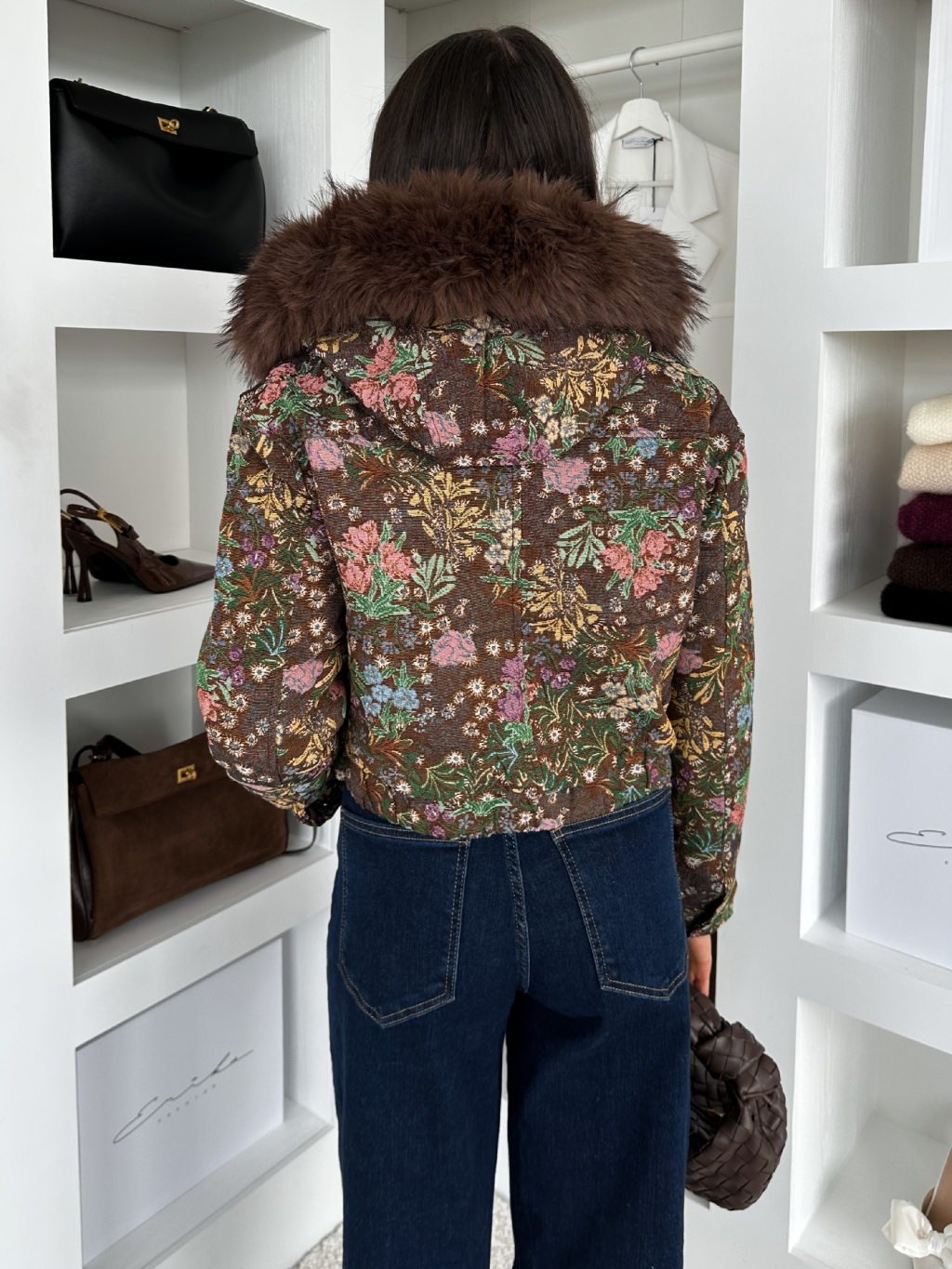Hnědá prošívaná bunda MORIVEN s malými květy