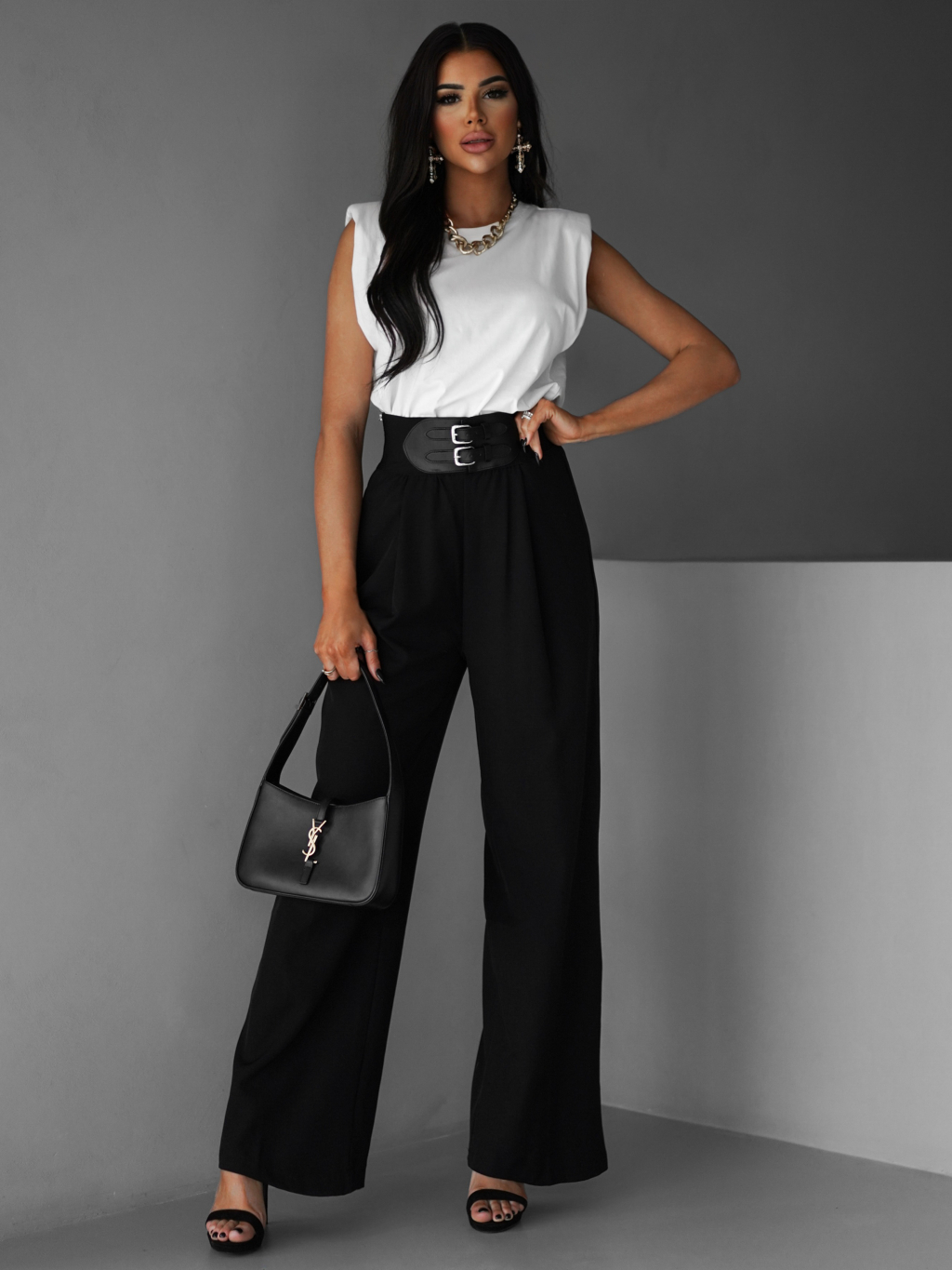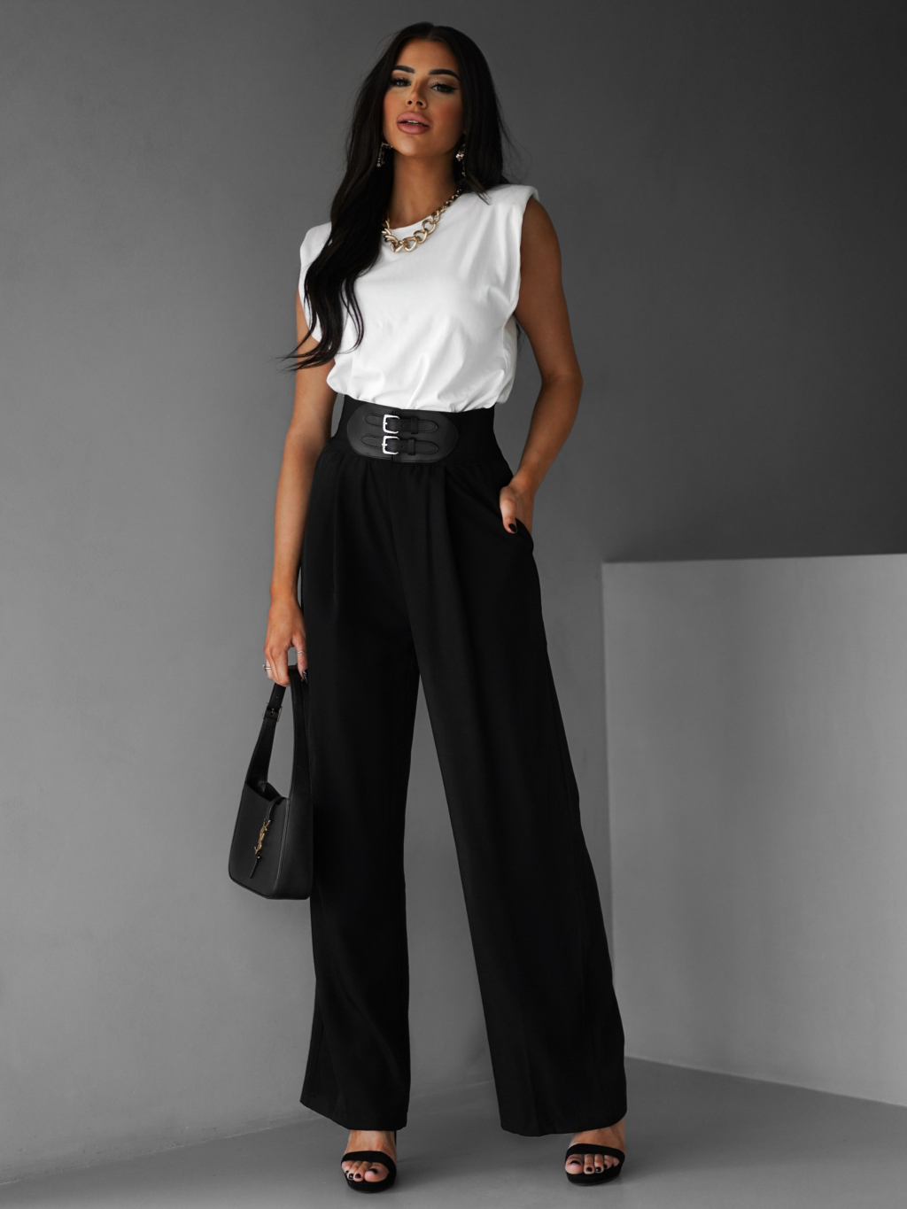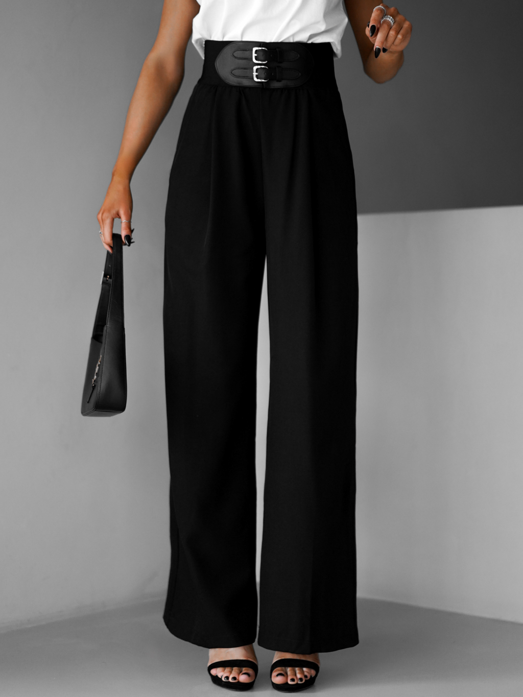Černé široké elegantní kalhoty DONATELLA s páskem