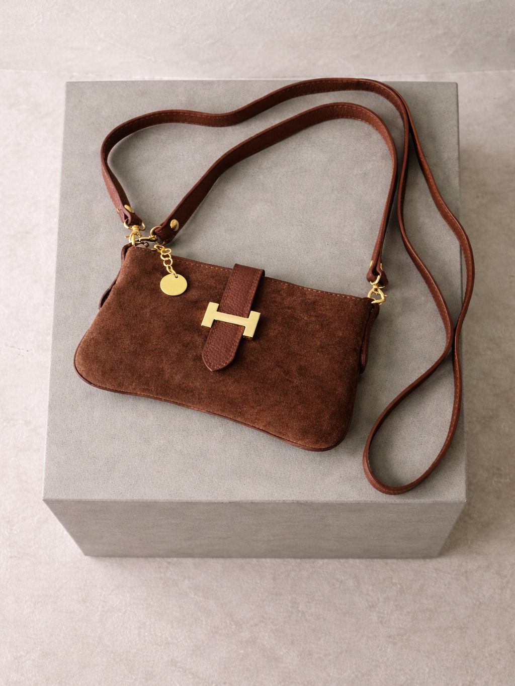 Tmavě hnědá kožená cross body semišová kabelka DUSELLA