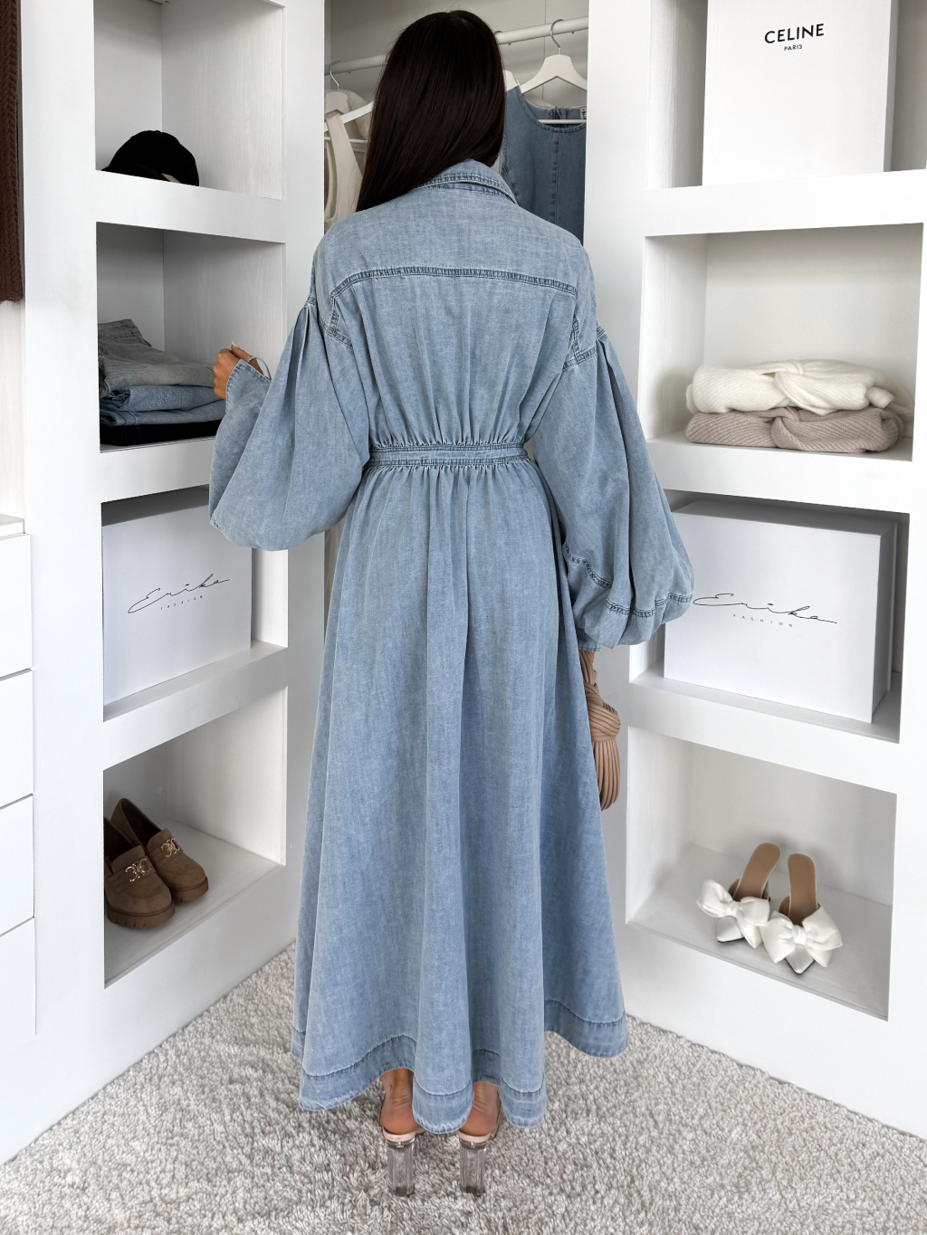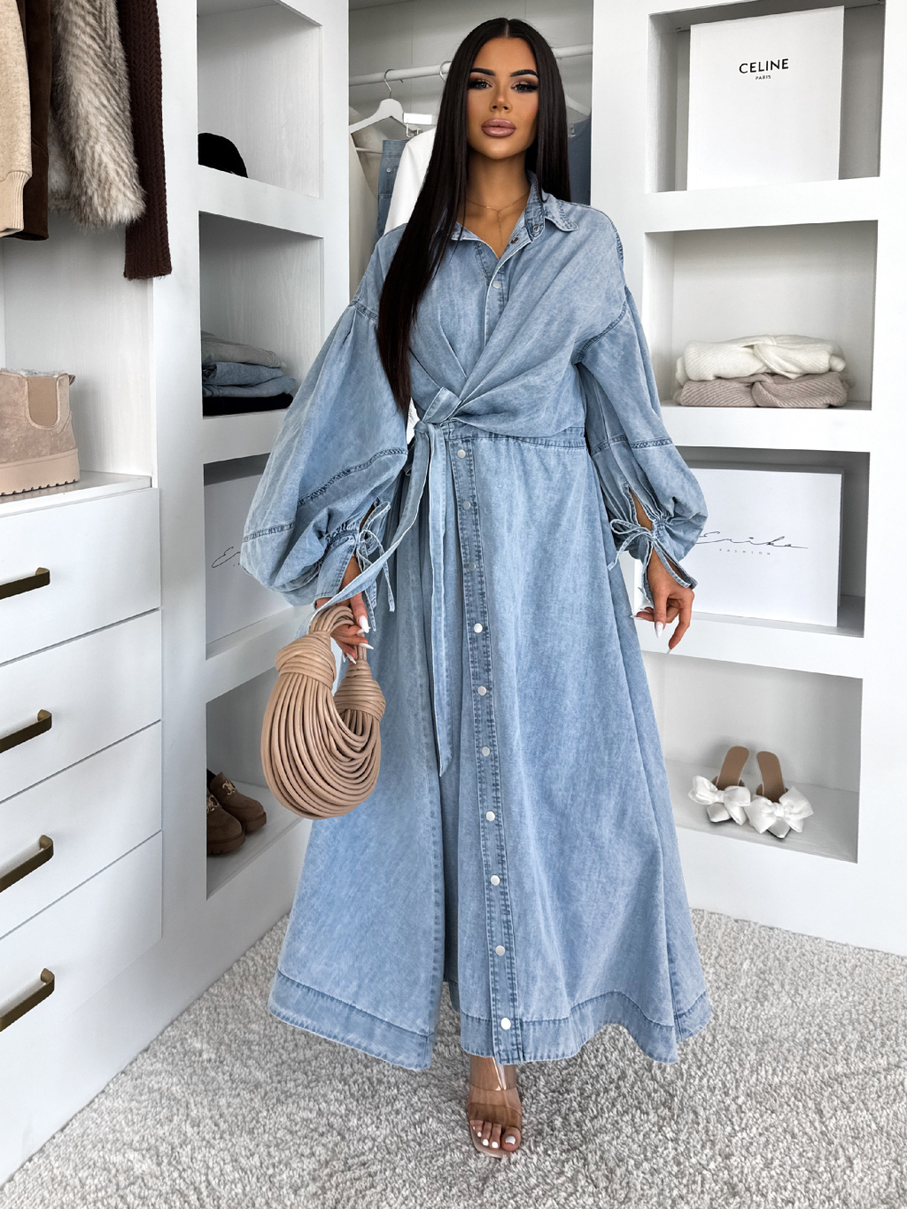 Modré džínové maxi šaty VYLARA s dlouhým rukávem