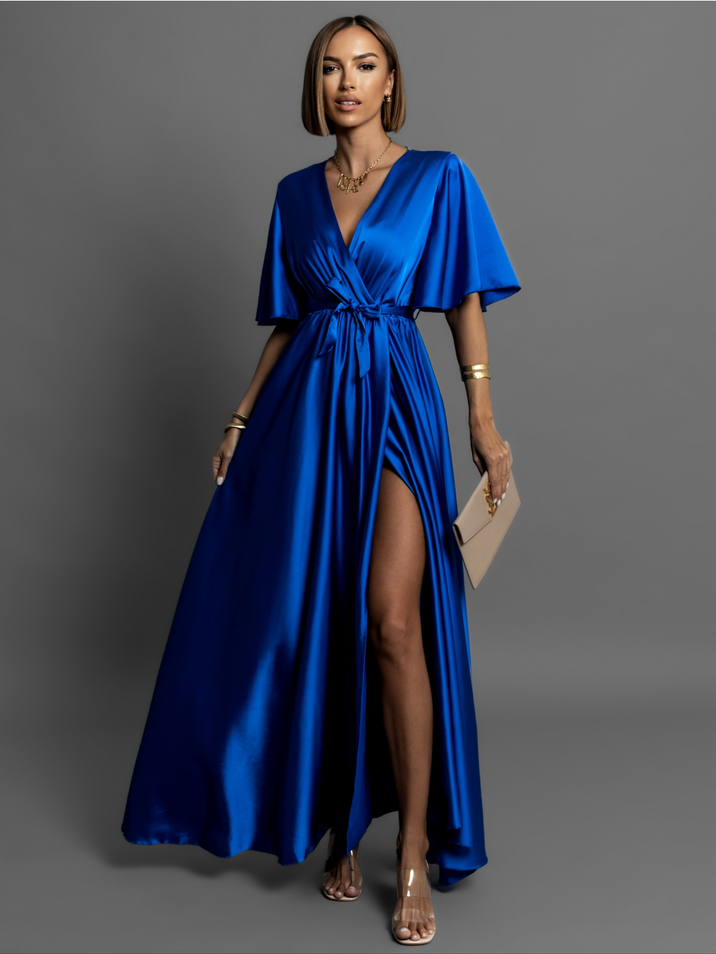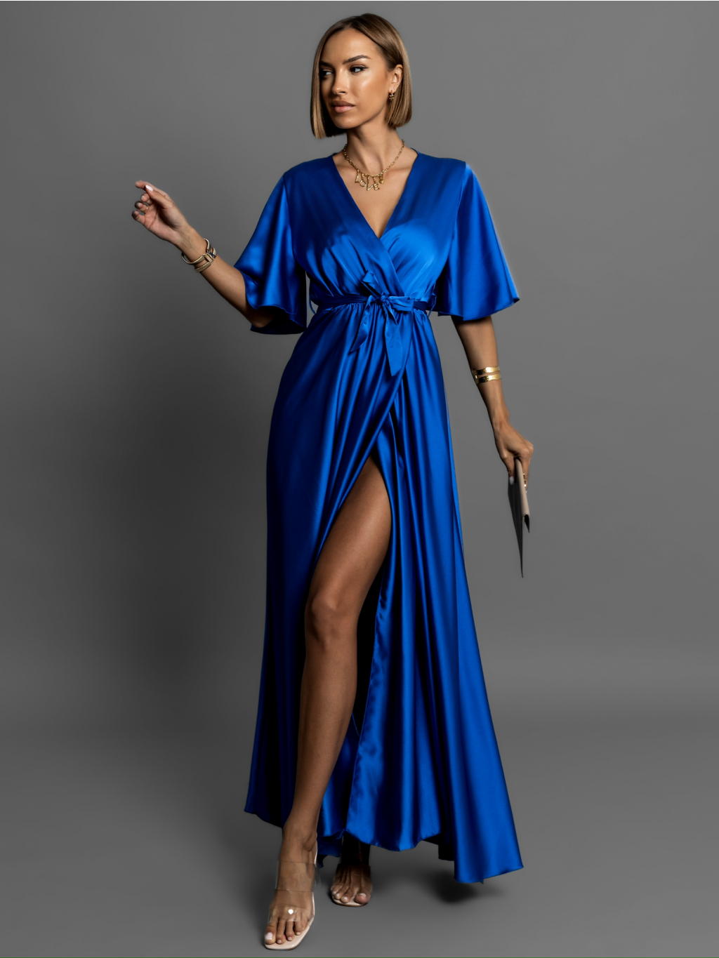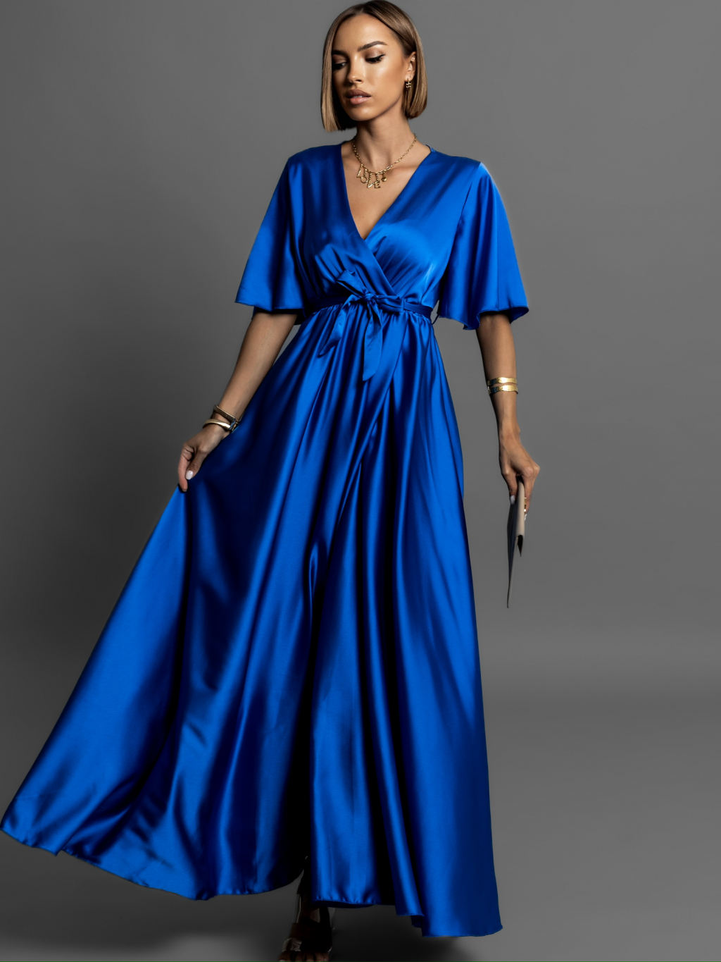 Královsky modré saténové dlouhé šaty GO HOME s krátkým rukávem