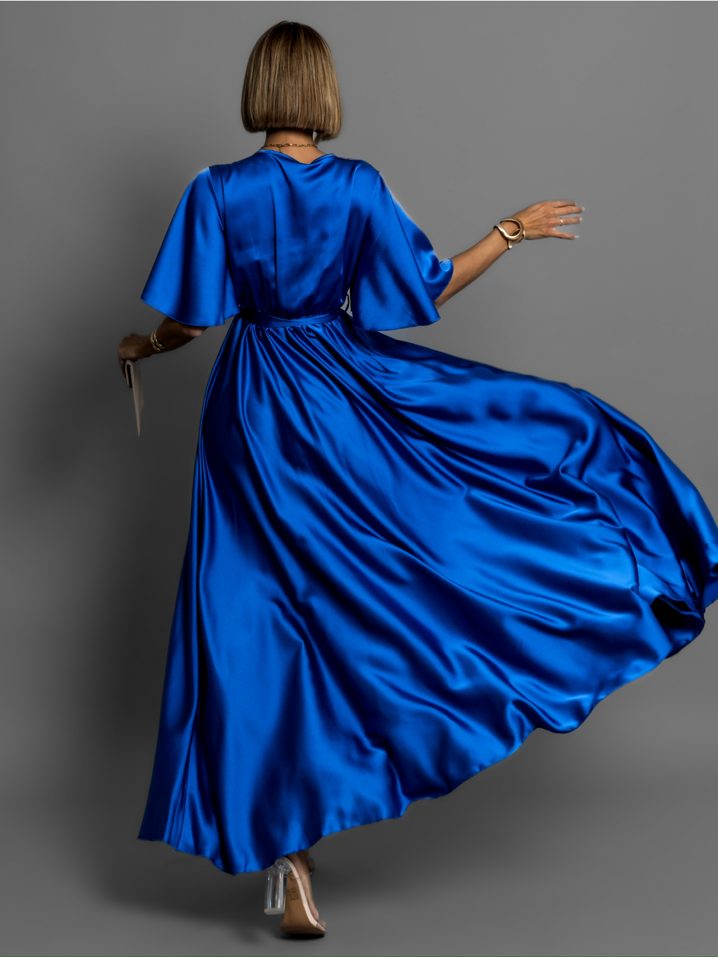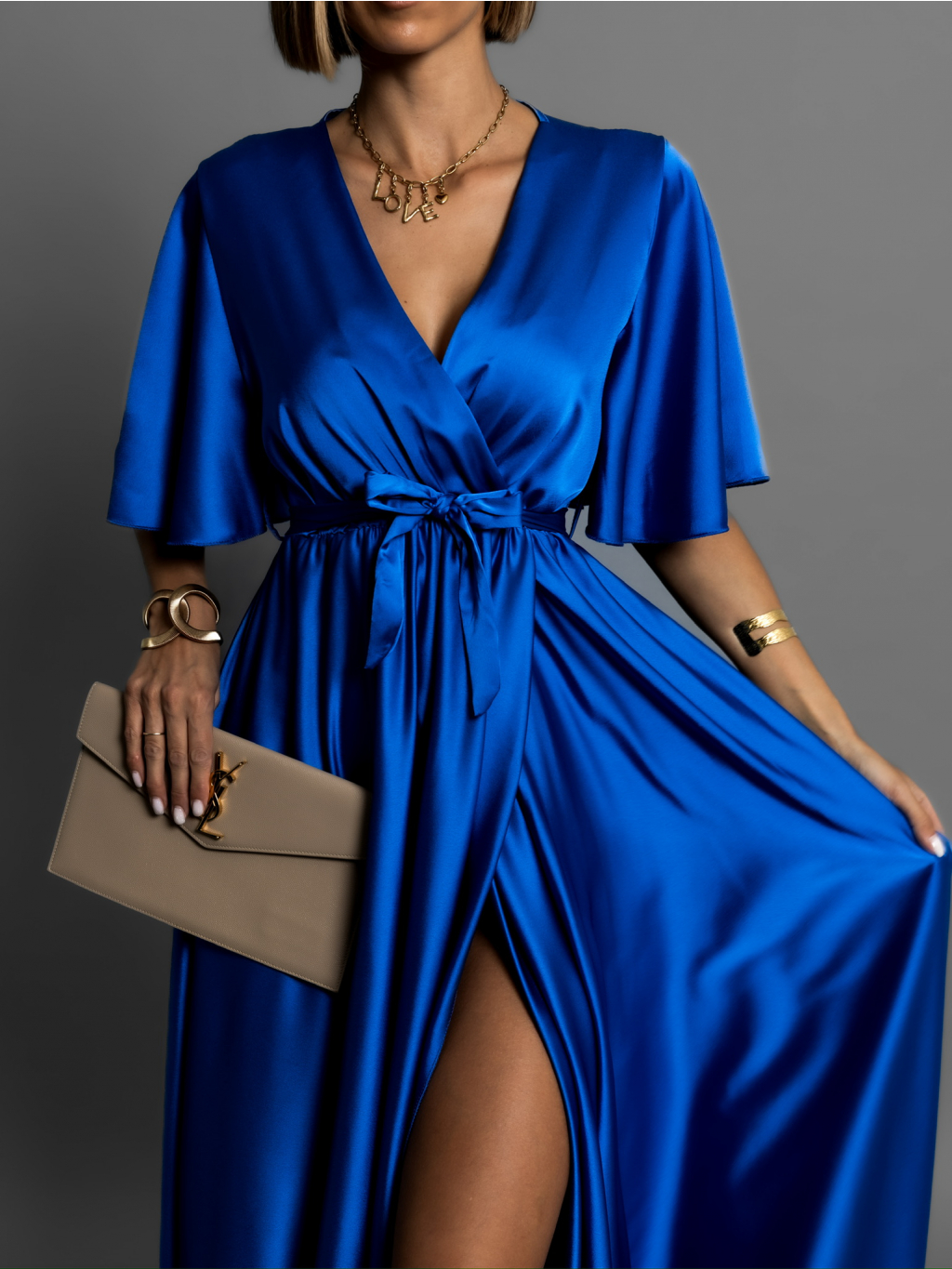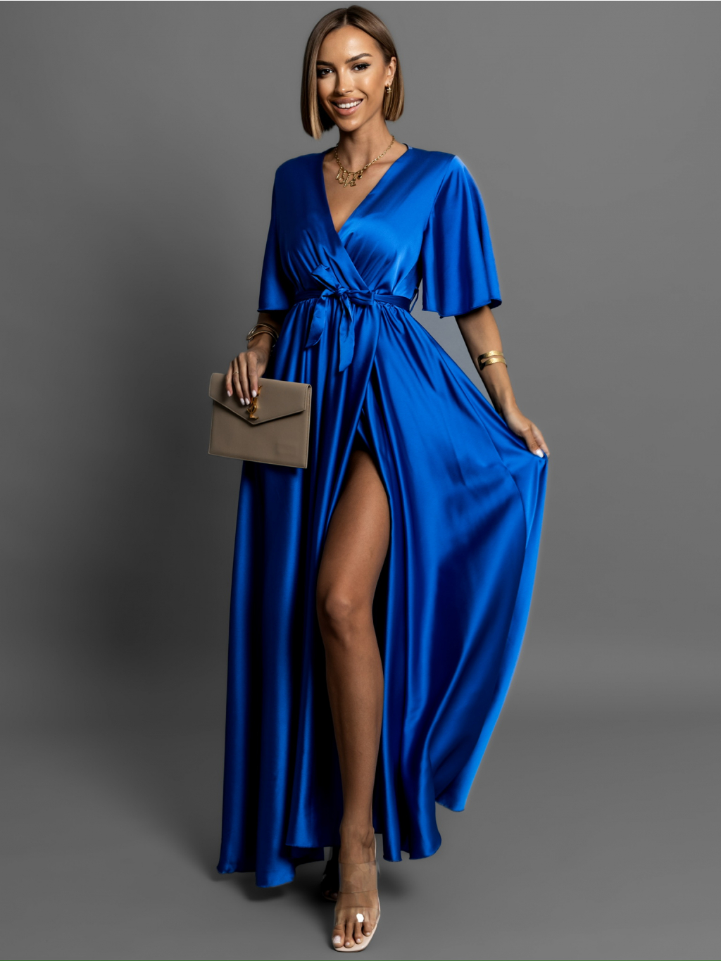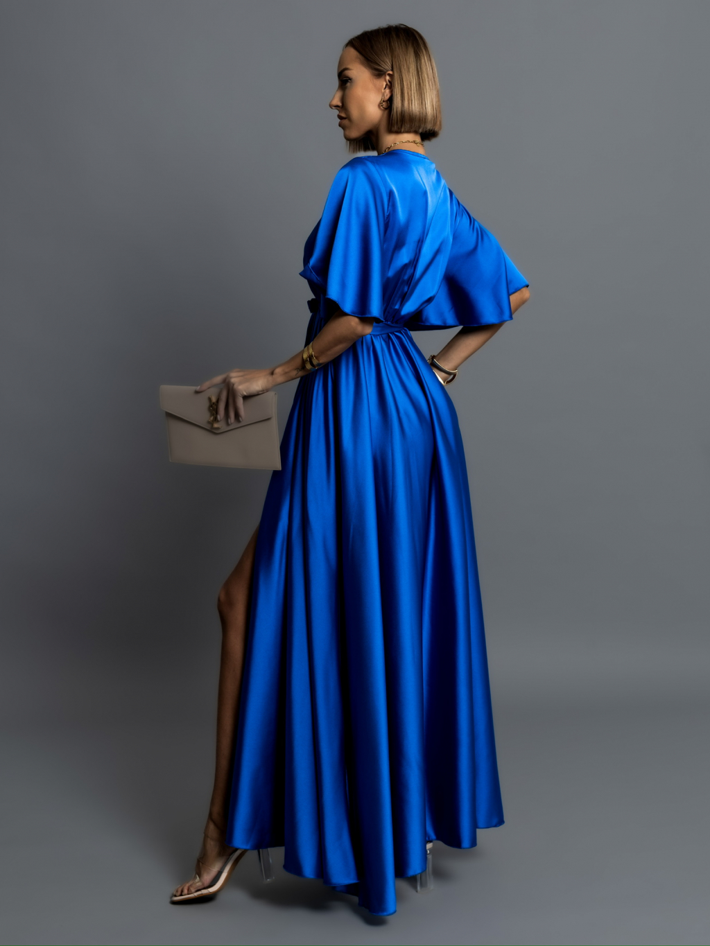 Královsky modré saténové dlouhé šaty GO HOME s krátkým rukávem
