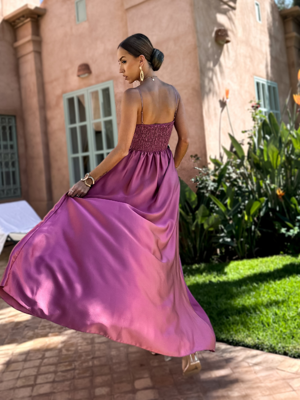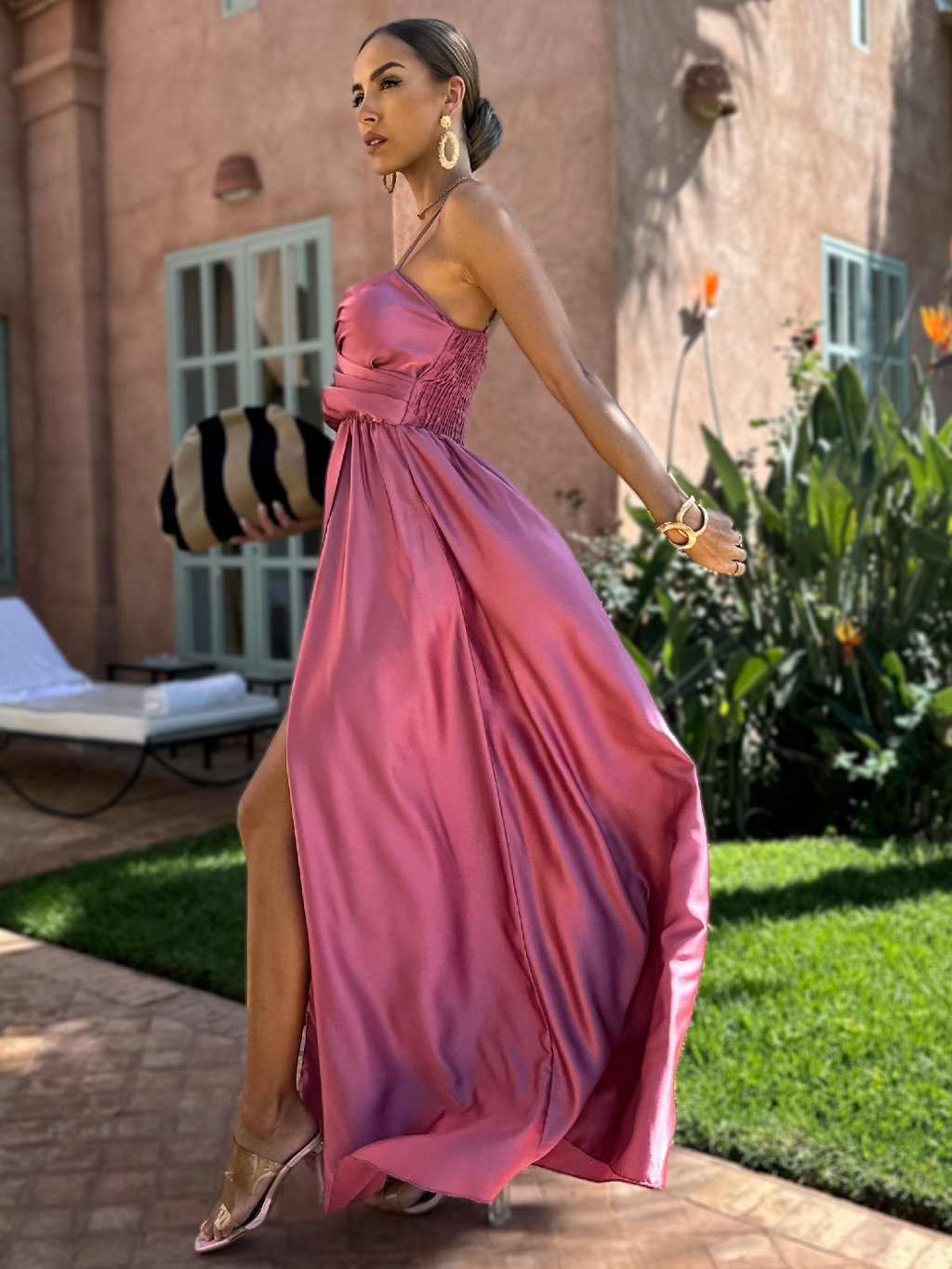 Malinové dlouhé saténové společenské šaty PATILLA s rozparkem