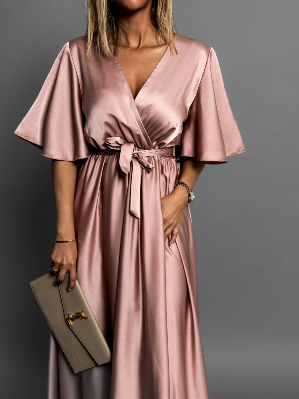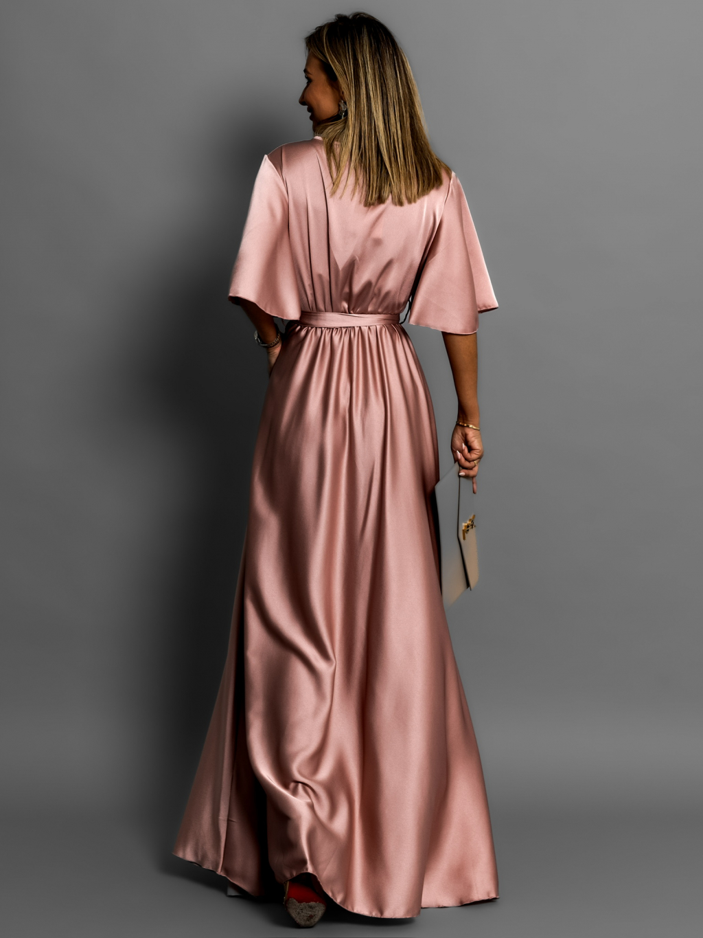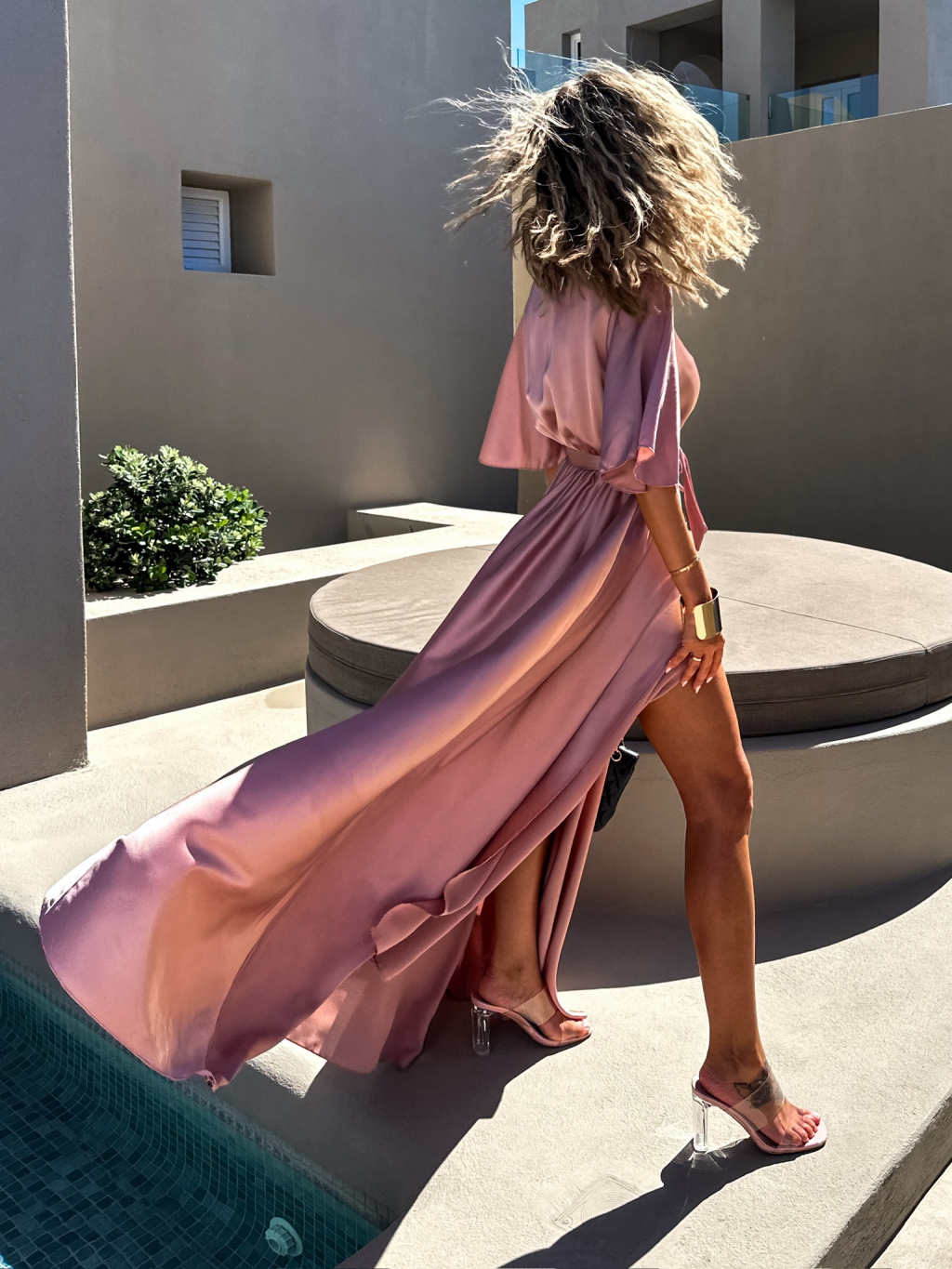 Starorůžové dlouhé saténové šaty GO HOME s krátkým rukávem