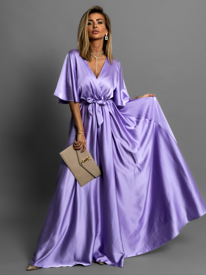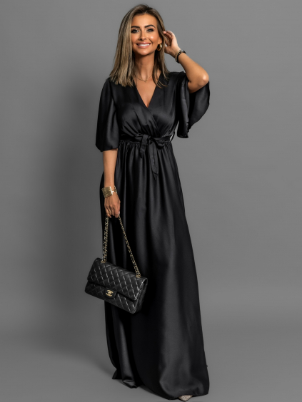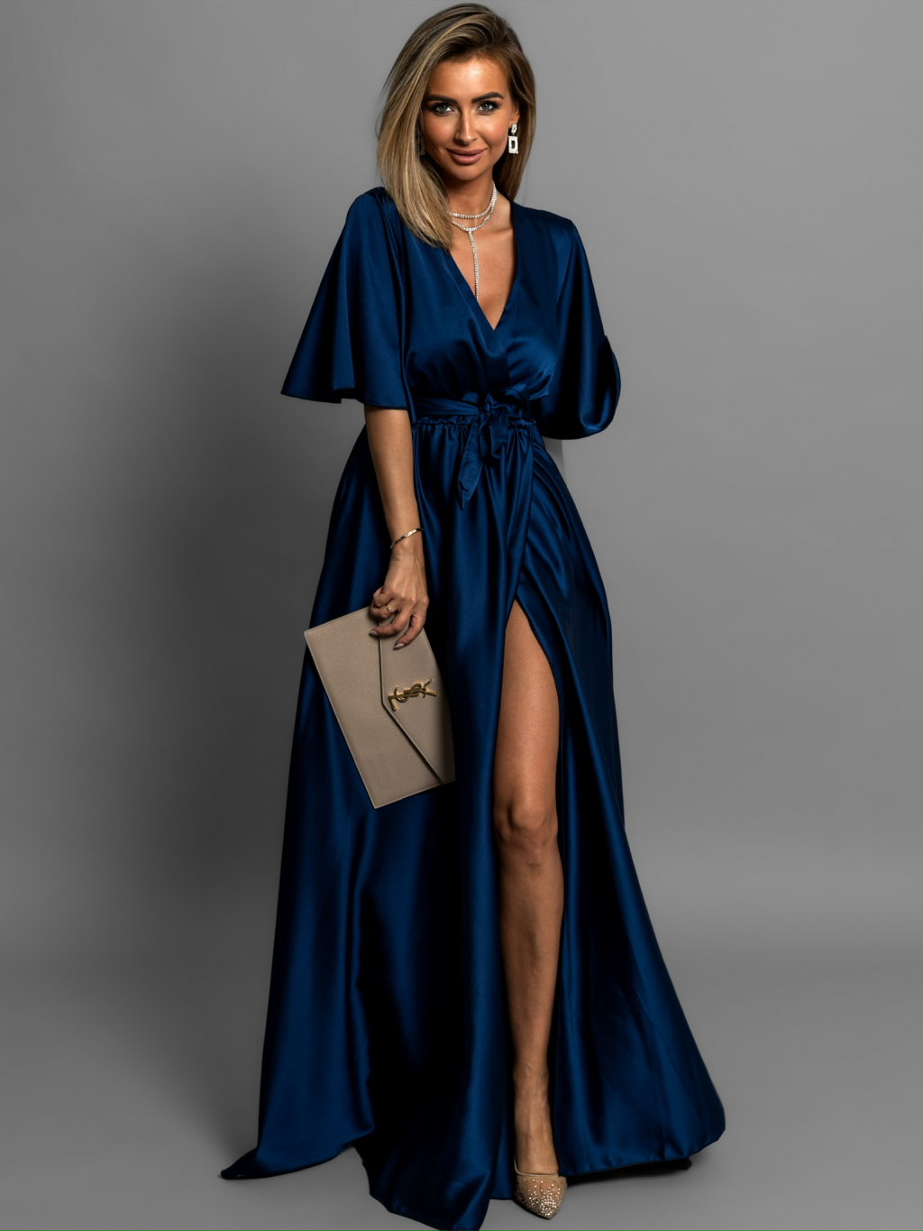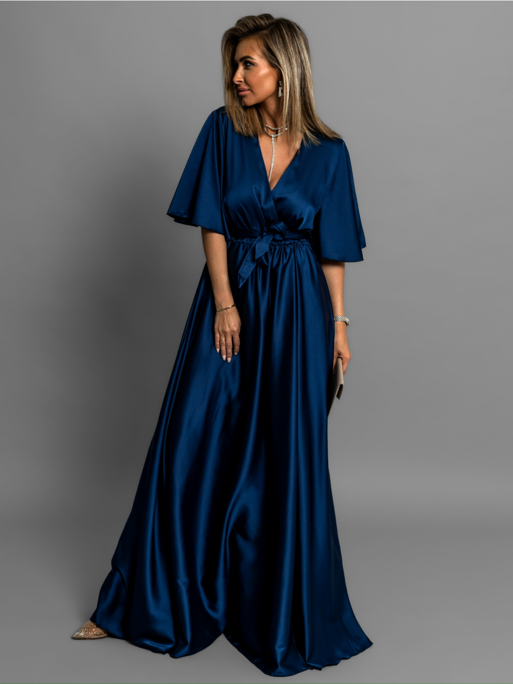 Tmavě modré saténové dlouhé šaty GO HOME s krátkým rukávem