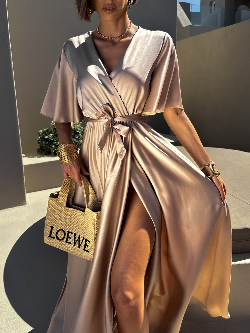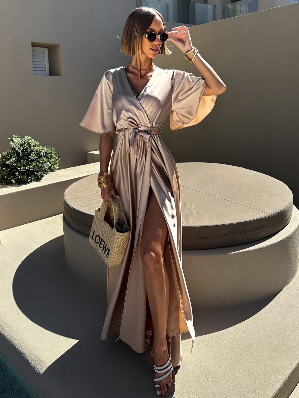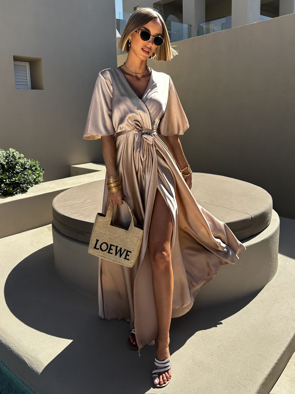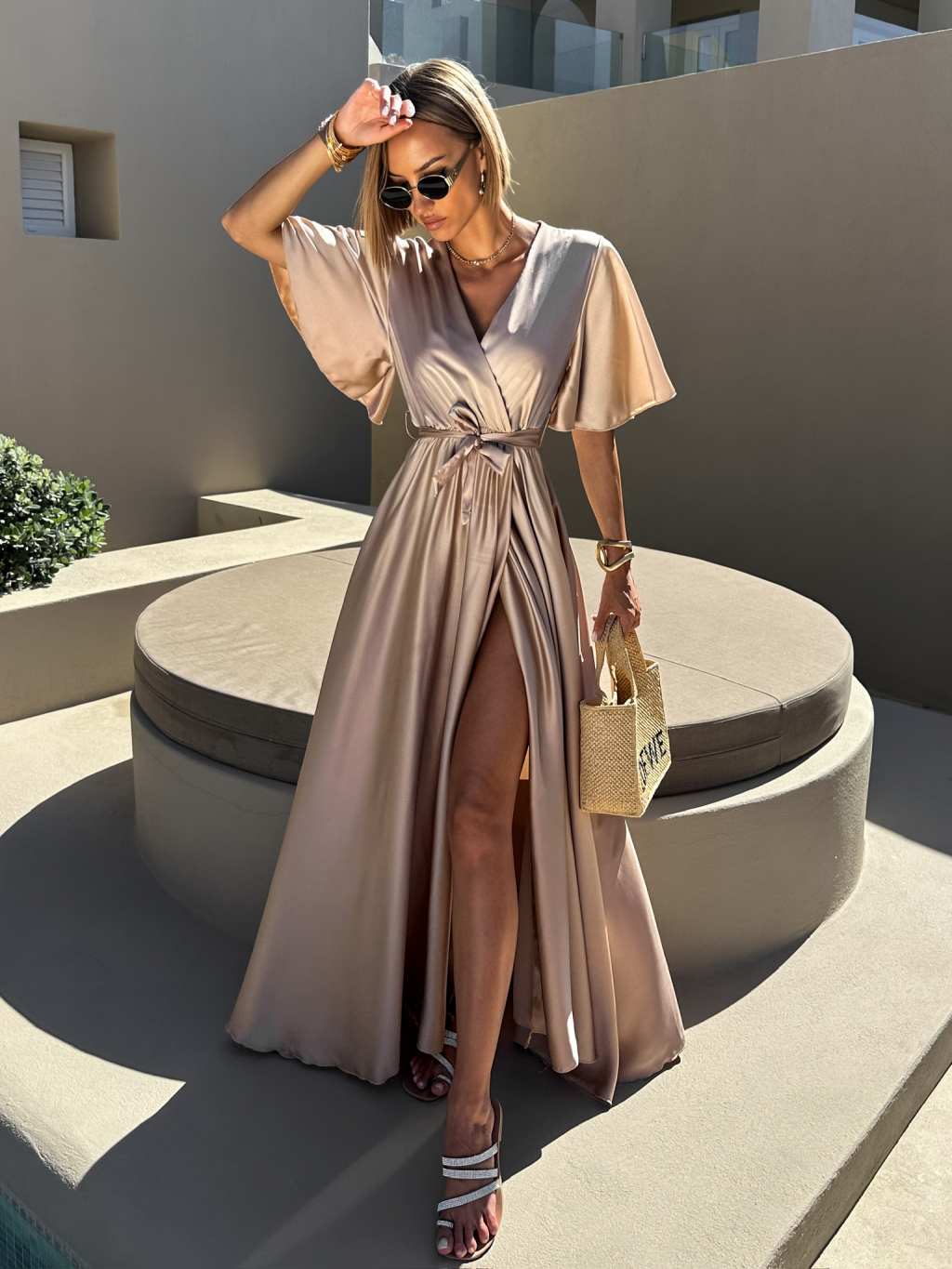 Zlaté saténové dlouhé šaty GO HOME s rozparkem