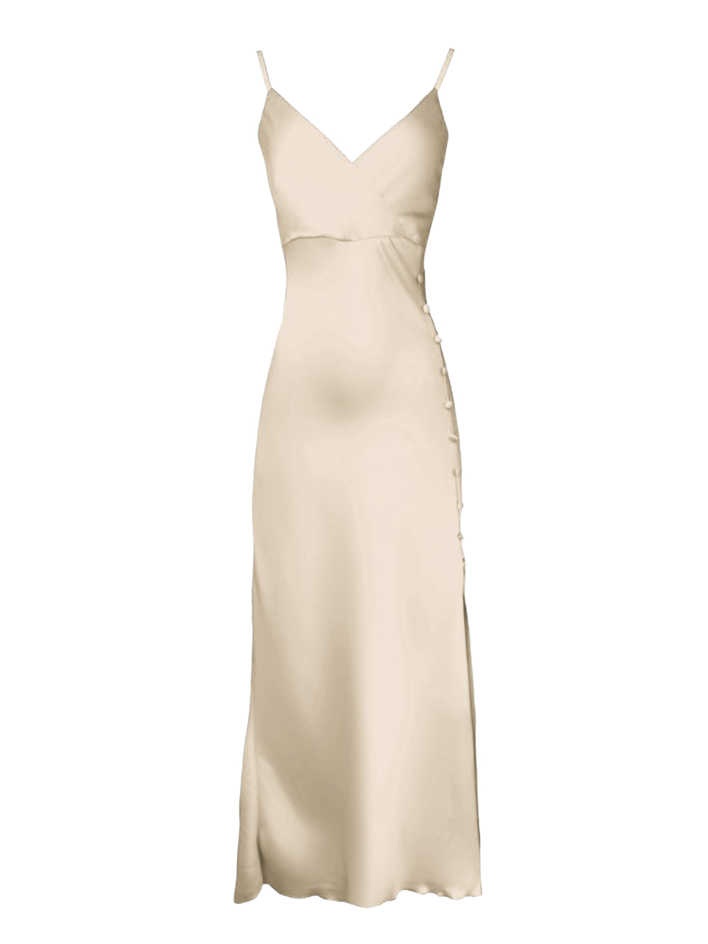 Béžové dlouhé lesklé šaty MOSES s rozparkem