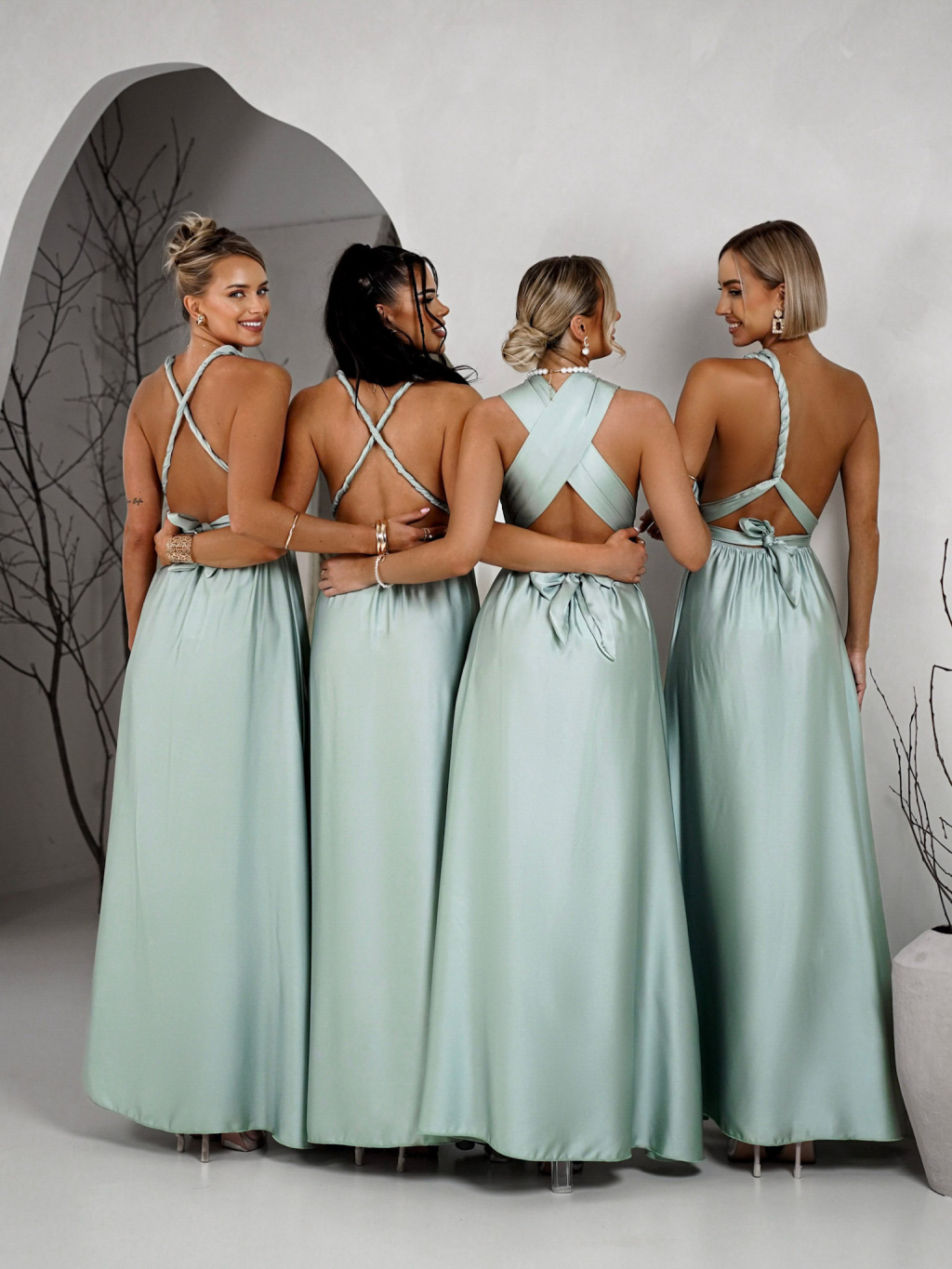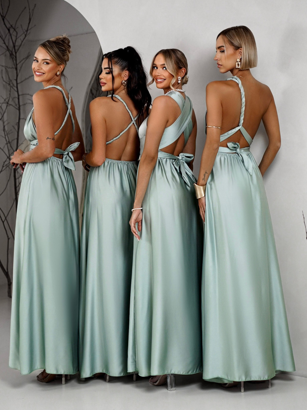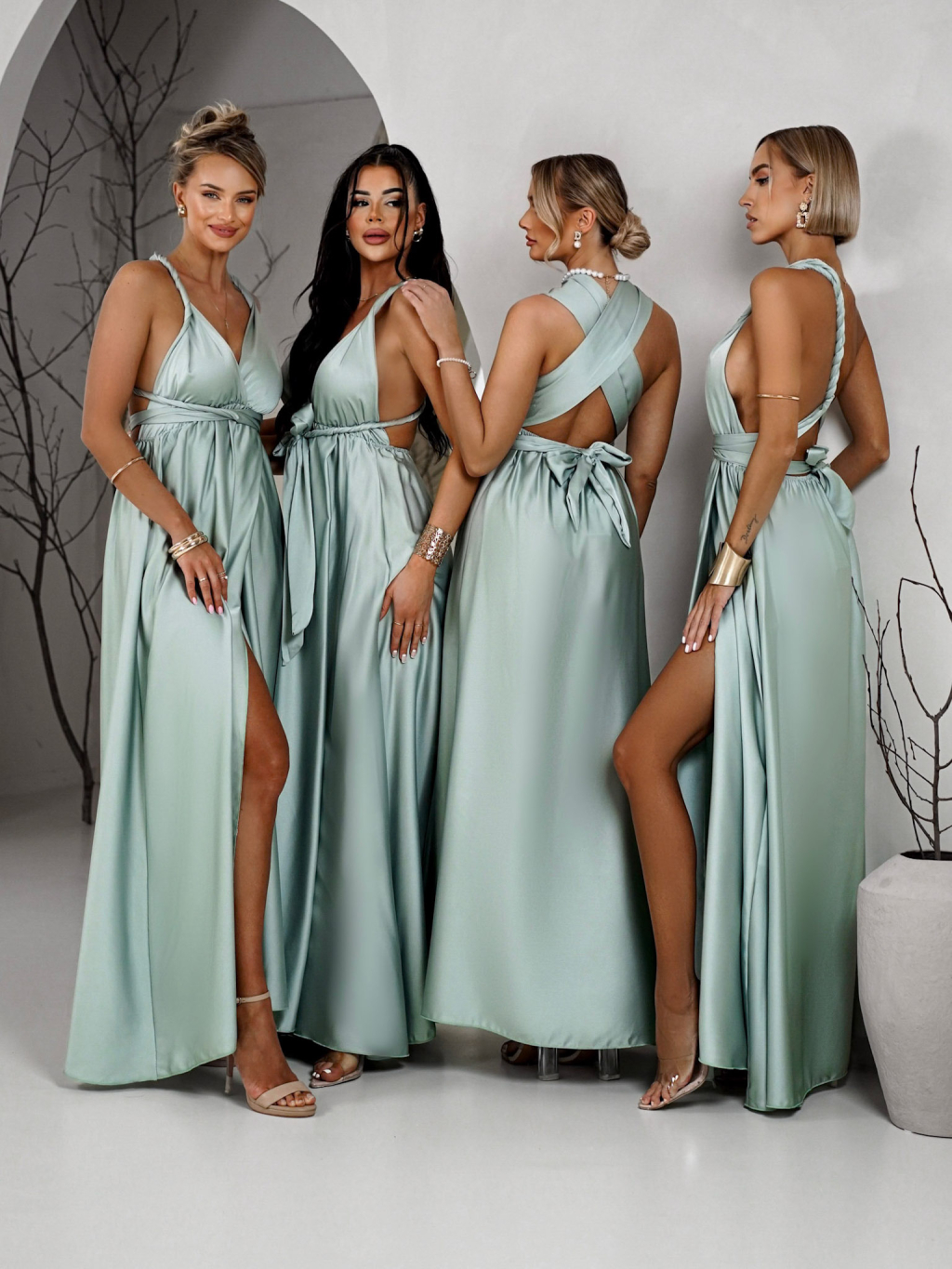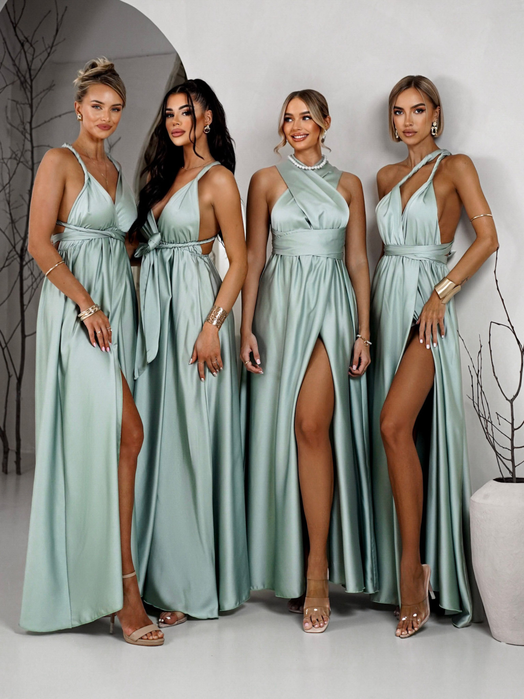 Světle zelené zavinovací šaty VALERDI pro družičky s variabilním vázáním a rozparkem
