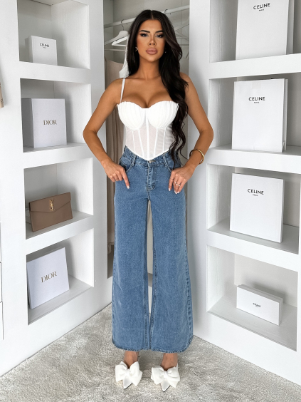 Modré stylové široké wide leg džíny TRINHA s perličkami