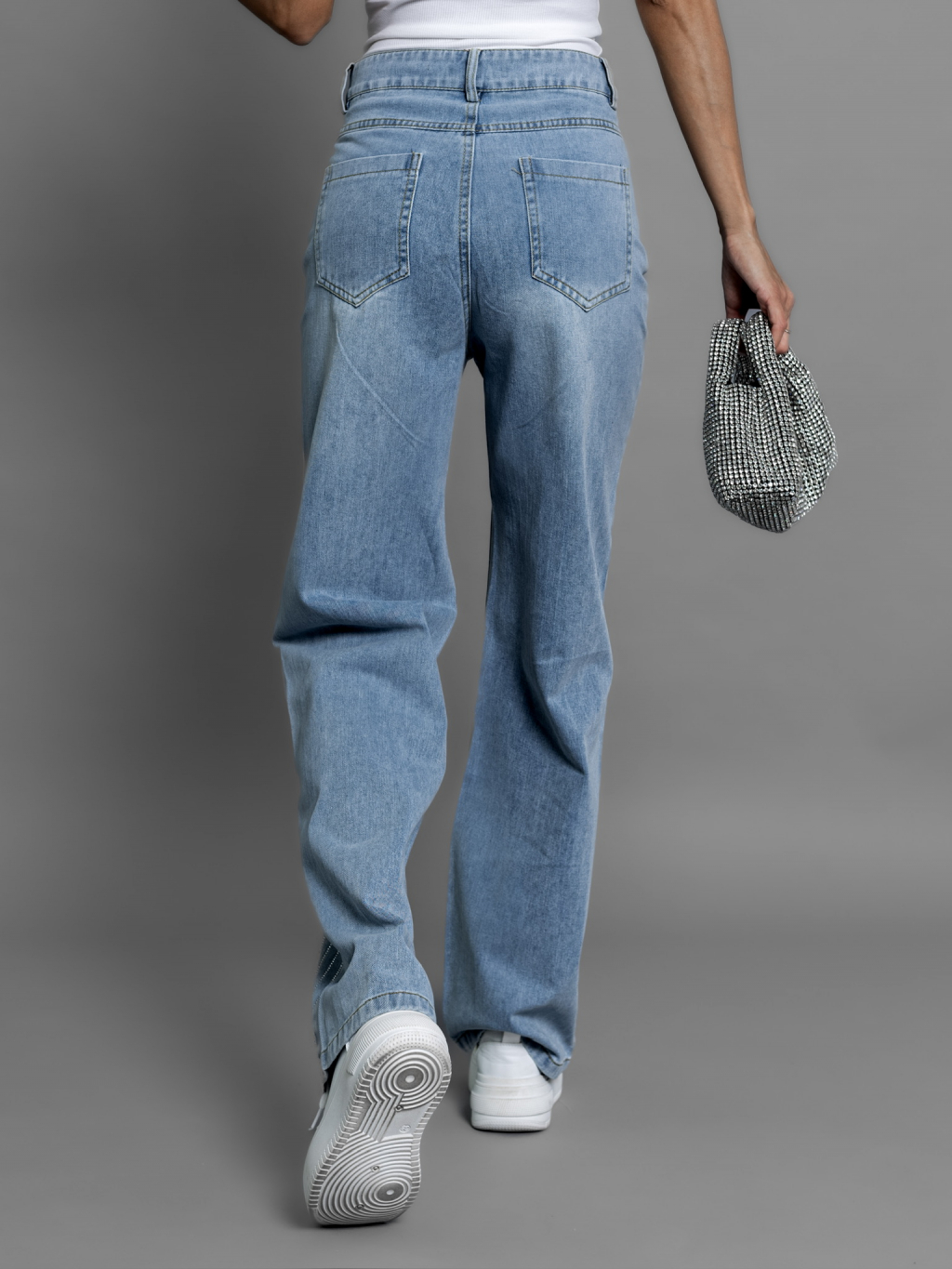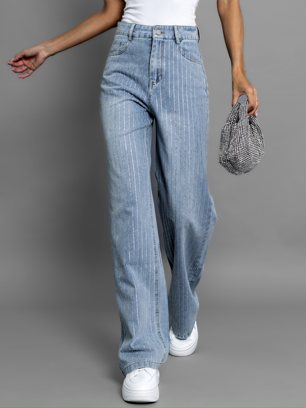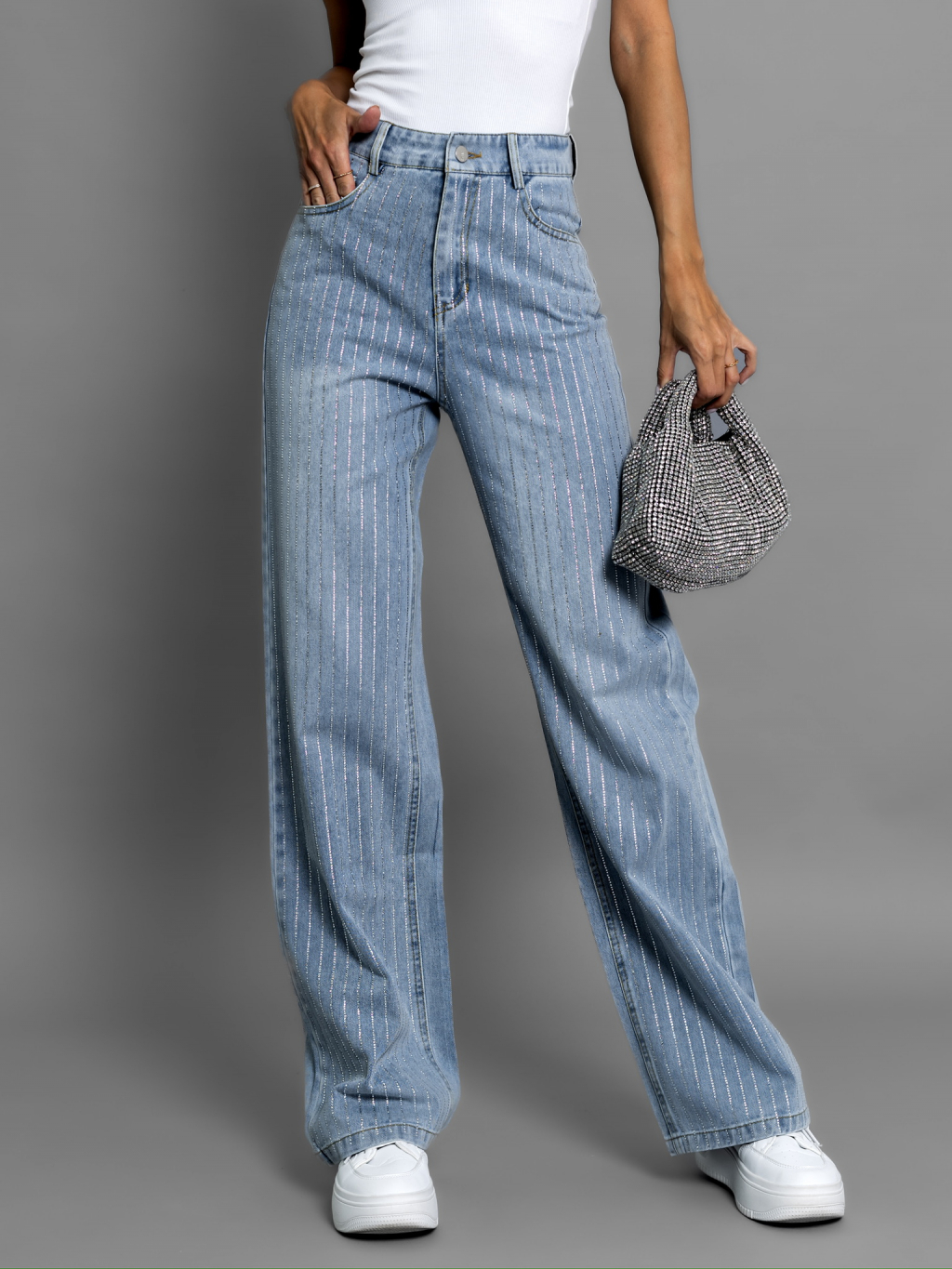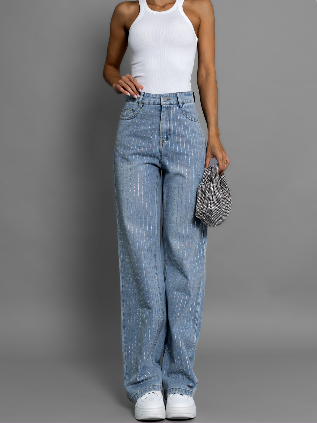 Modré třpytivé wide leg široké džíny MIRKO s kamínky