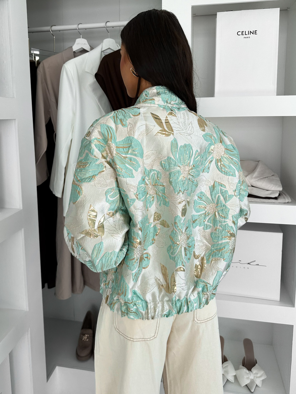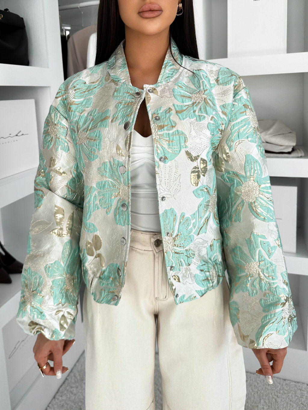 Mentolová krátká prošívaná bundička LIKORA s květinovým vzorem