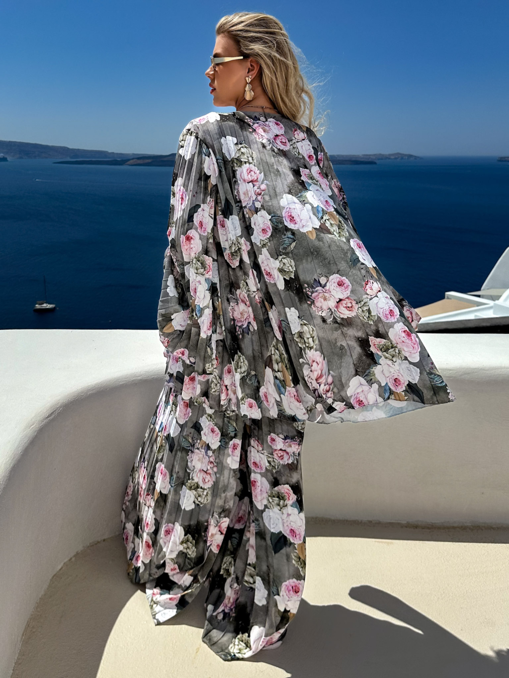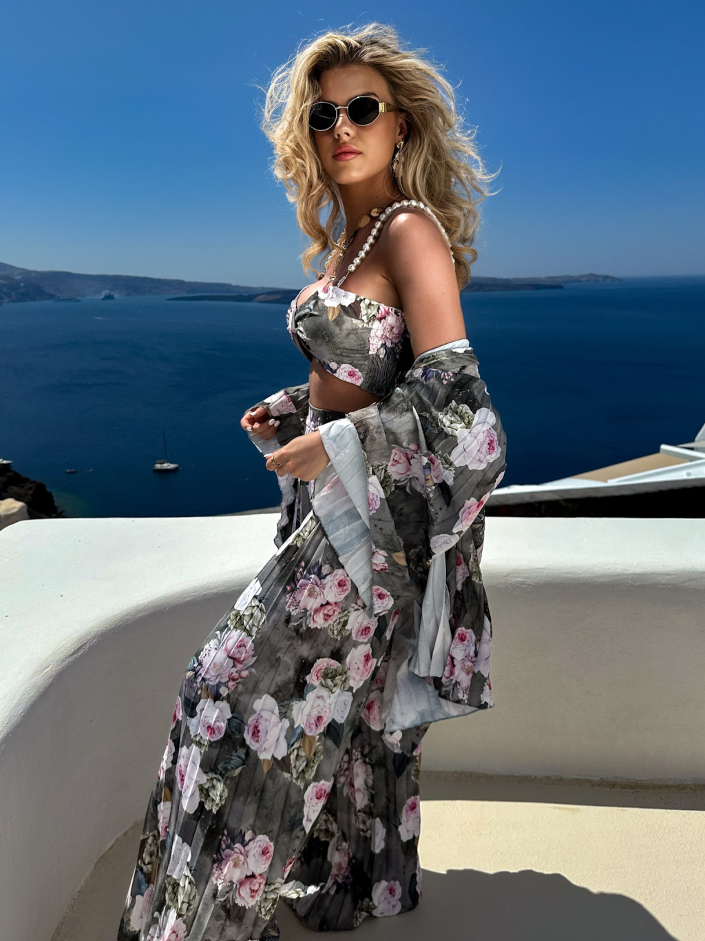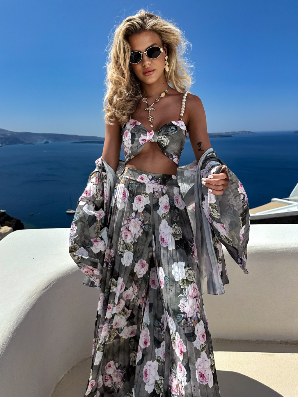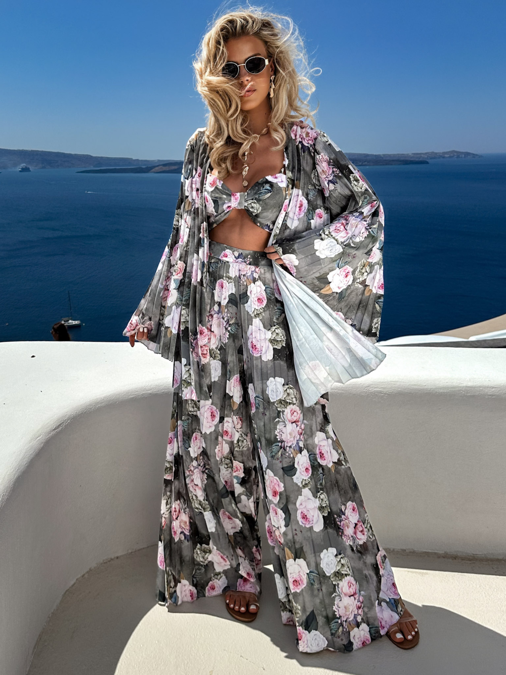 Khaki květinový plisovaný stylový komplet FLOWERA