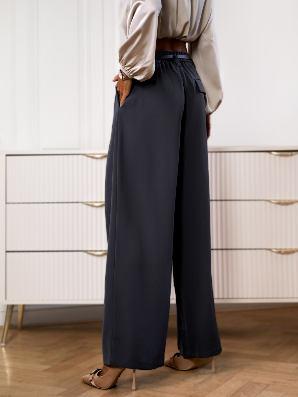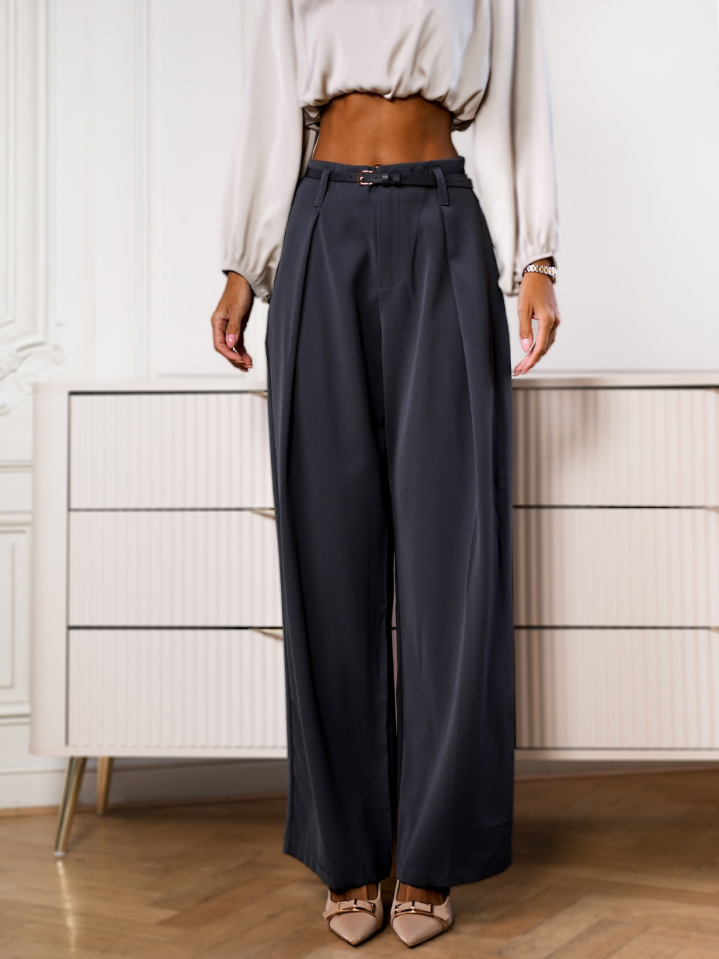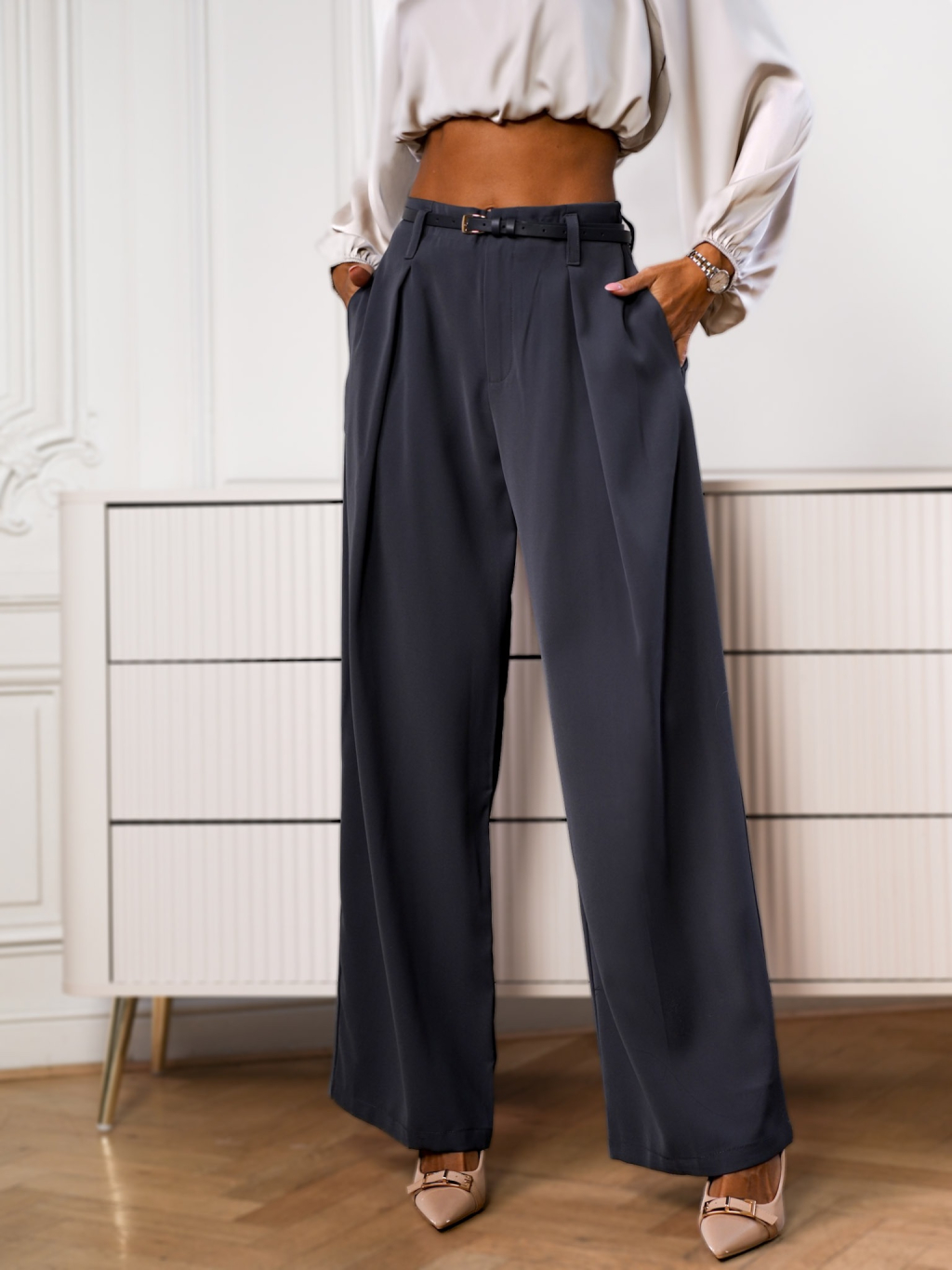 Šedé stylové kalhoty LAMEL s páskem