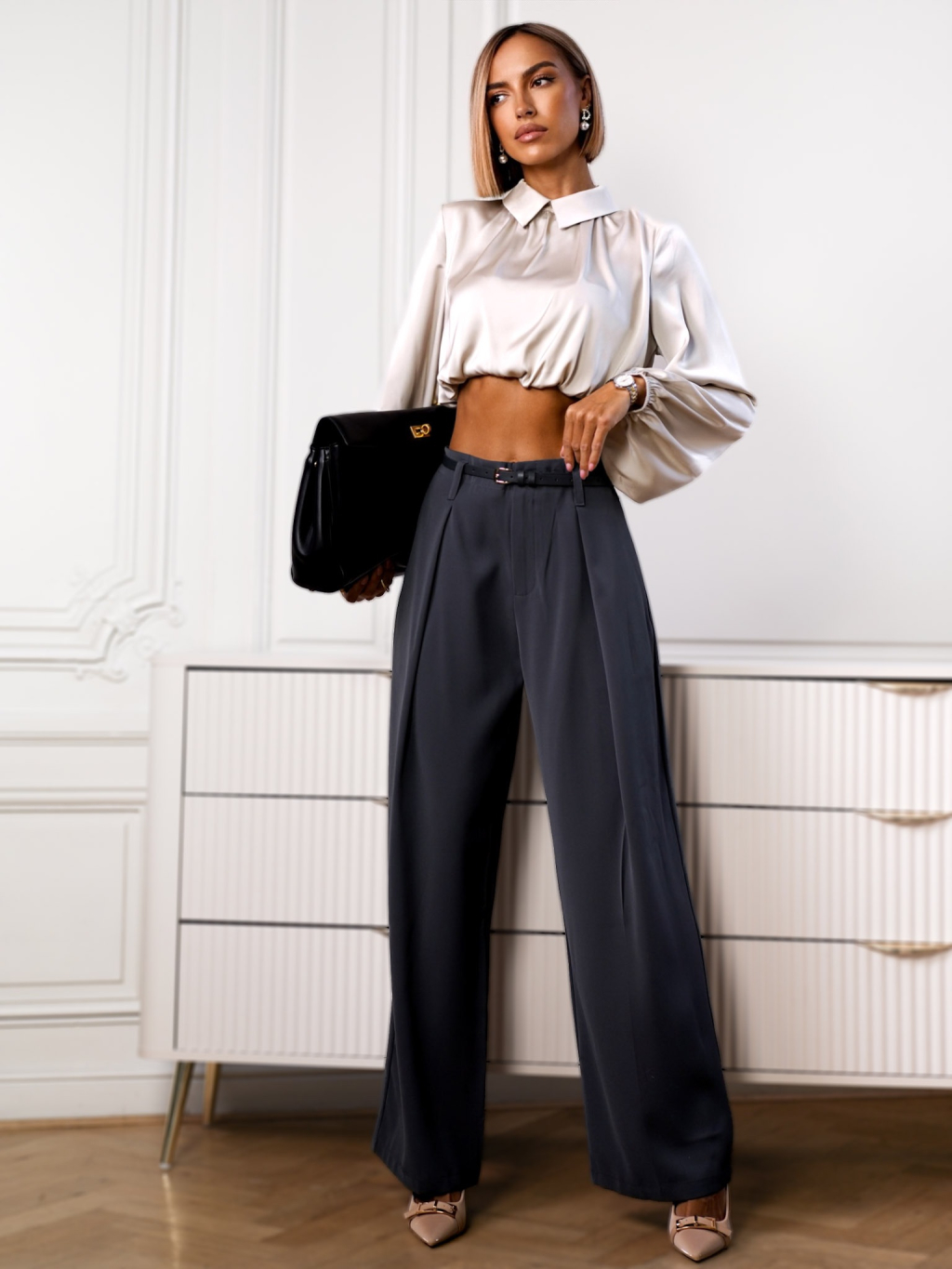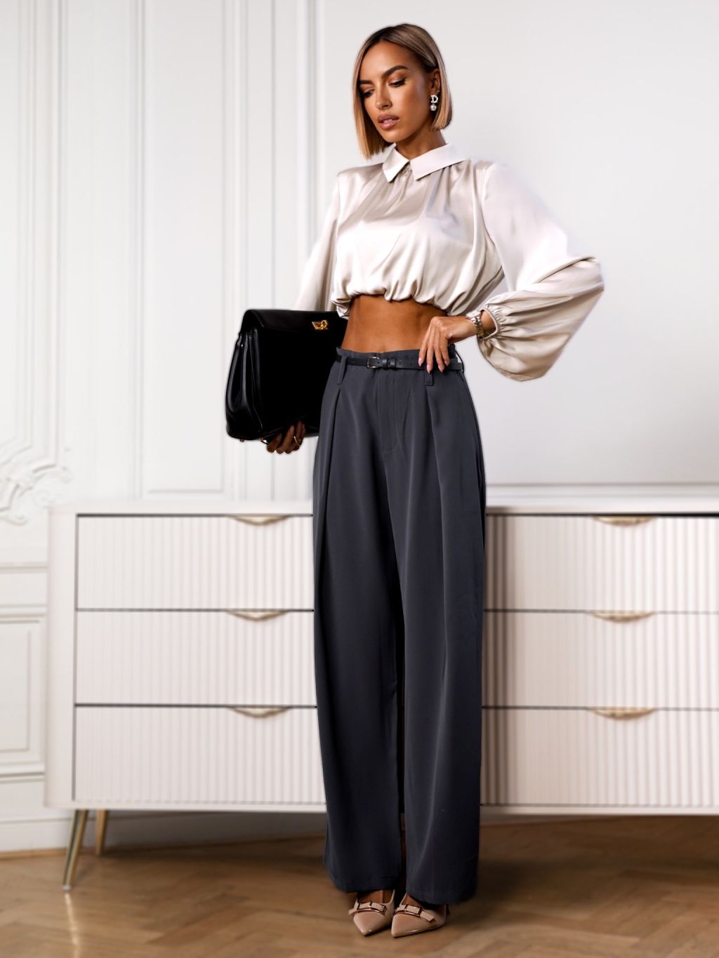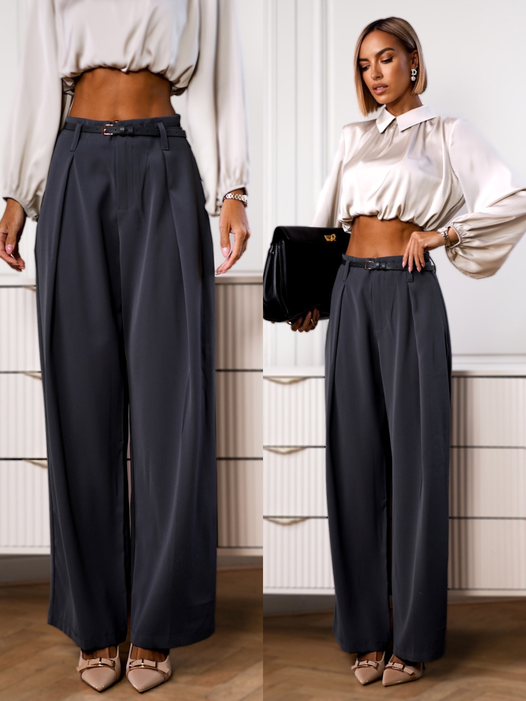 Šedé stylové kalhoty LAMEL s páskem