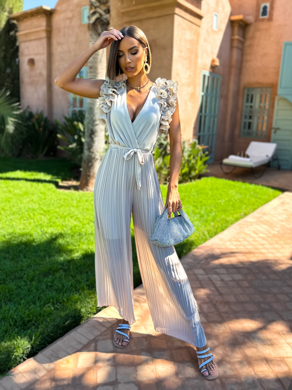 Béžový dlouhý plisovaný overal TAUTRIS s volánkovými rukávy