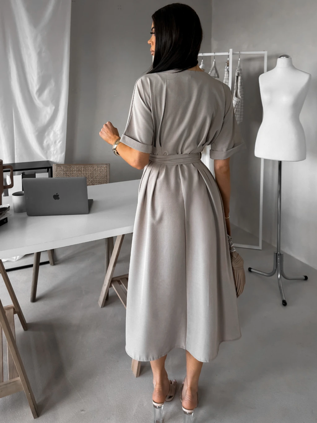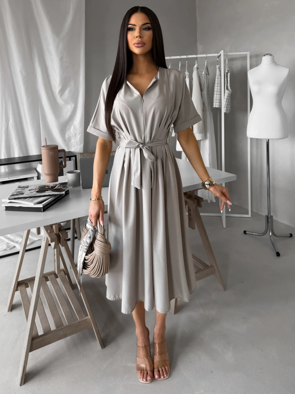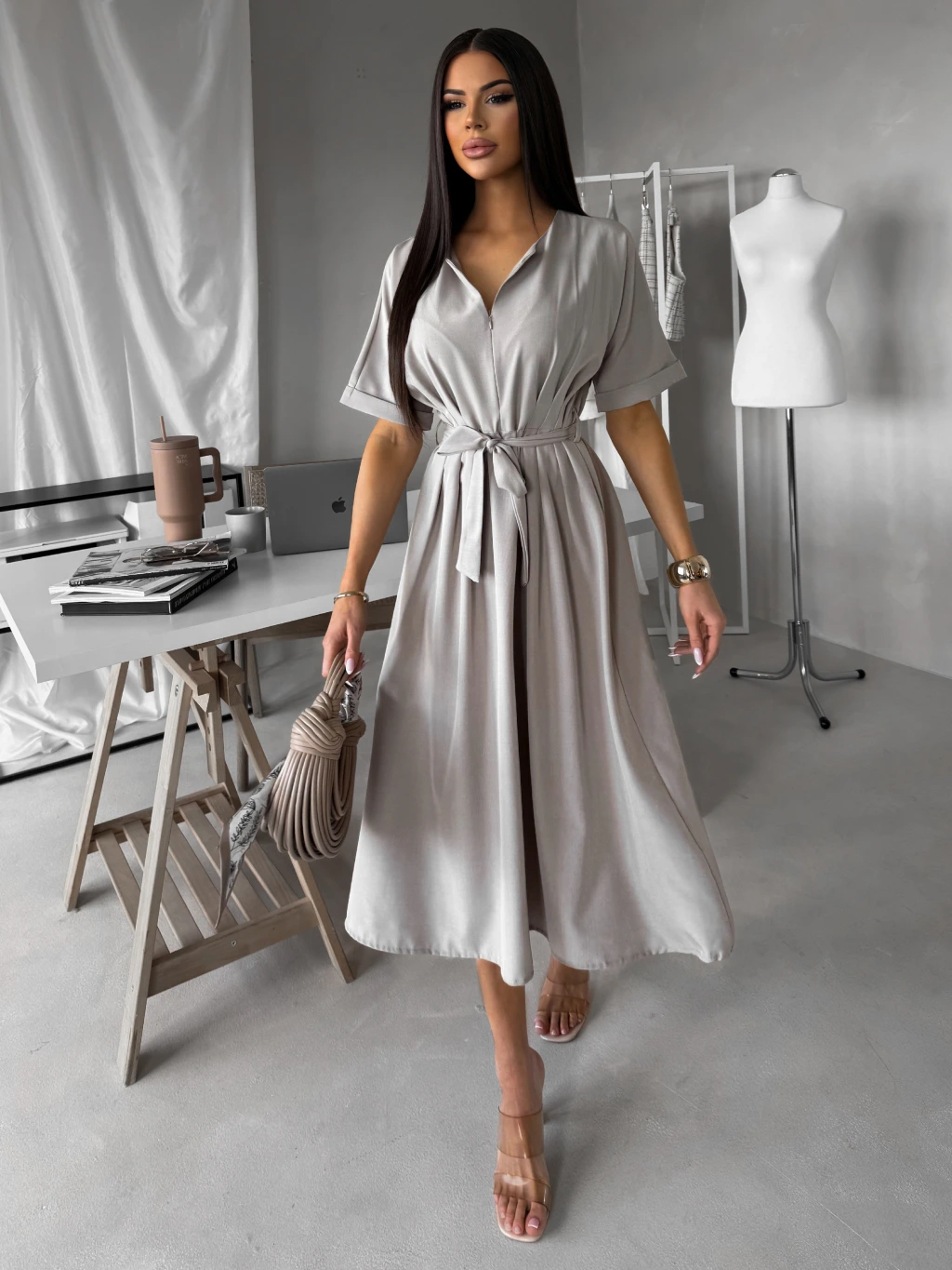 Béžovošedé košilové midi šaty YELONY s páskem