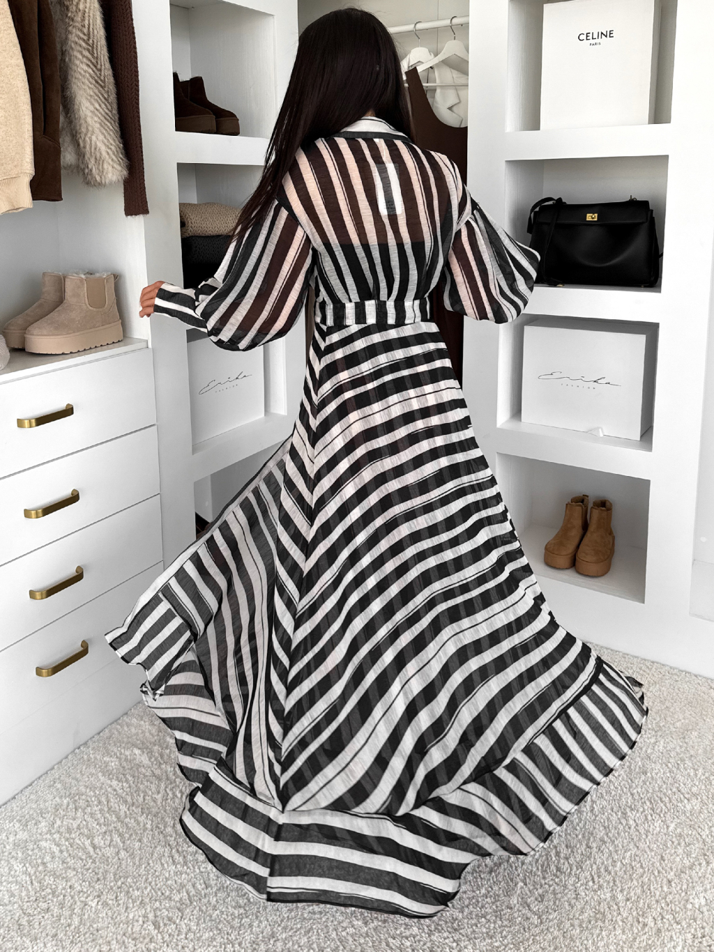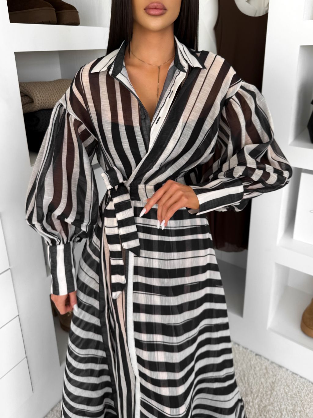 Černé pruhované dlouhé bavlněné zavinovací šaty NATURE