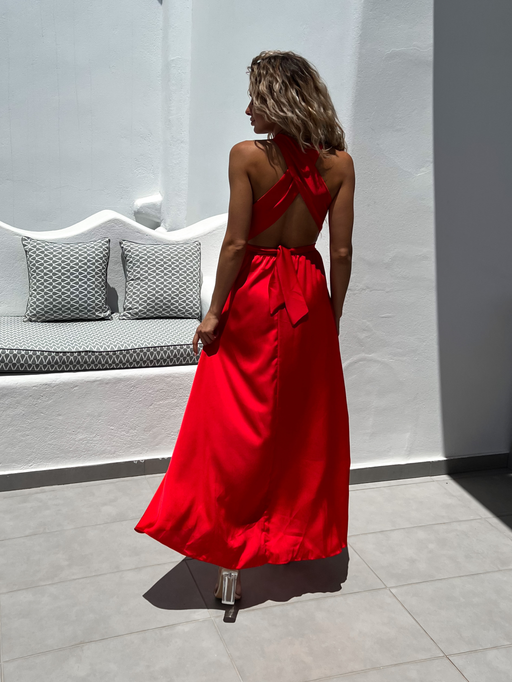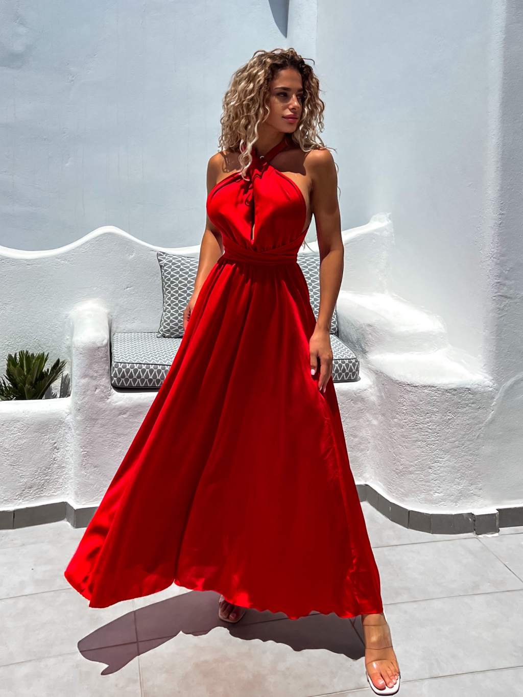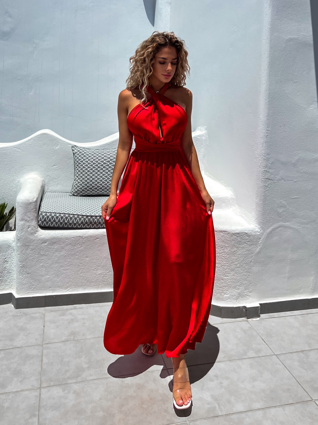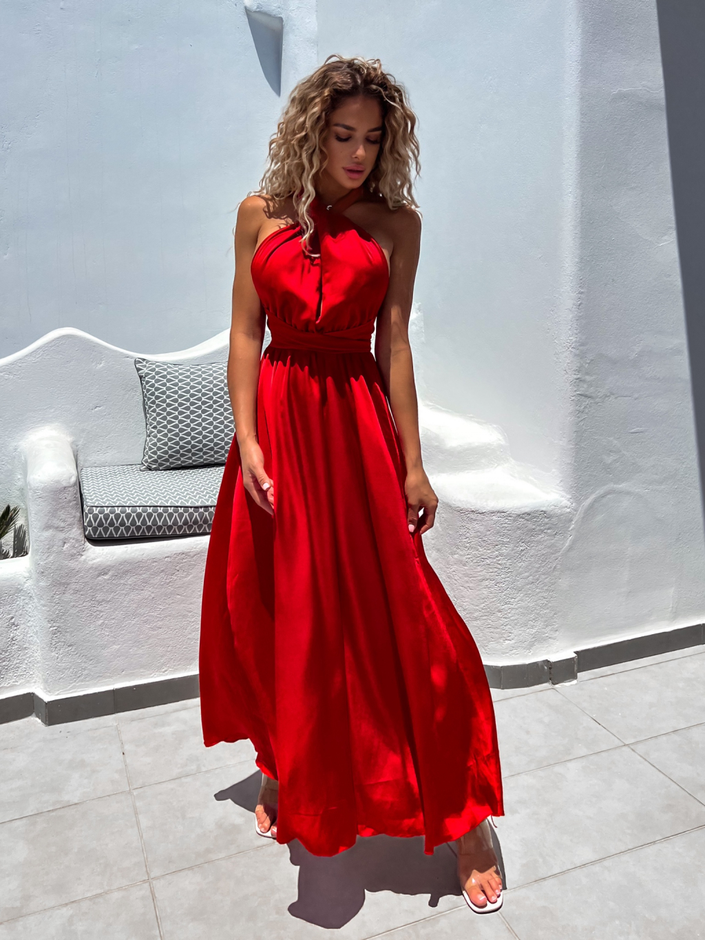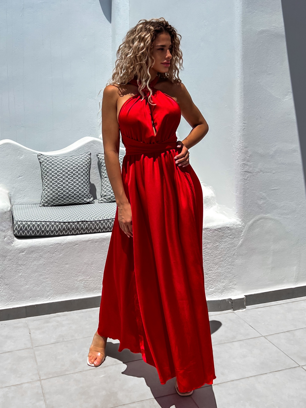 Červené lesklé šaty VALERDI s variabilním vázáním a rozparkem