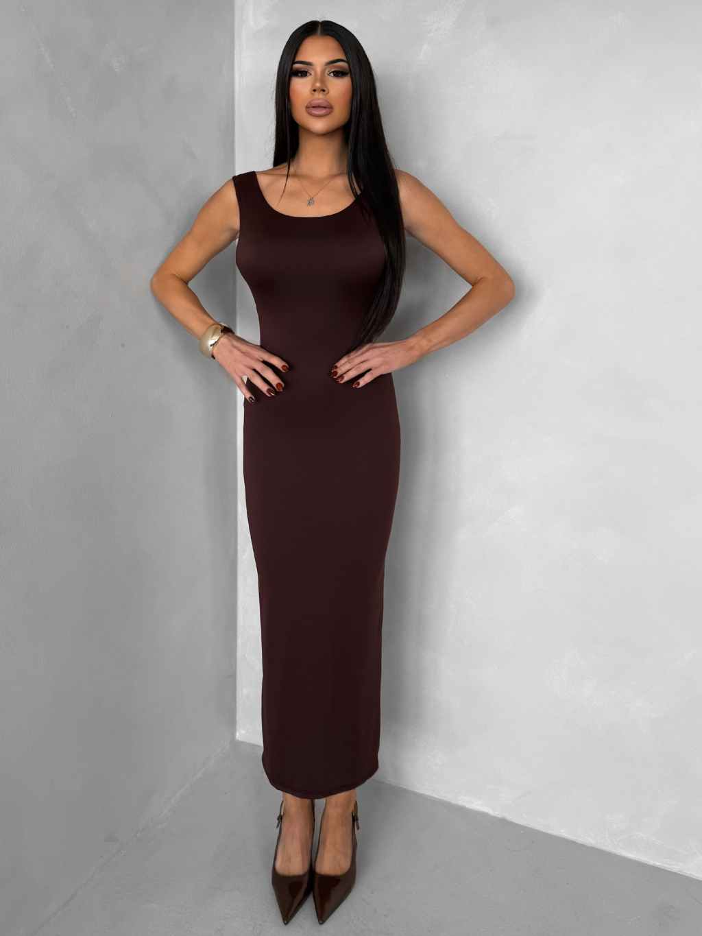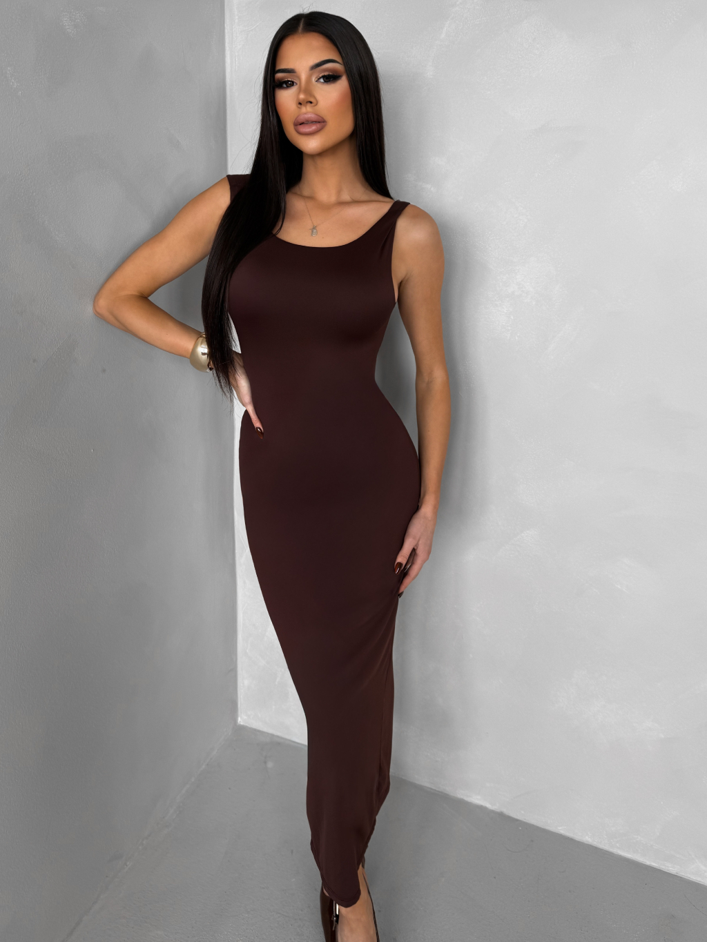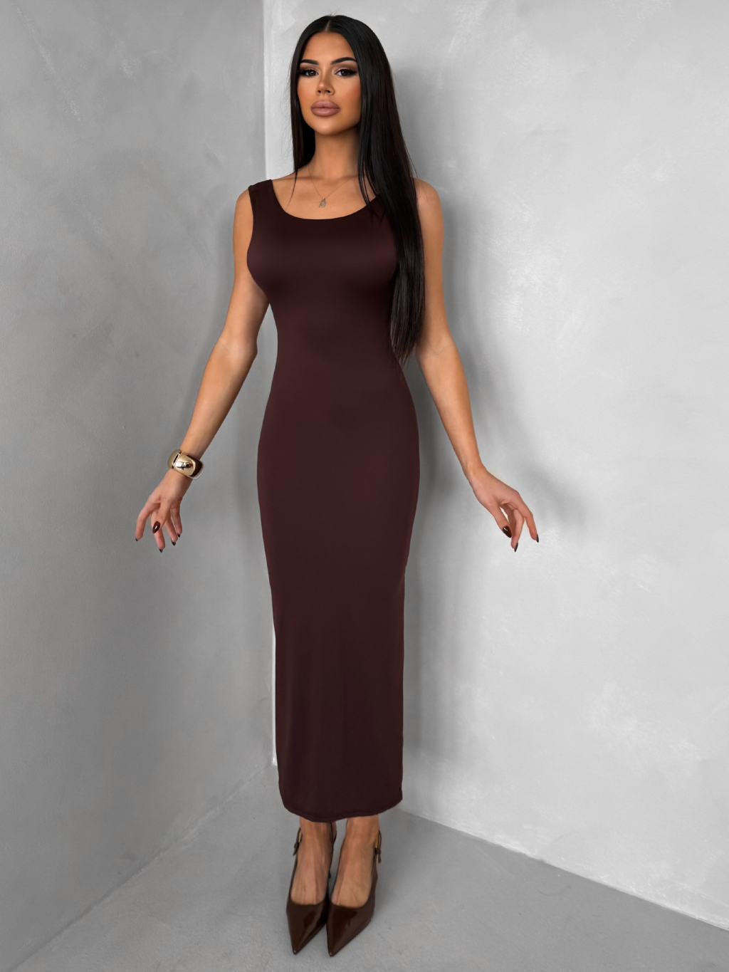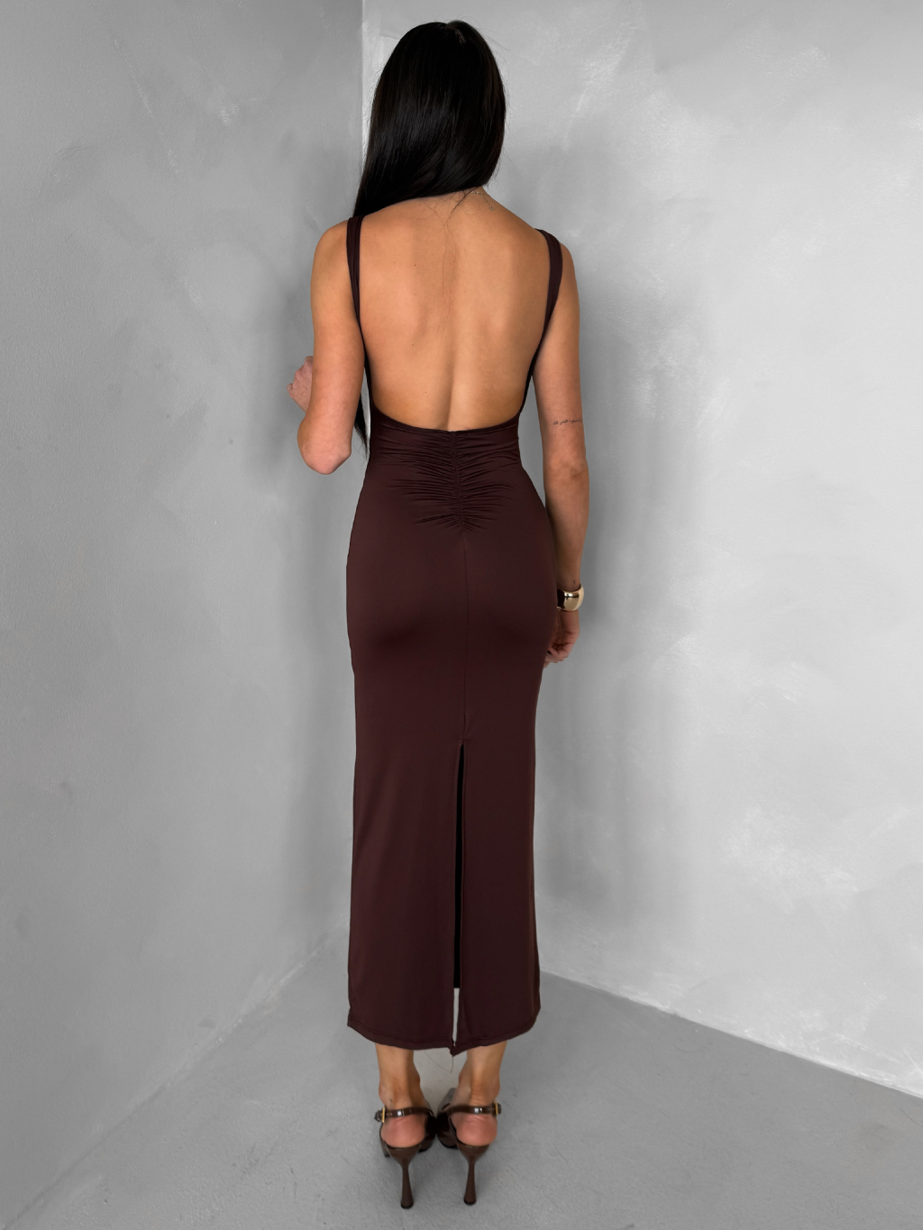 Hnědé přiléhavé midi šaty TREVY s odhalenými zády
