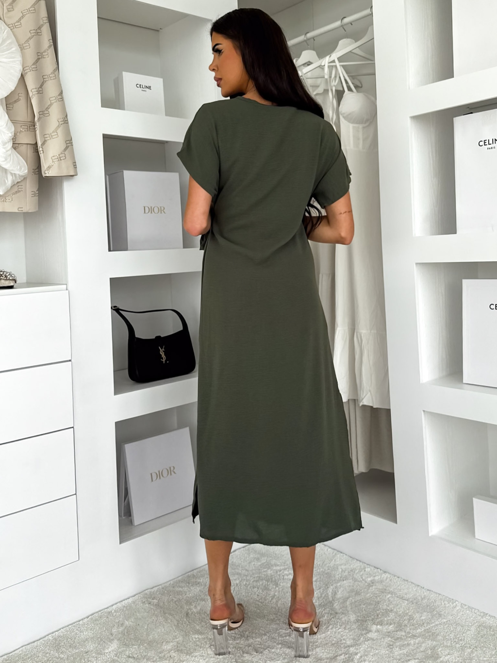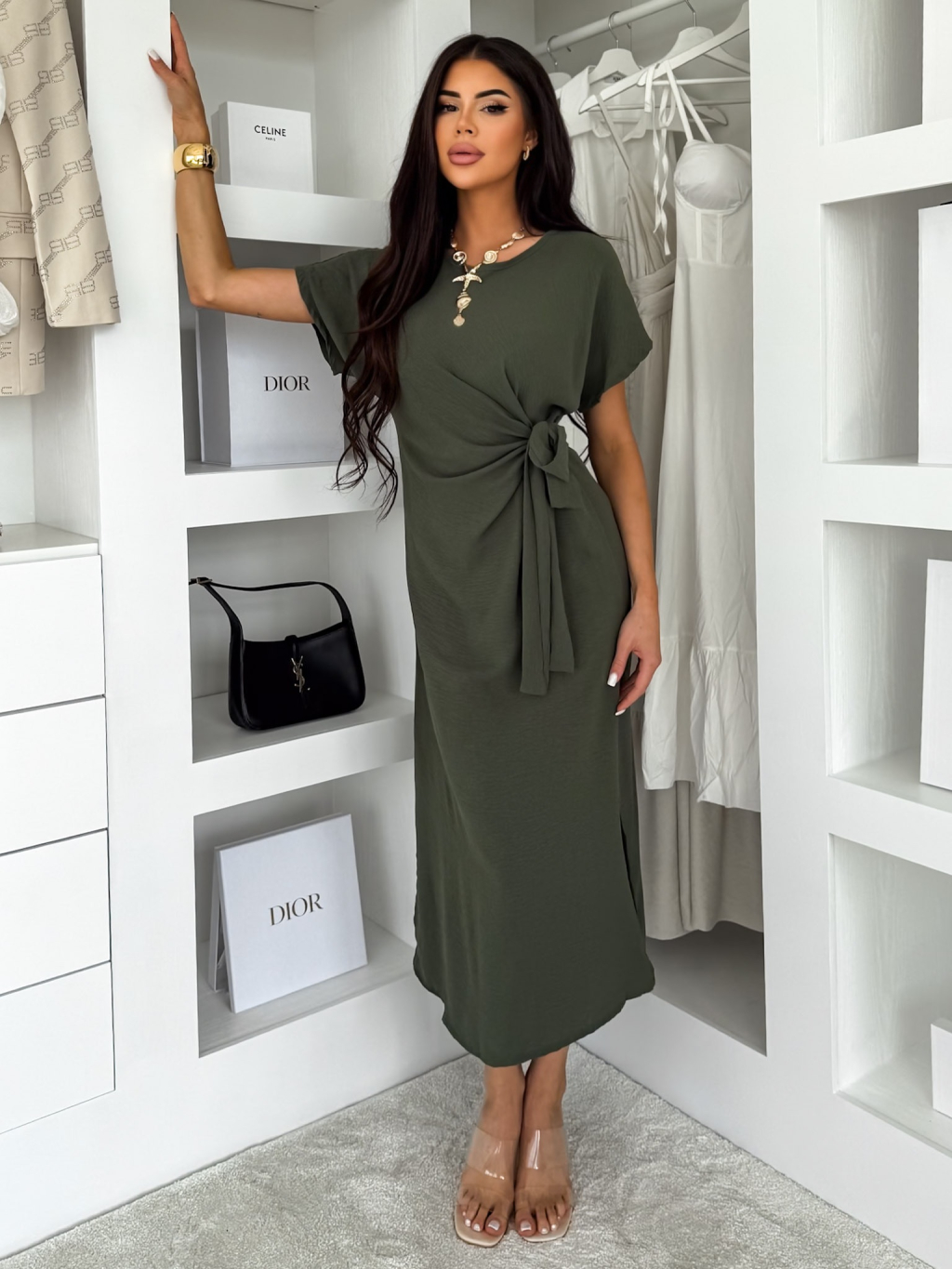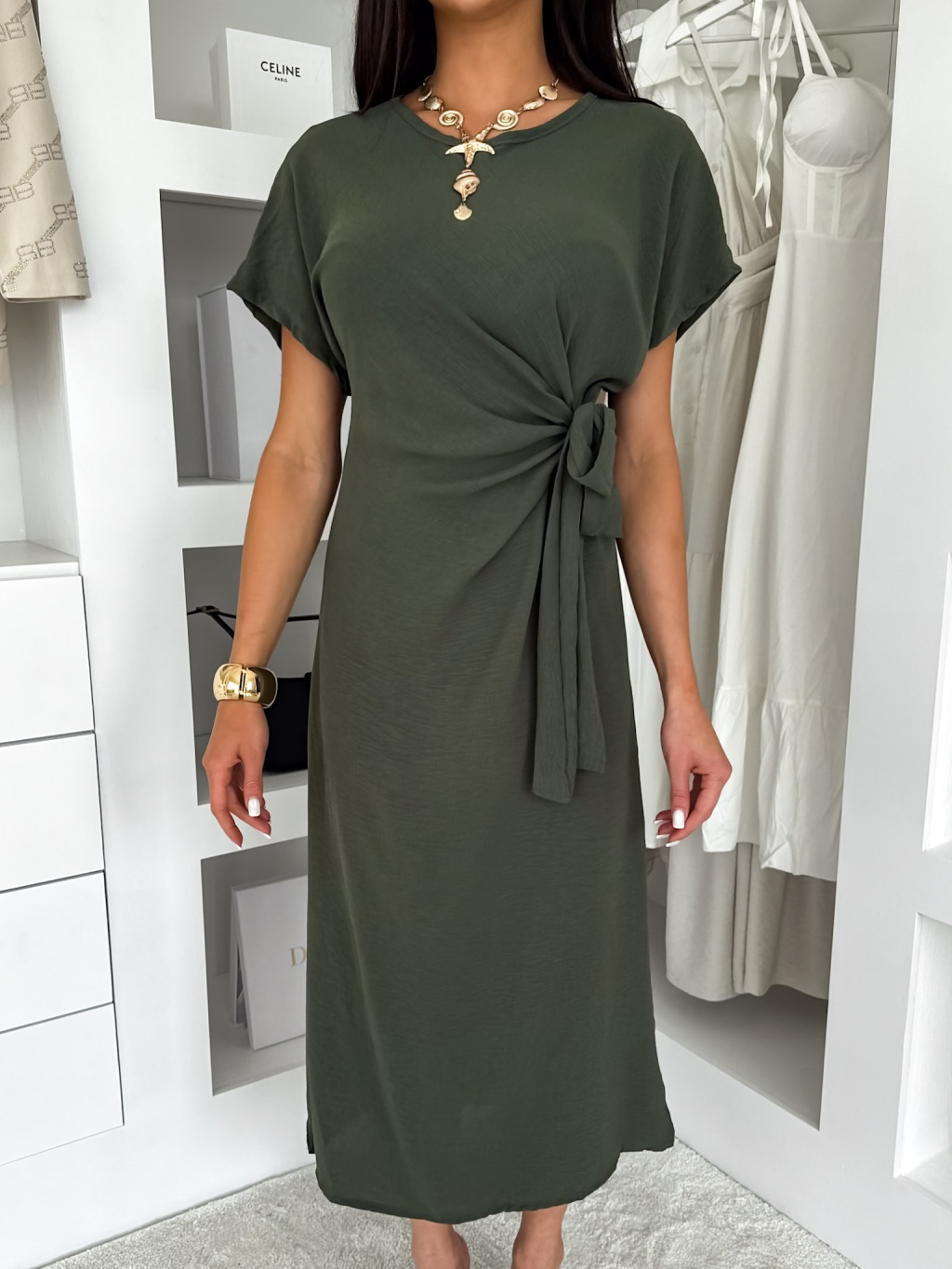Khaki elegantní vypasované šaty NIRELA s vázáním