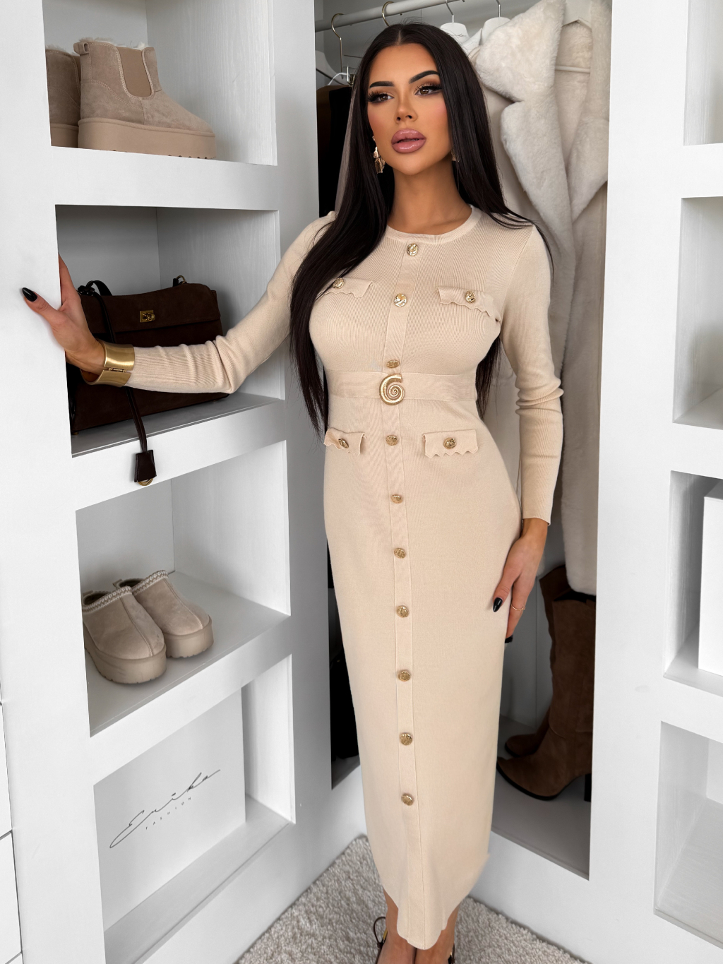 Krémové dlouhé šaty CRESTILO s dlouhým rukávem