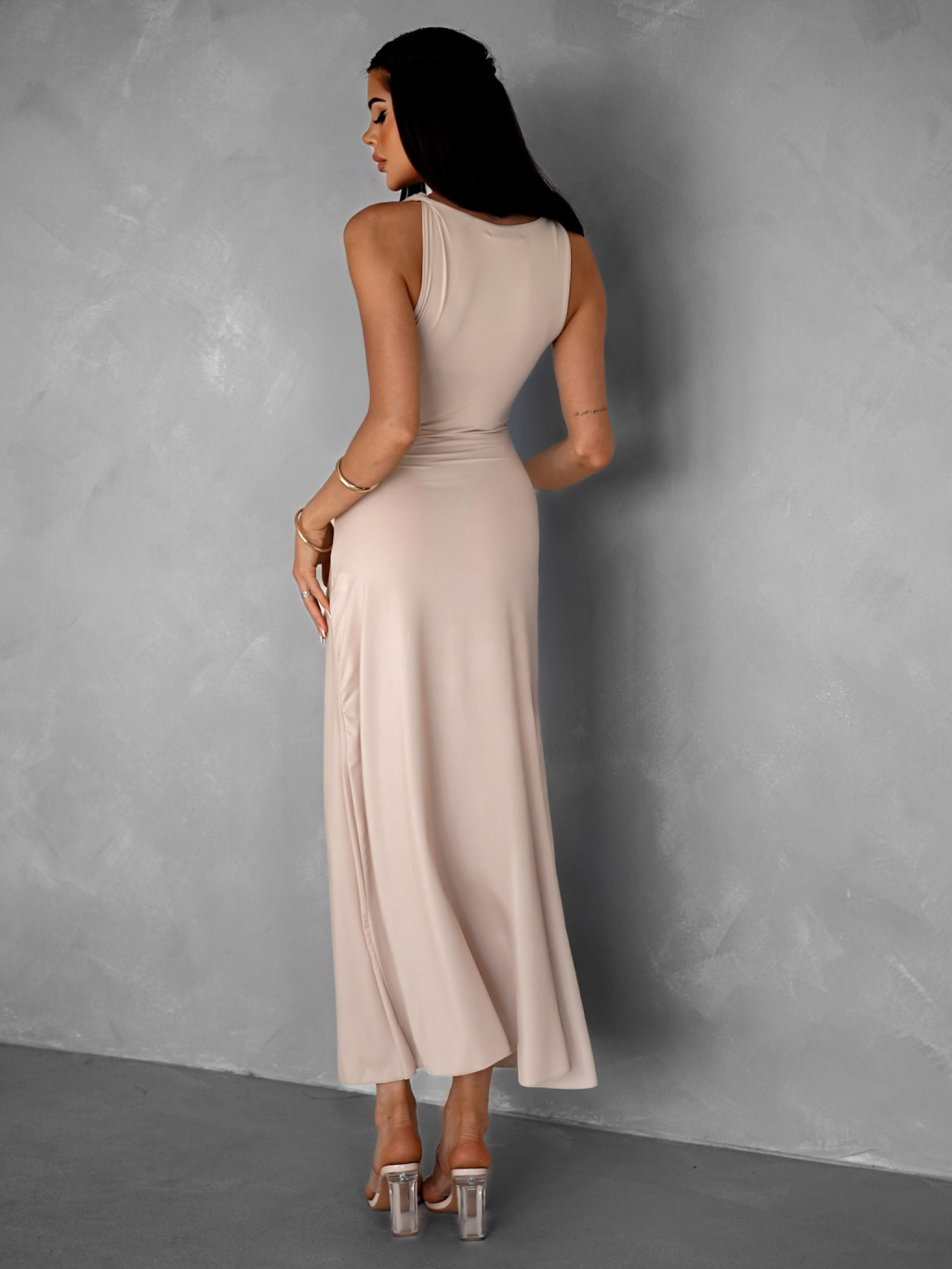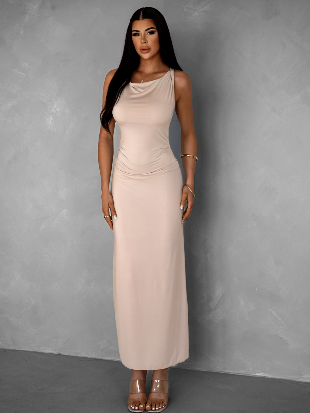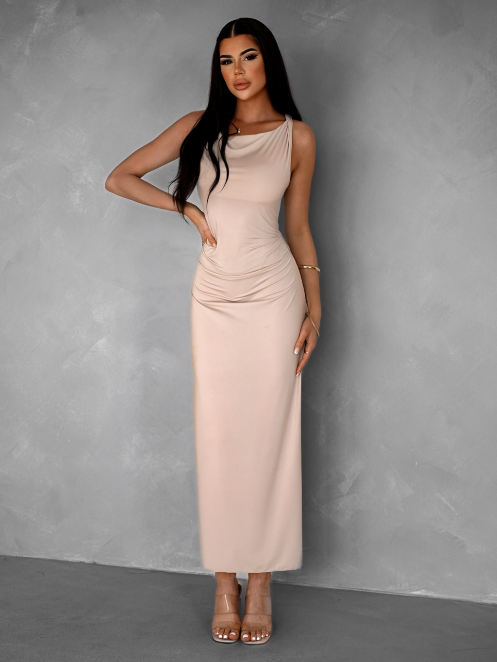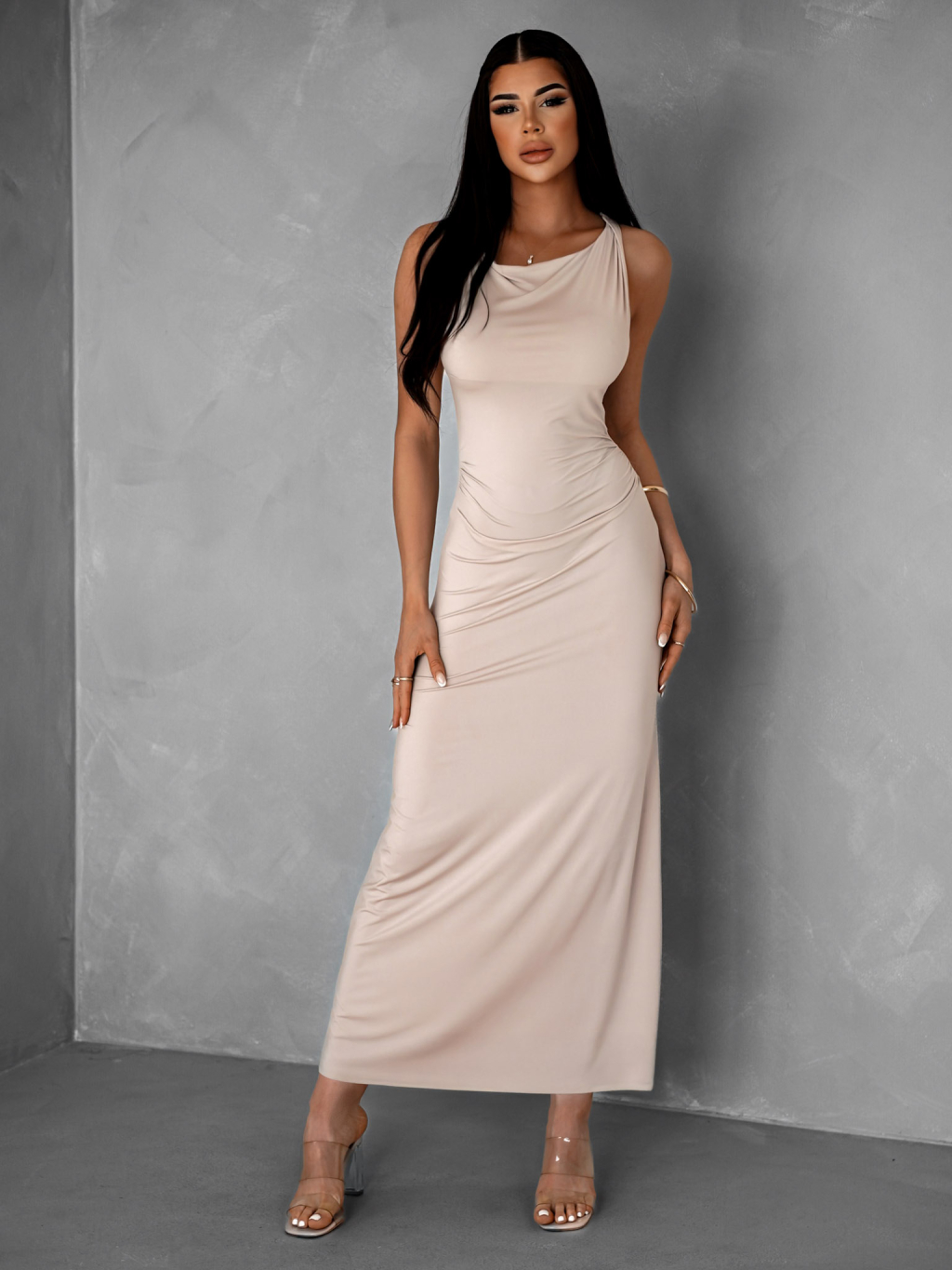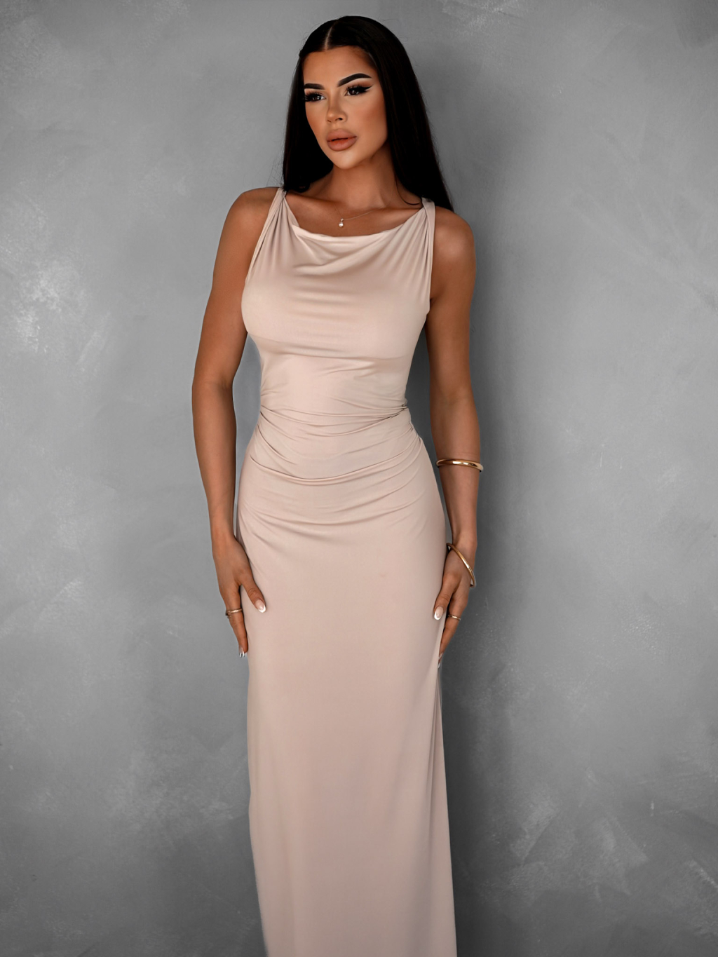 Krémové elegantní elastické dlouhé šaty BURATA