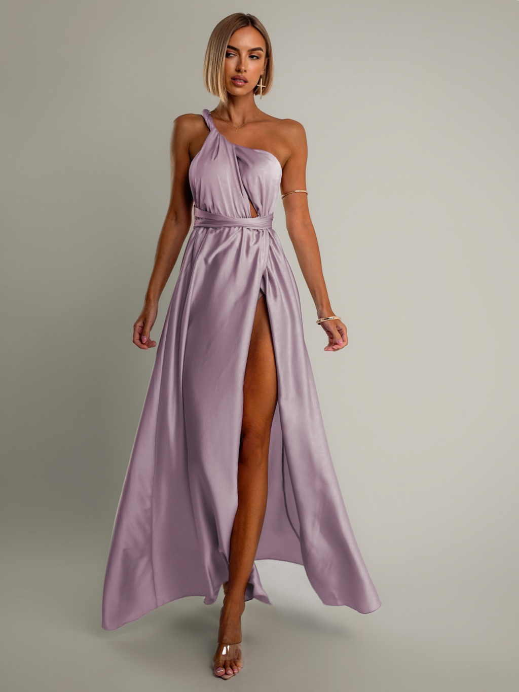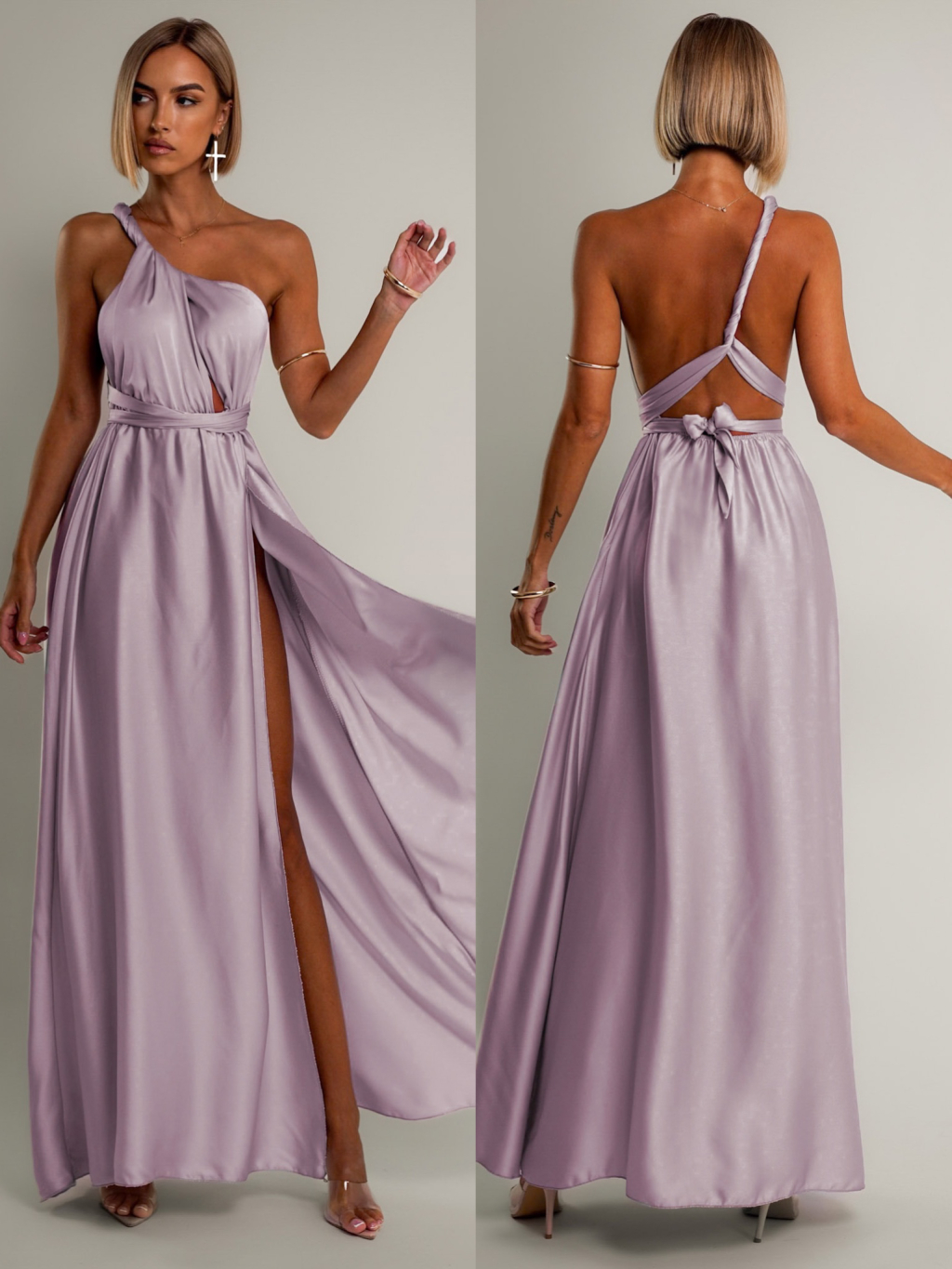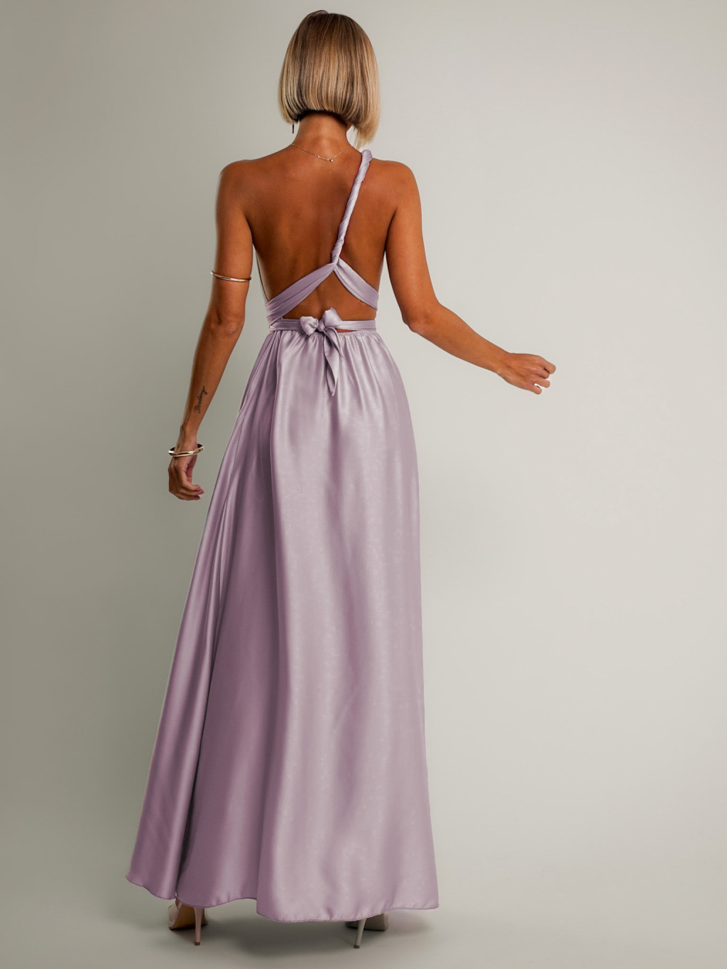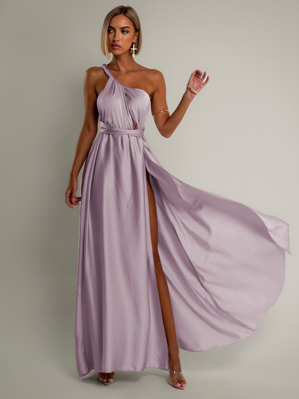 Levandulové saténové šaty VALERDI s variabilním vázáním a rozparkem