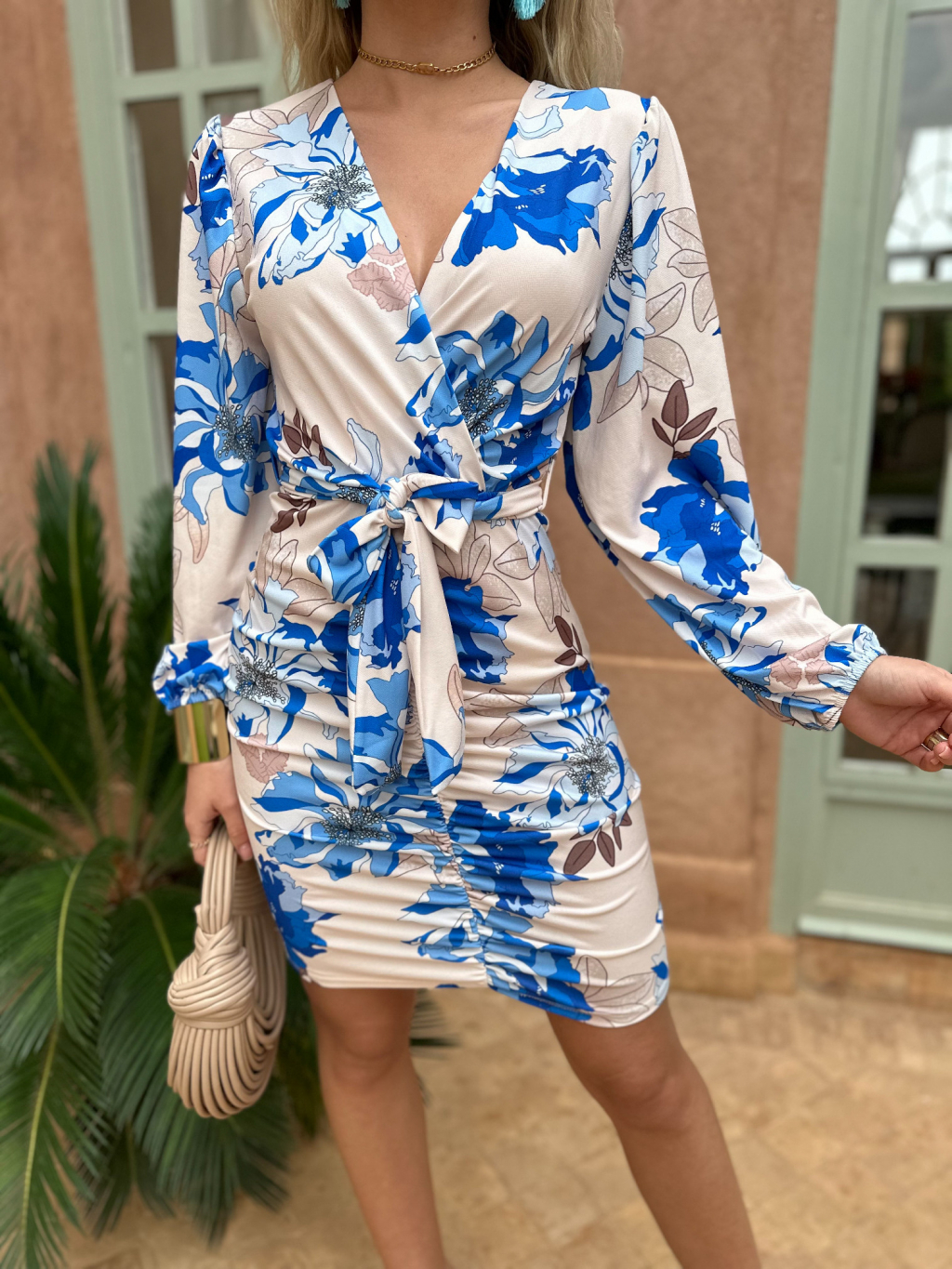 Modré elegantní elastické šaty LAKHDAR s květinovým vzorem