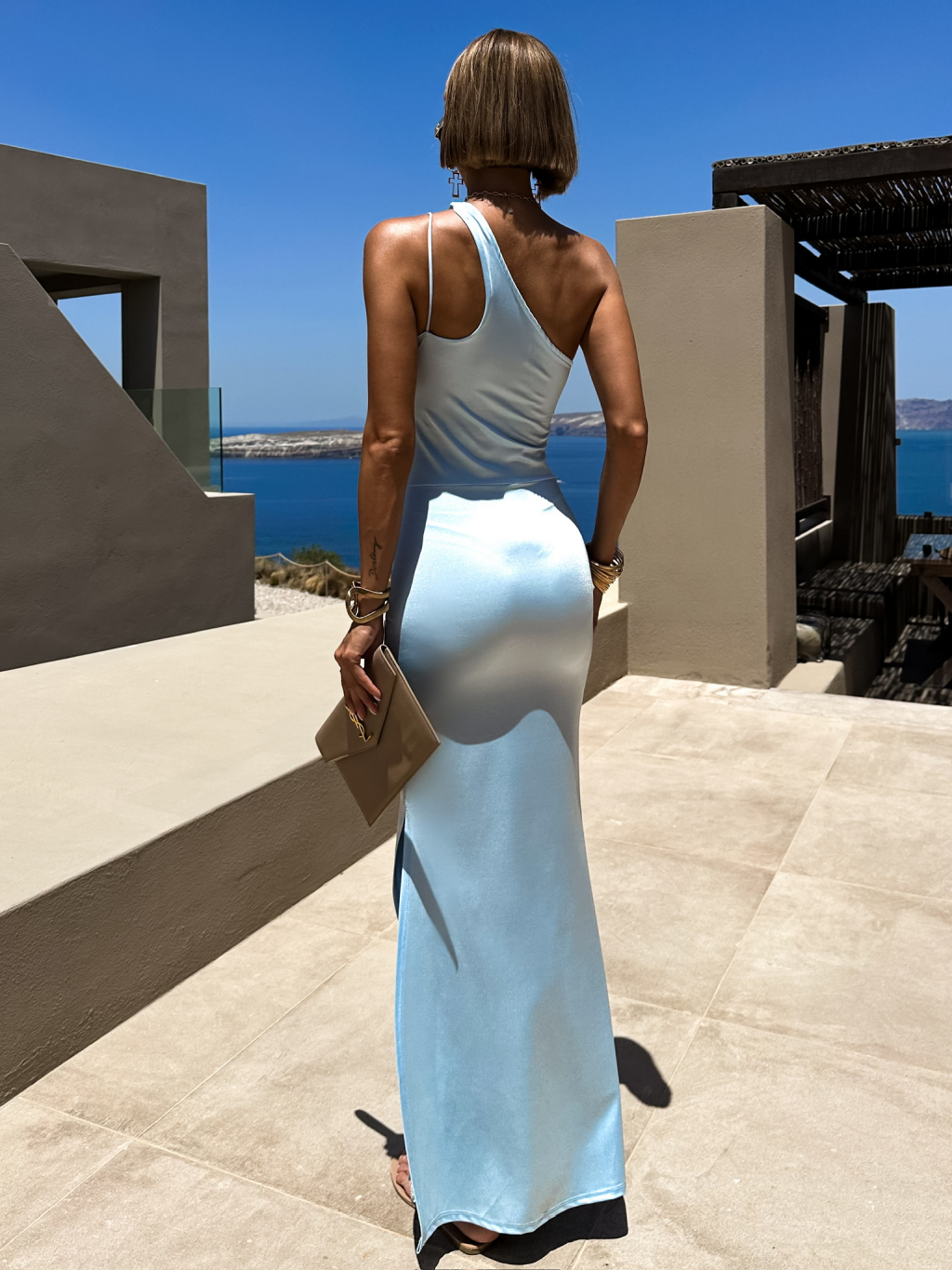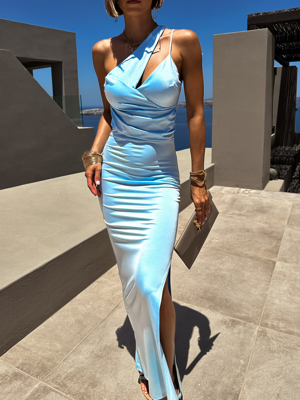 Modré saténové asymetrické šaty ERAN přes jedno rameno