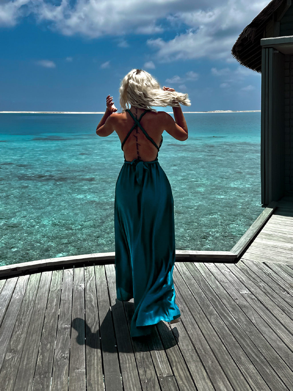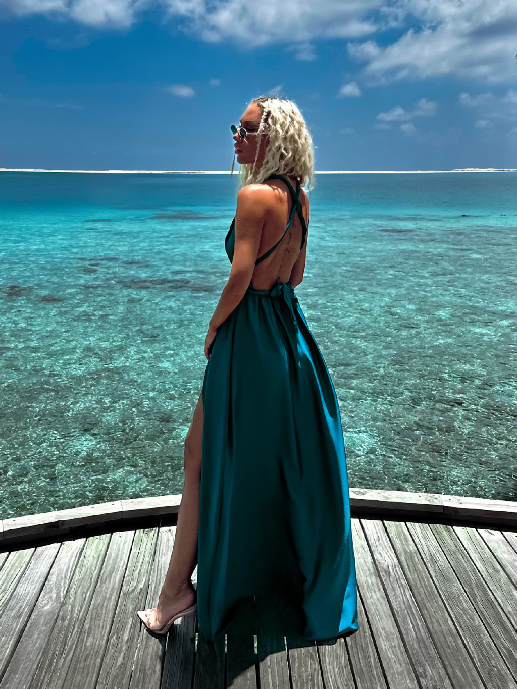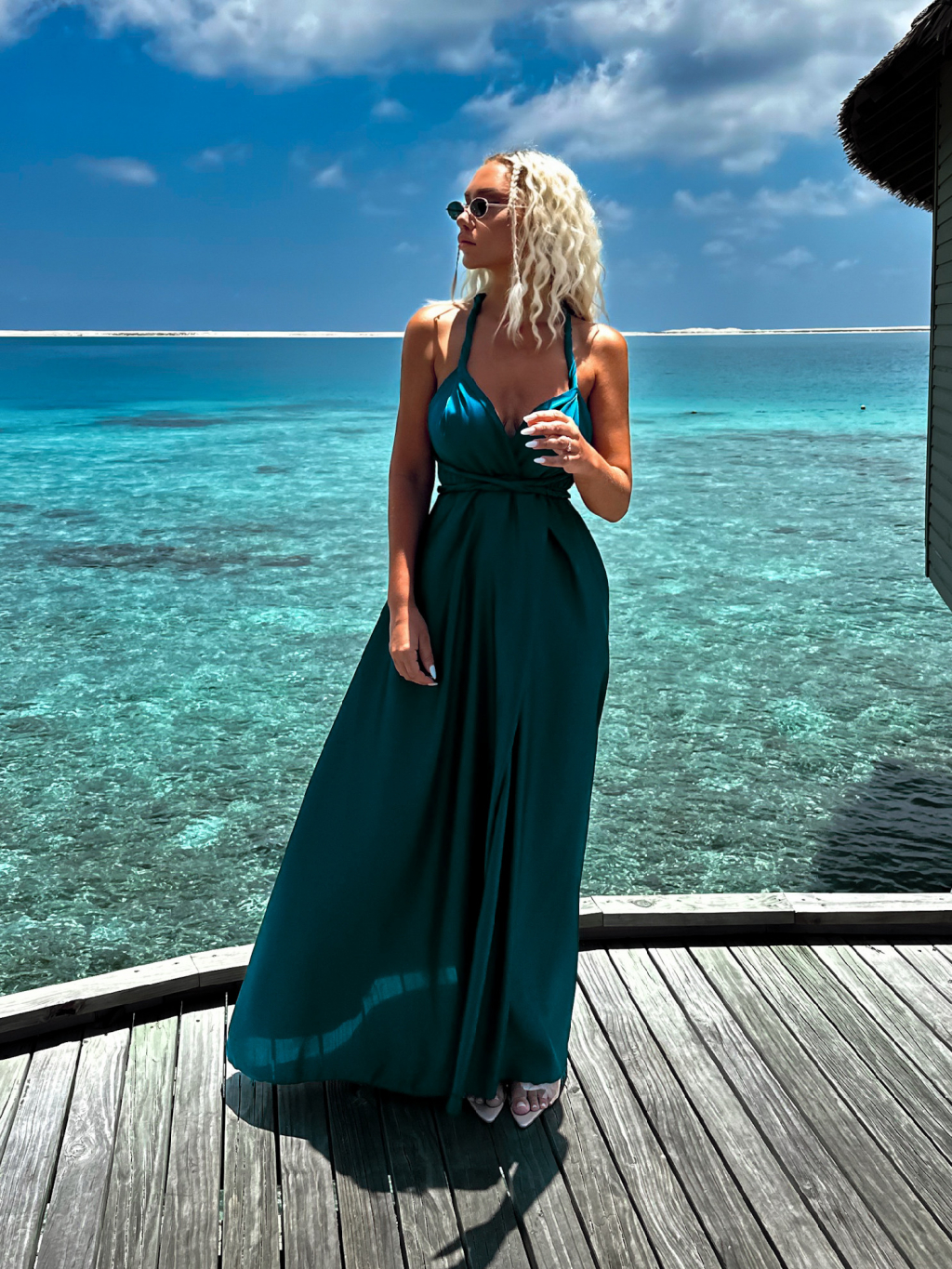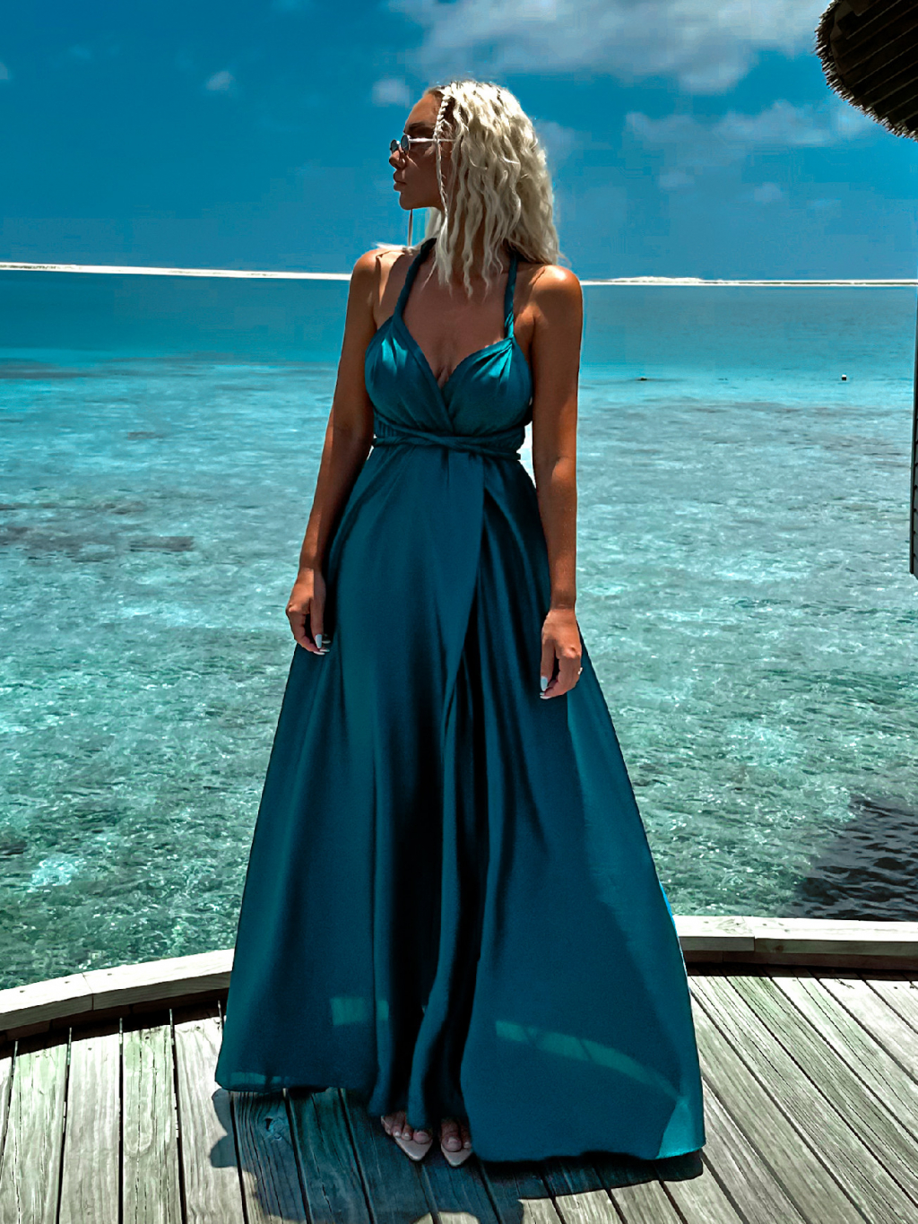Petrolejové dlouhé šaty VALERDI s variabilním vázáním a rozparkem