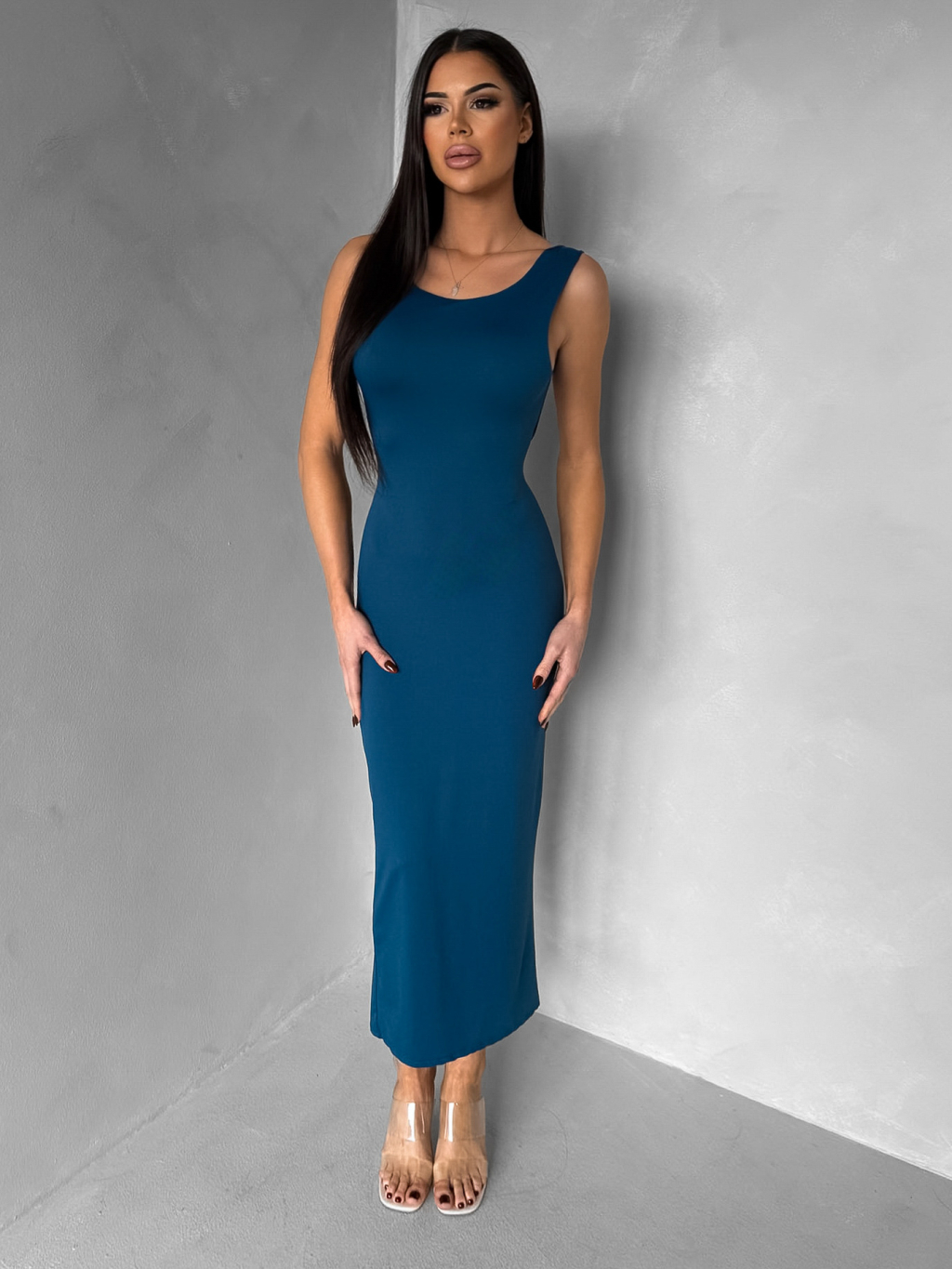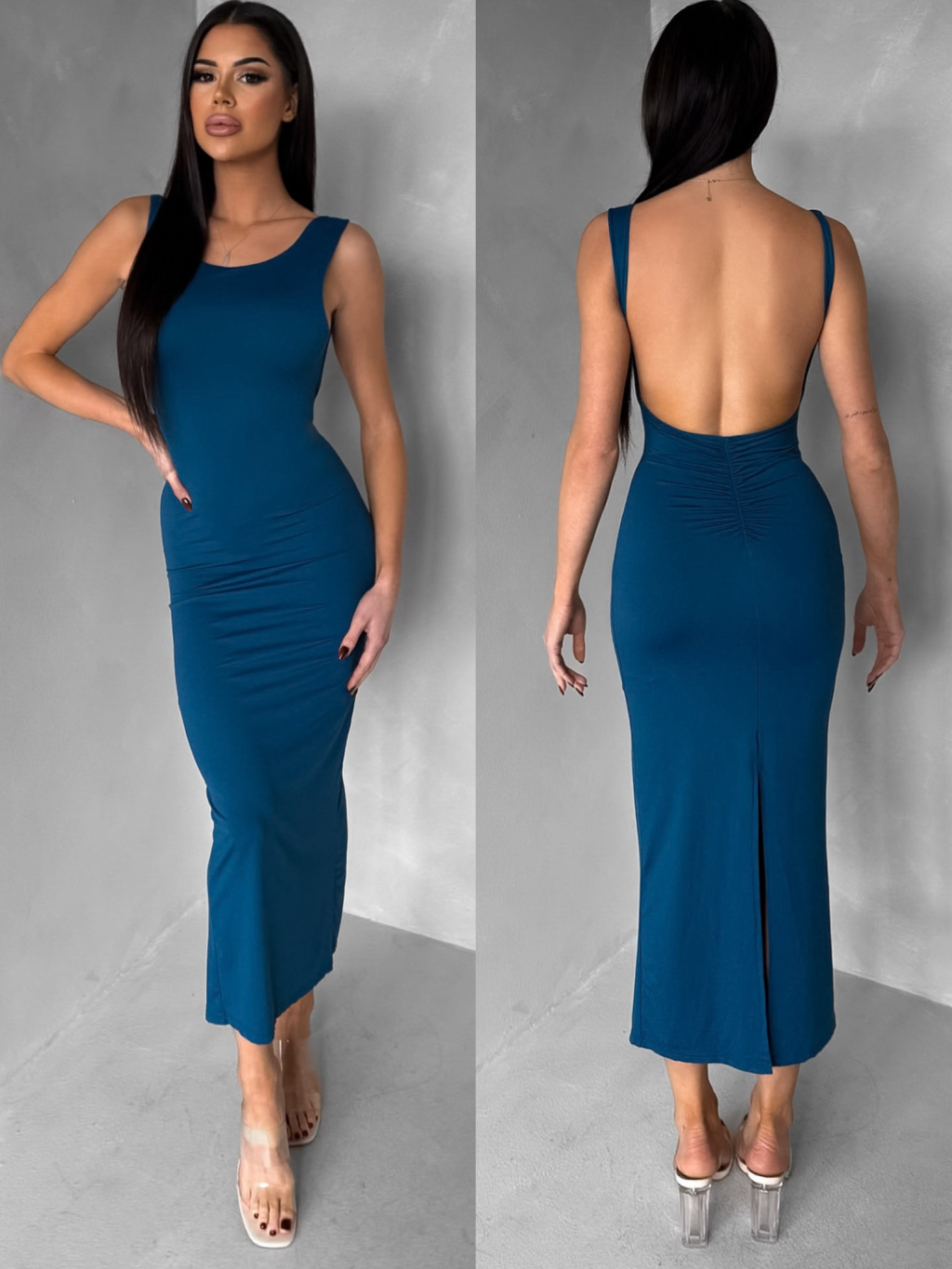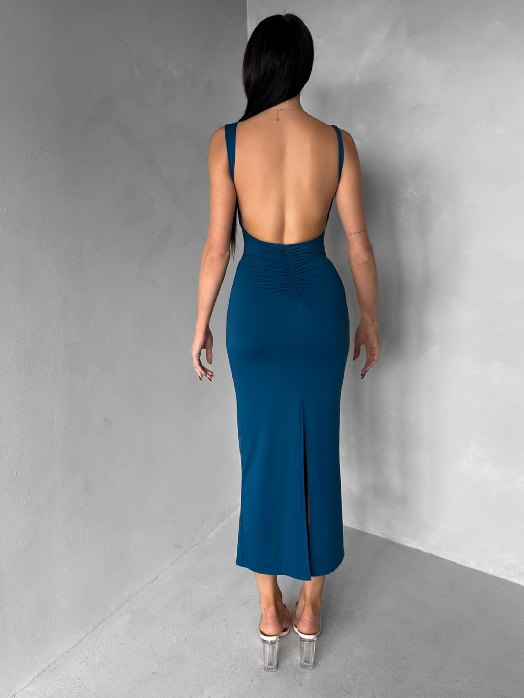 Petrolejové přiléhavé midi šaty TREVY s holými zády