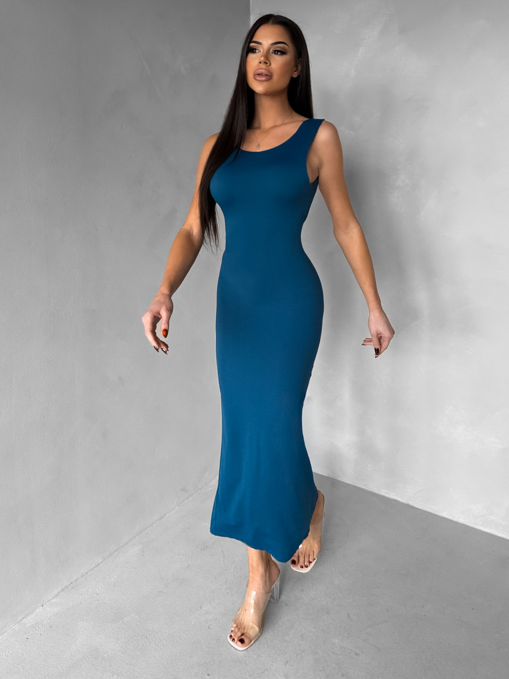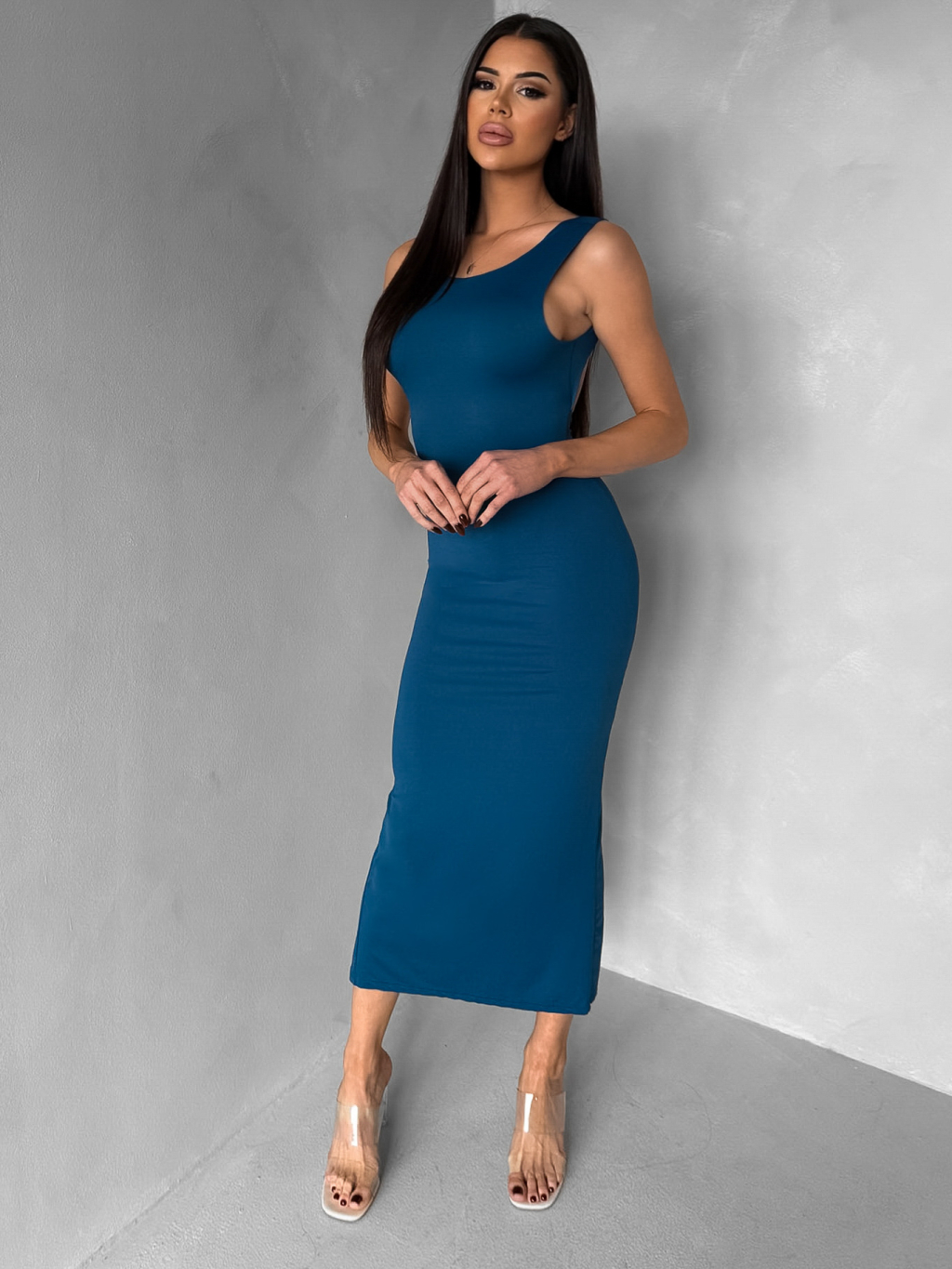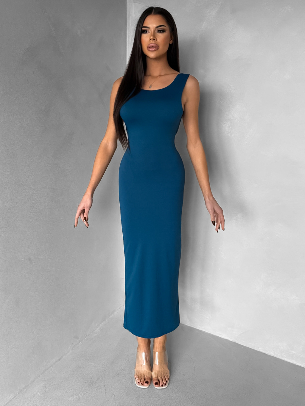 Petrolejové přiléhavé midi šaty TREVY s holými zády