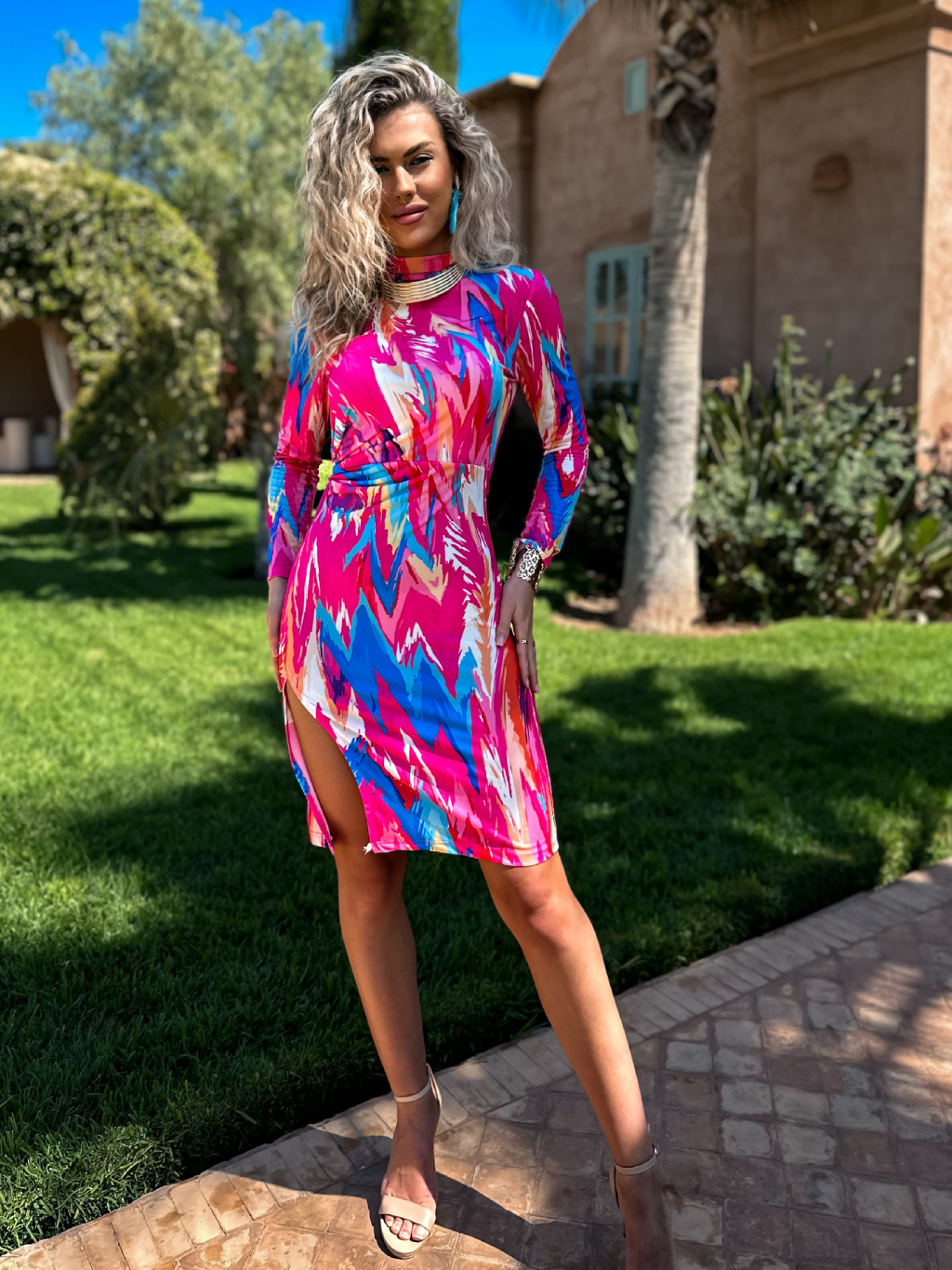 Růžové elastické krátké šaty NEJAT s rozparkem