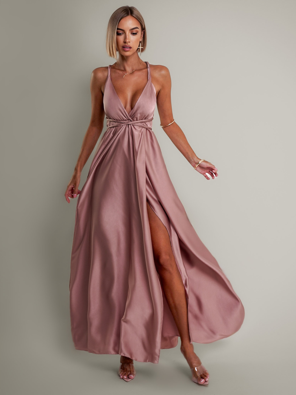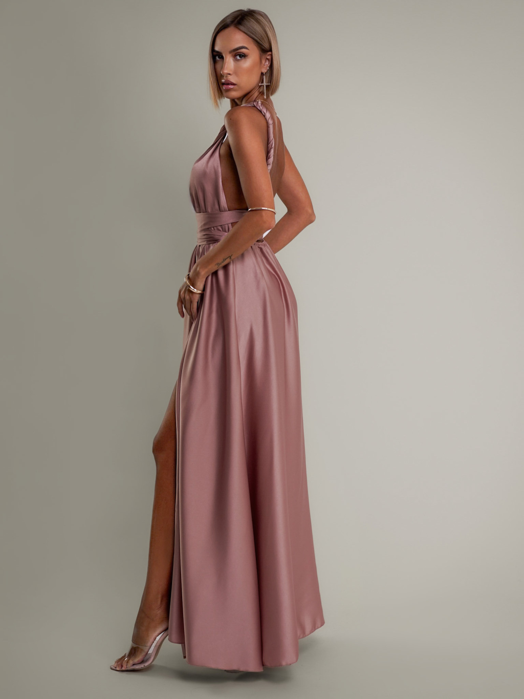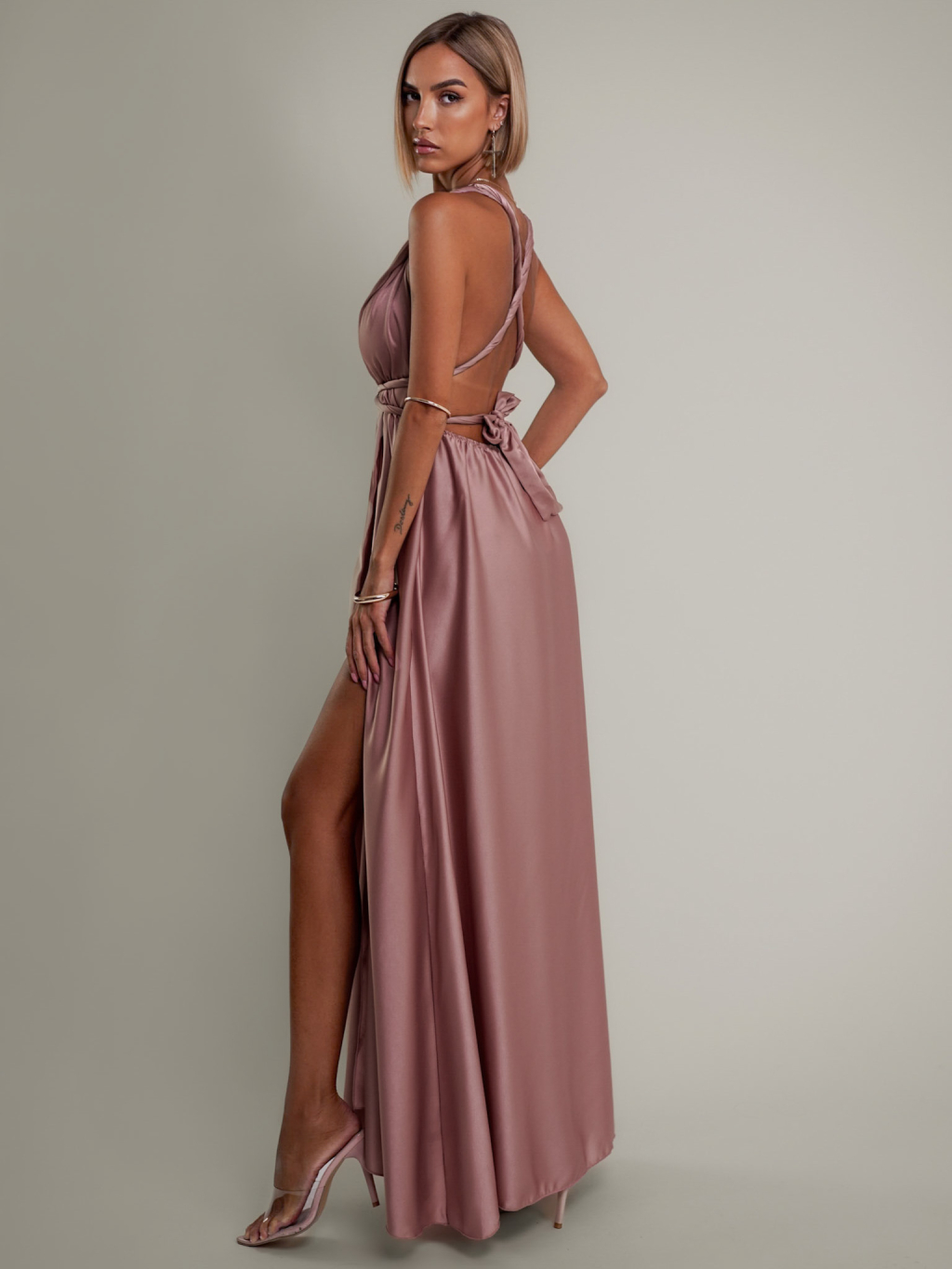 Starorůžové lesklé šaty VALERDI s variabilním vázáním a rozparkem