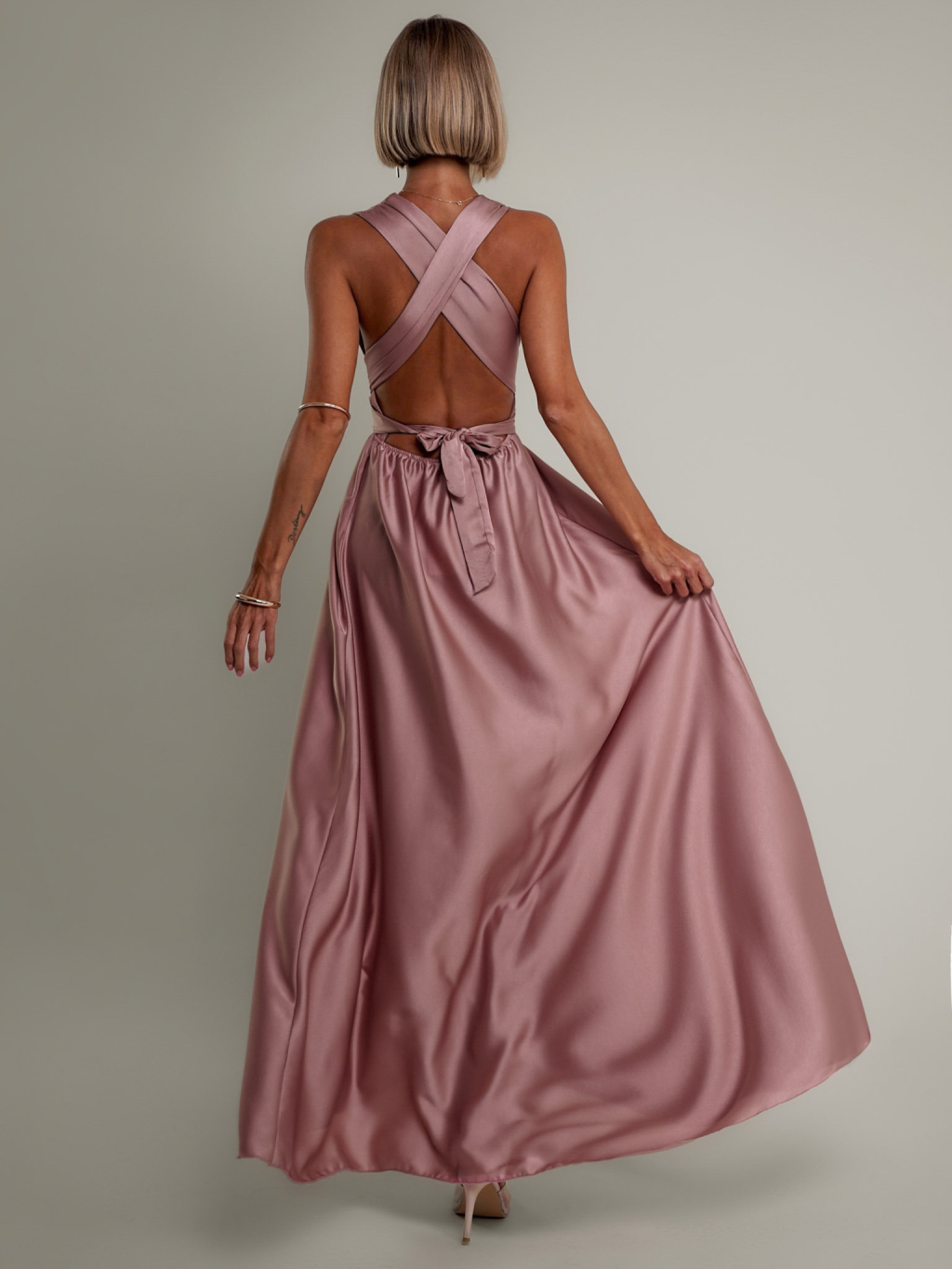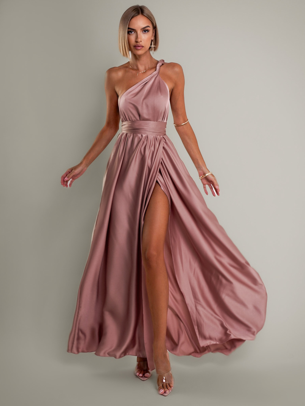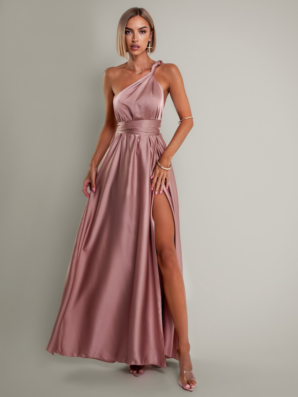 Starorůžové lesklé šaty VALERDI s variabilním vázáním a rozparkem