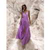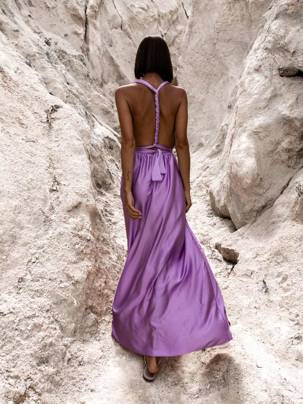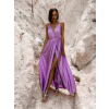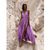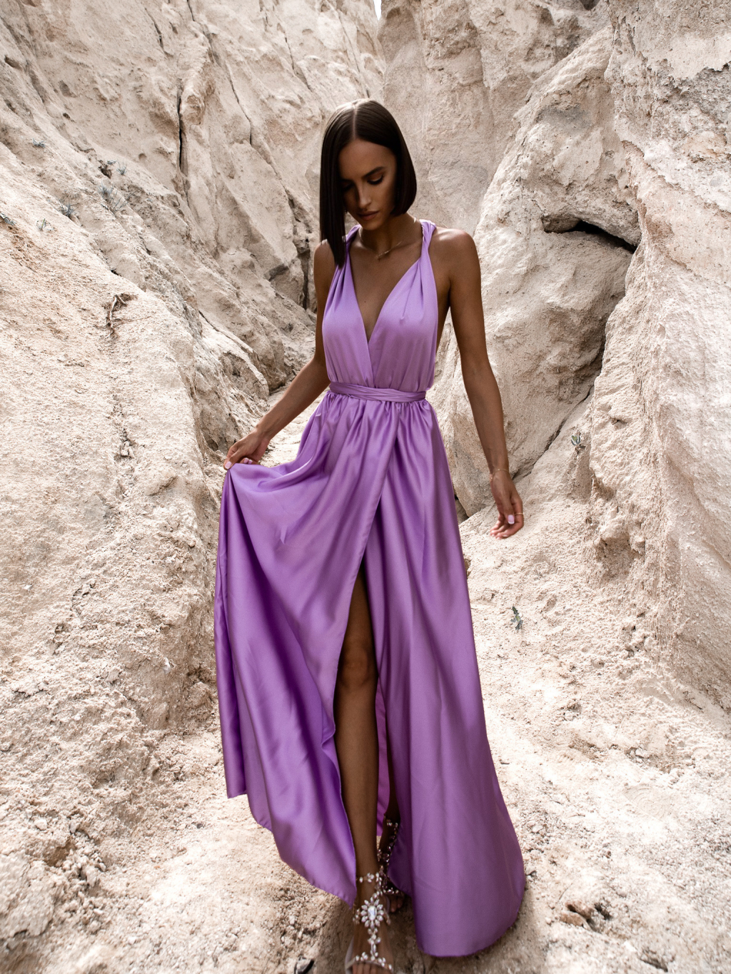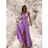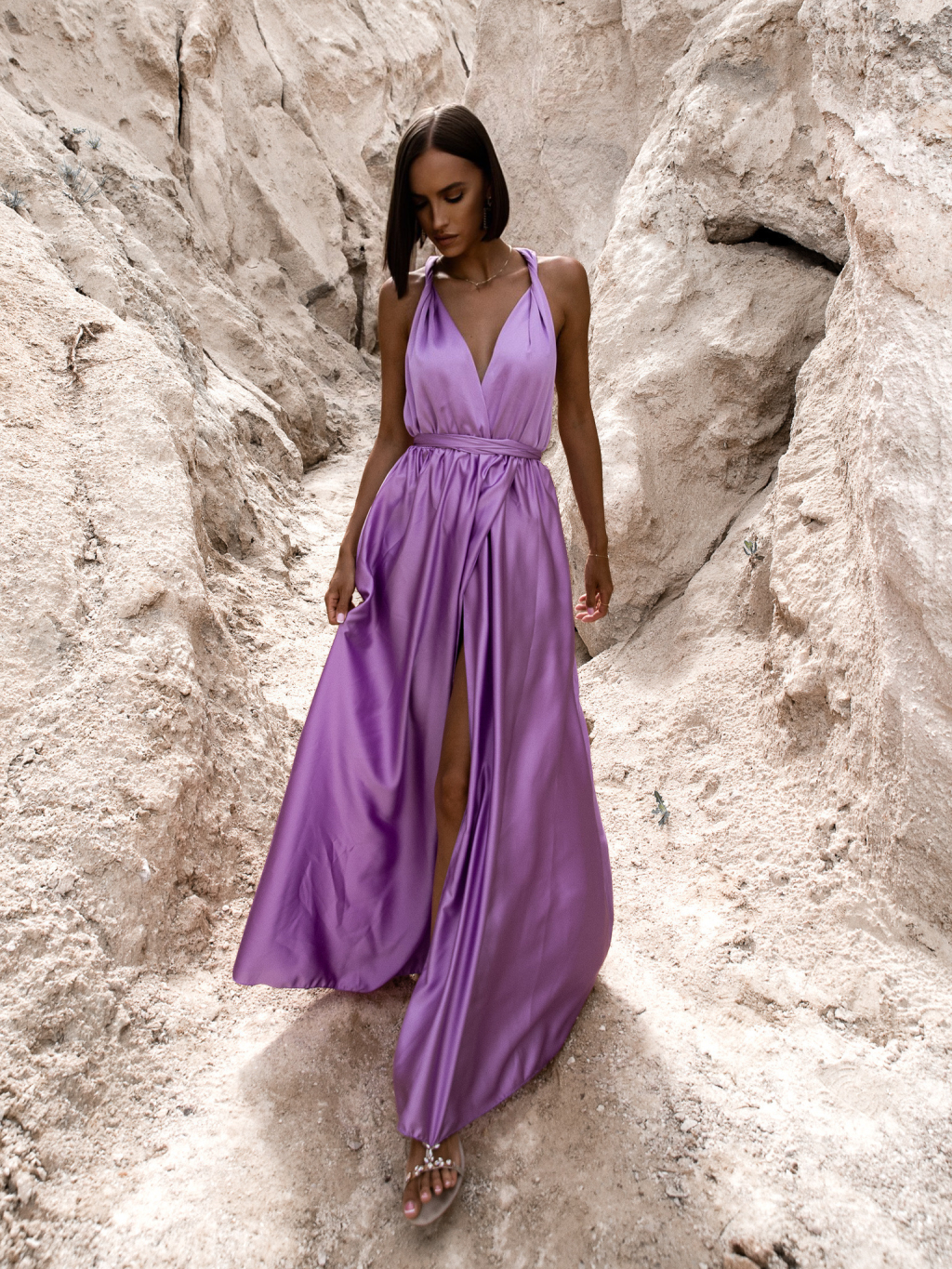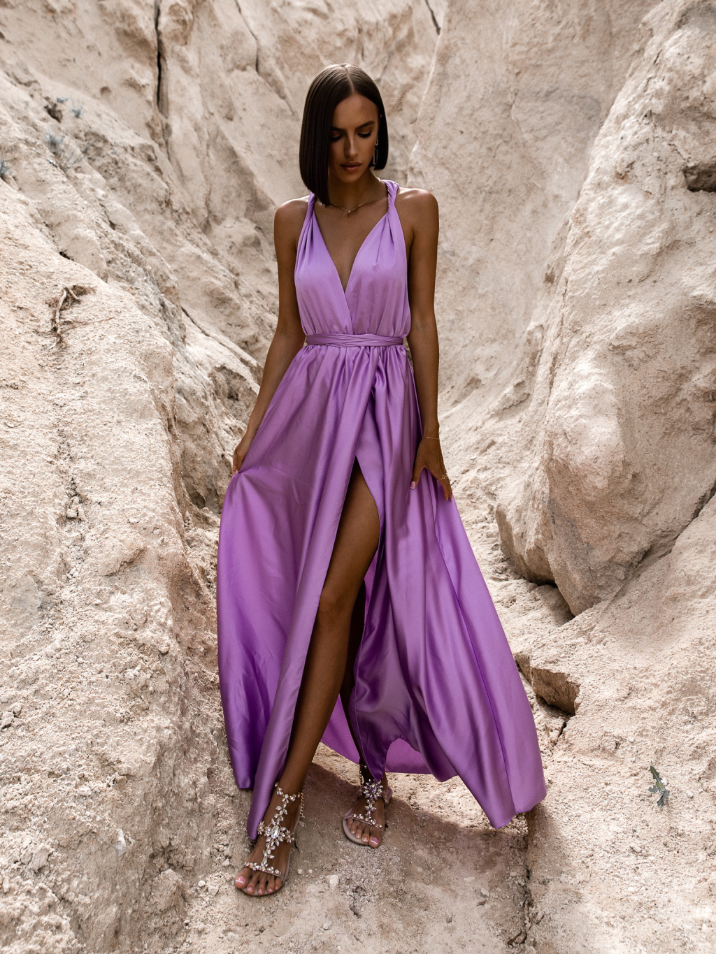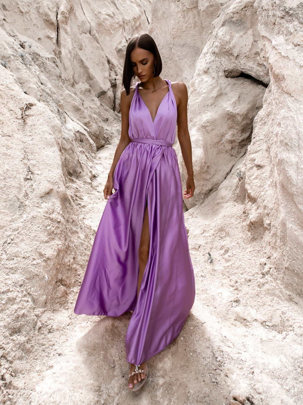 Světle fialové lesklé šaty VALERDI s variabilním vázáním a rozparkem