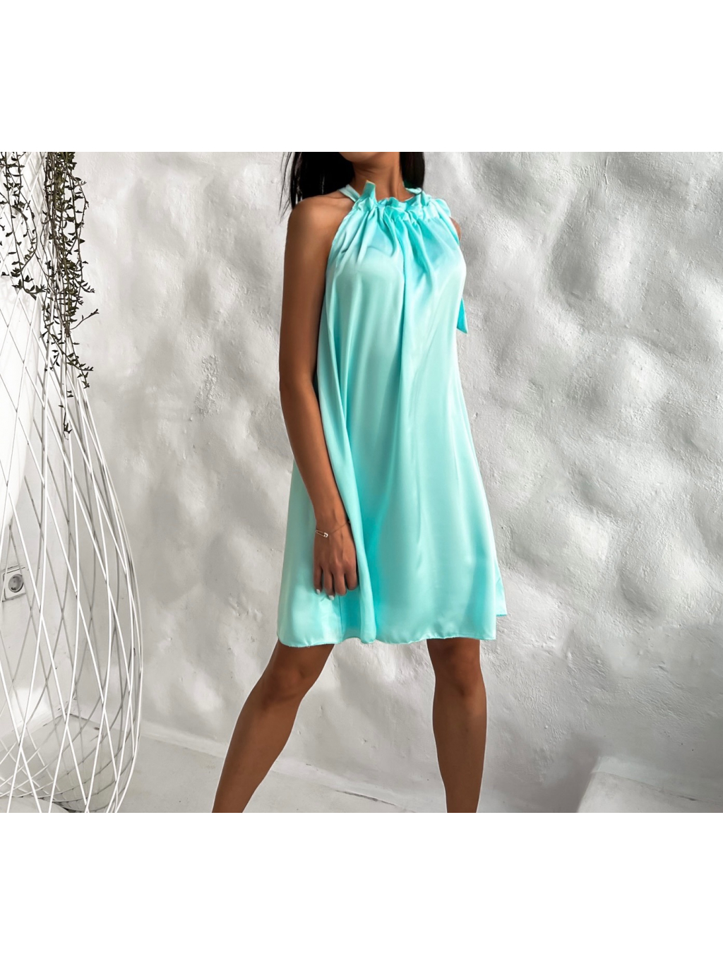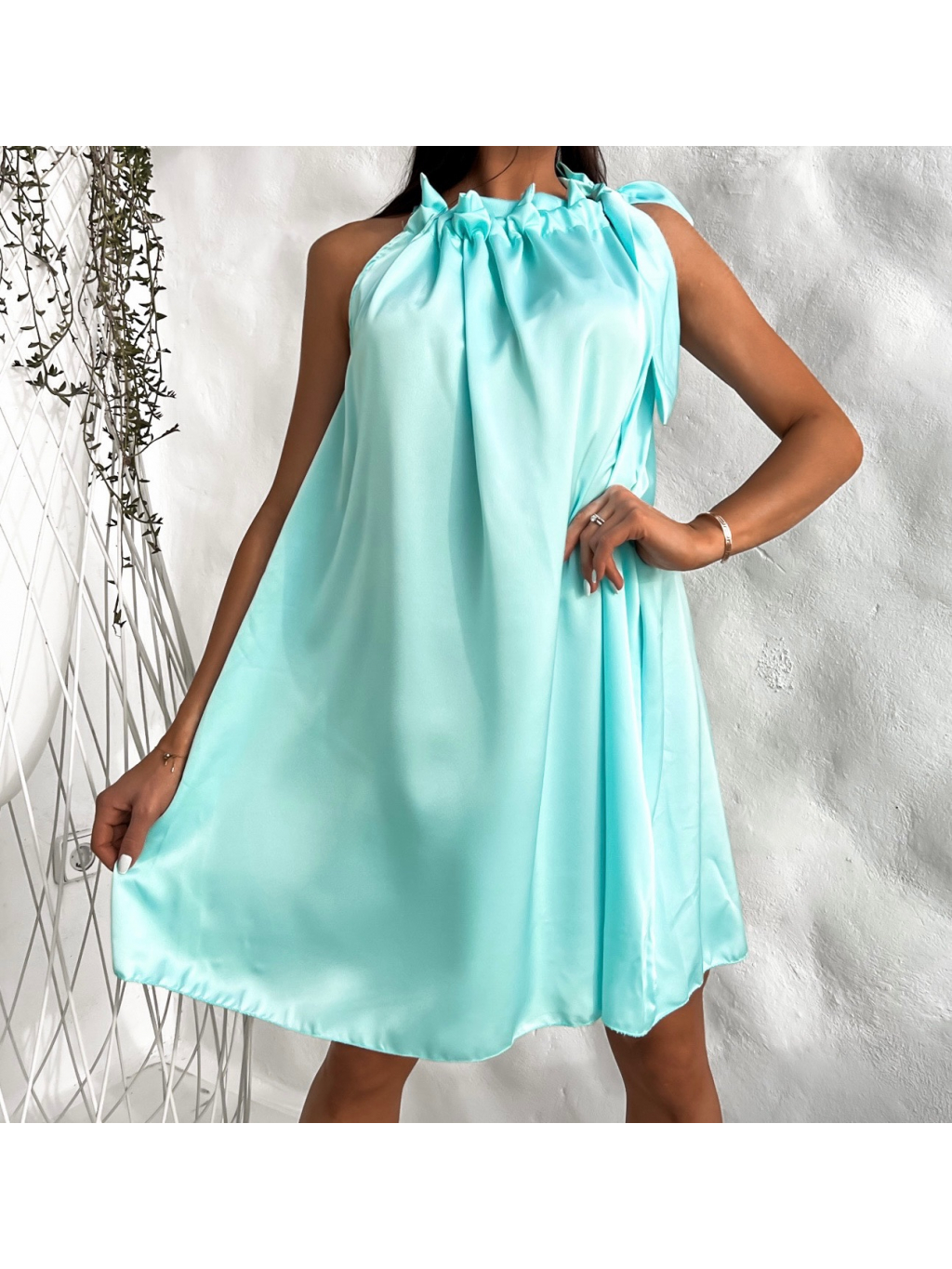 Světle modré lesklé šaty FUENTE s vázáním kolem krku