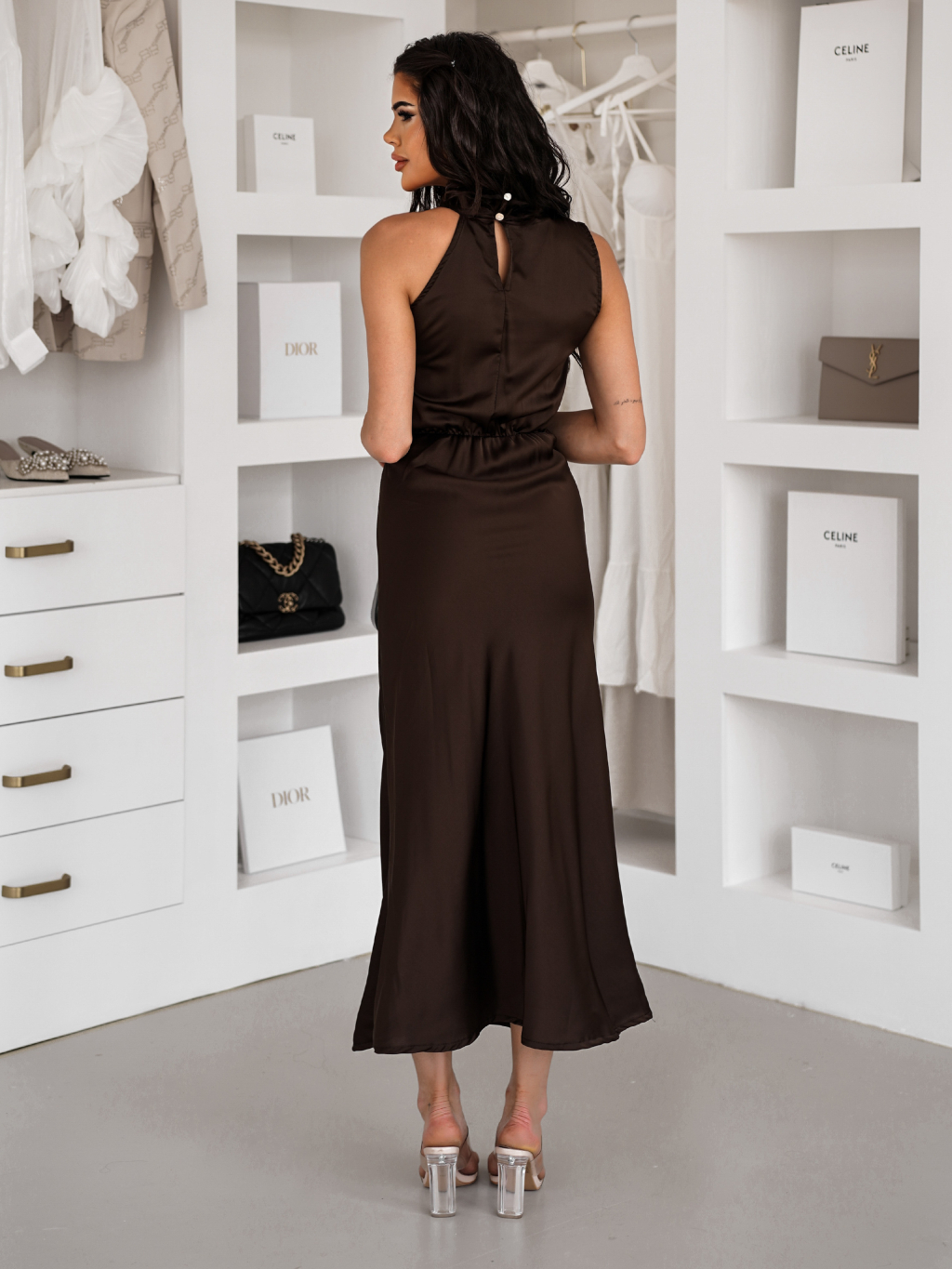 Tmavě hnědé dlouhé saténové šaty CREWE