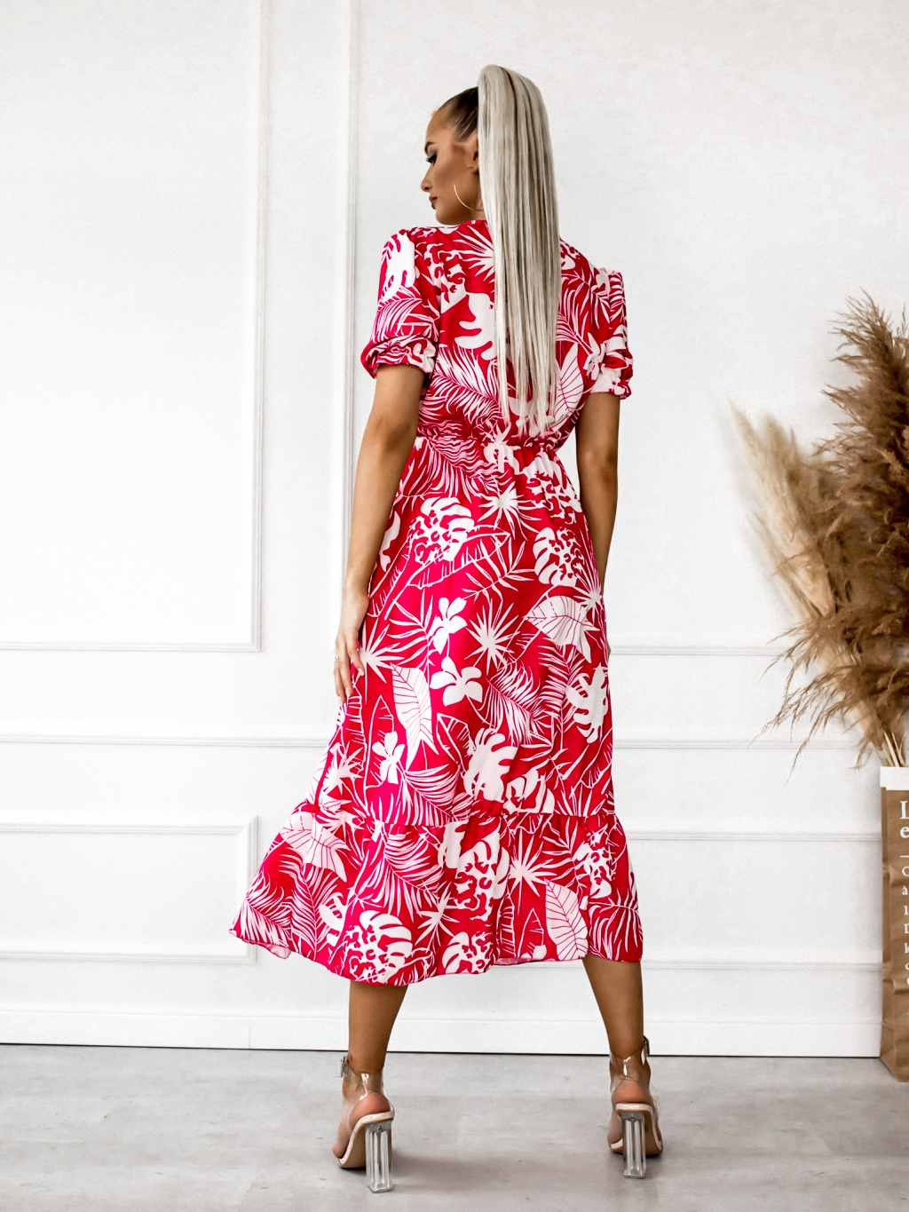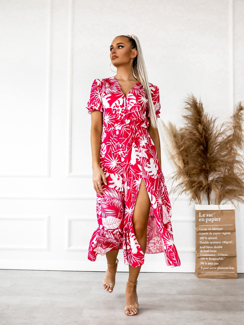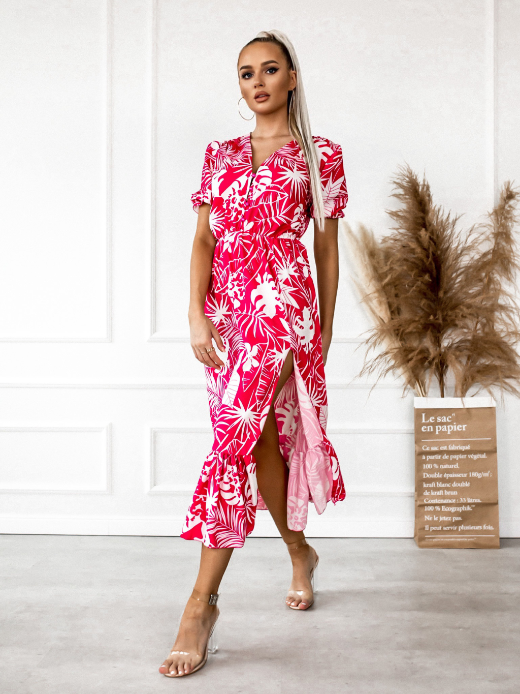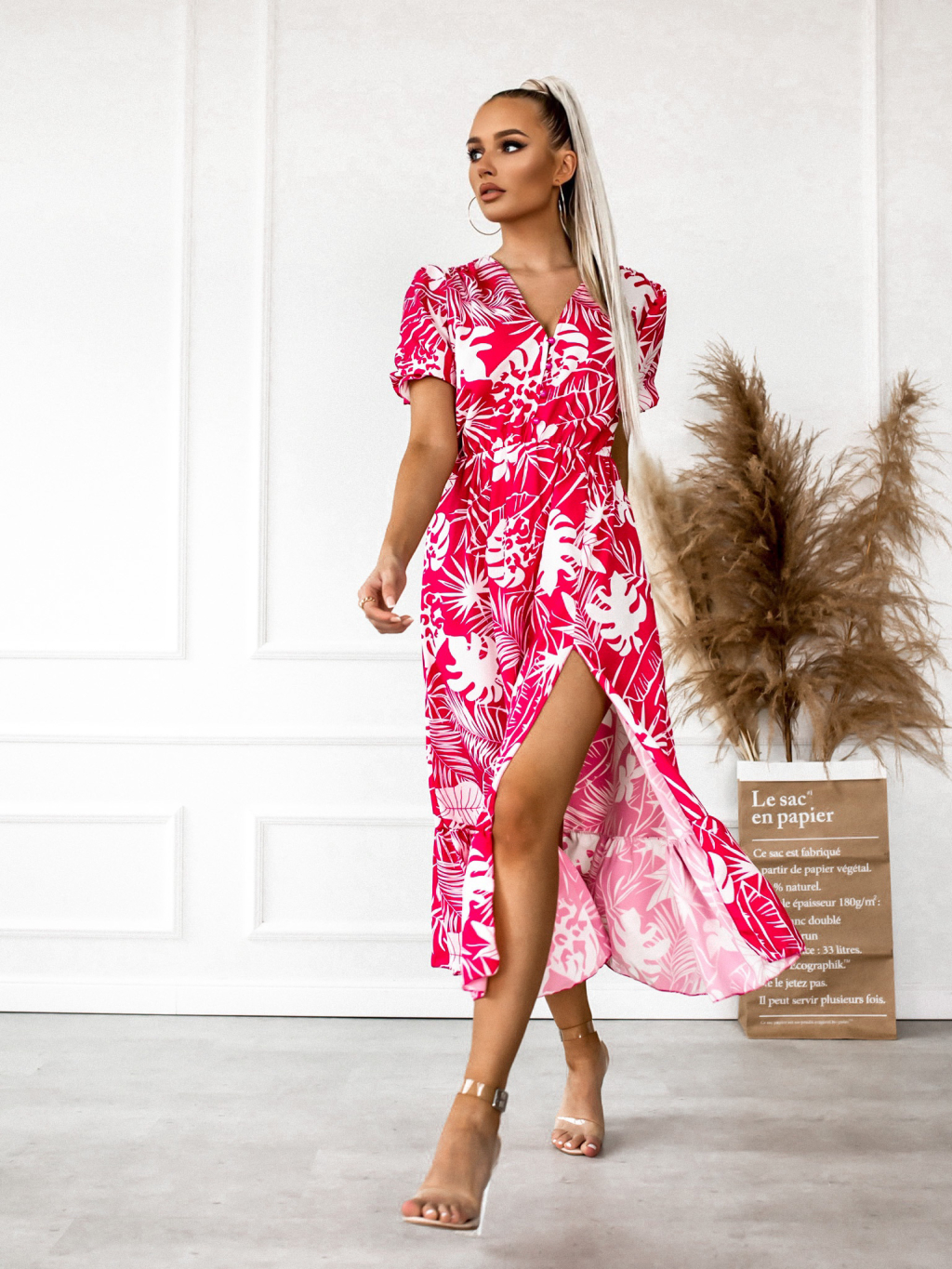 Tmavě růžové dlouhé šaty GILLIAN s květinovým vzorem a rozparkem