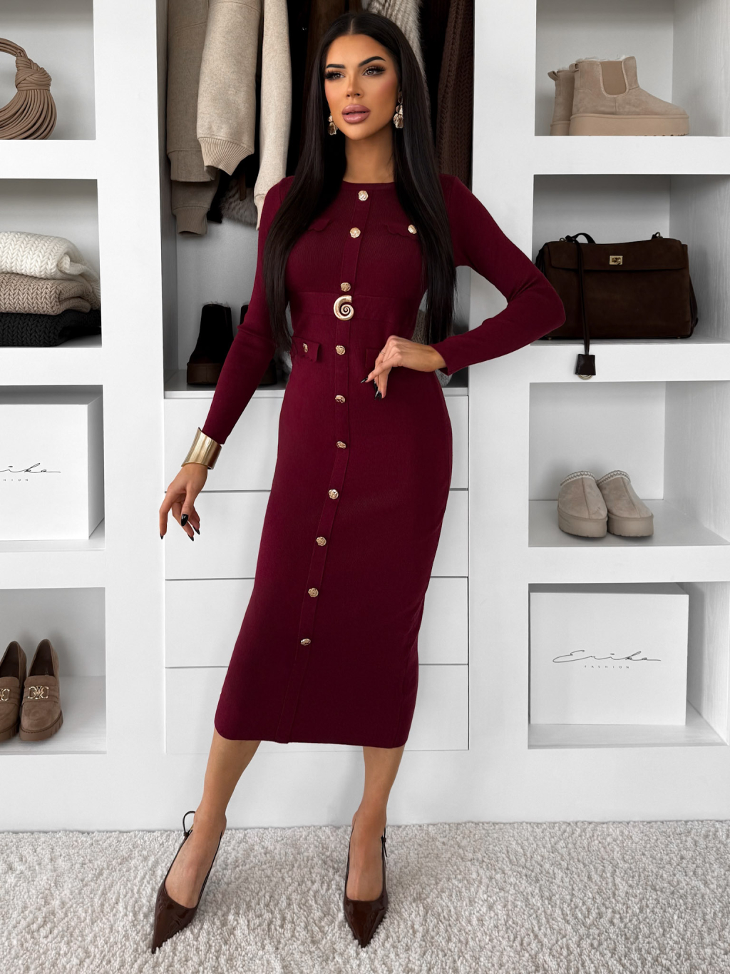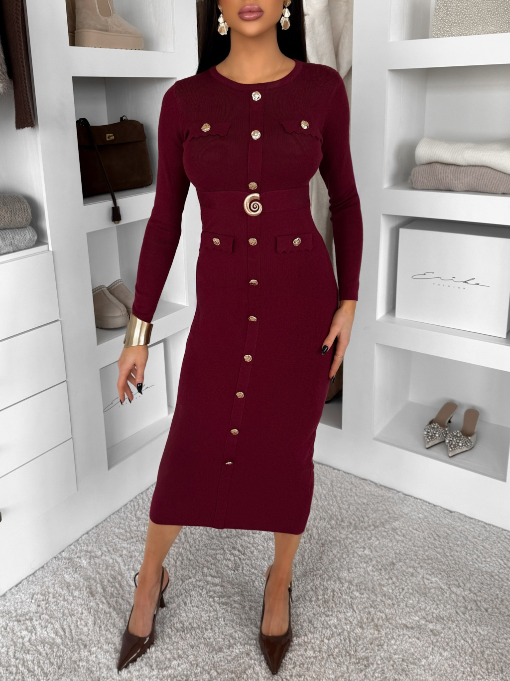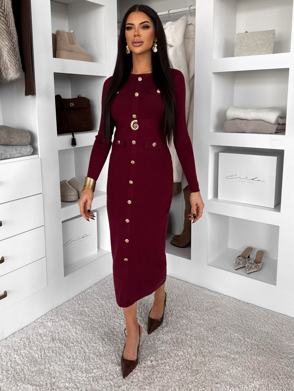 Vínové úpletové elegantní šaty CRESTILO s dlouhým rukávem