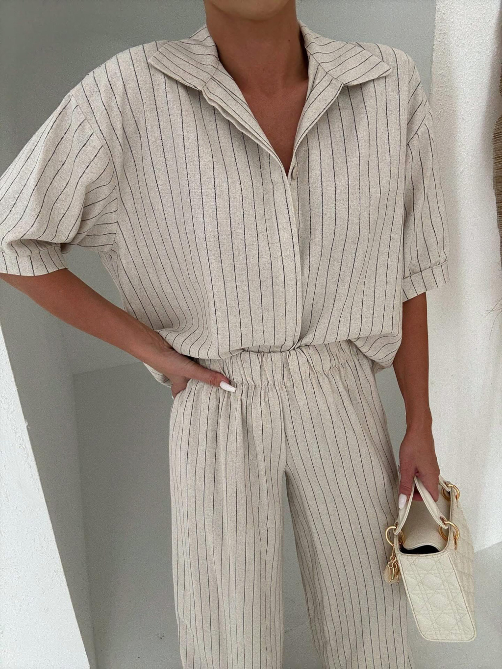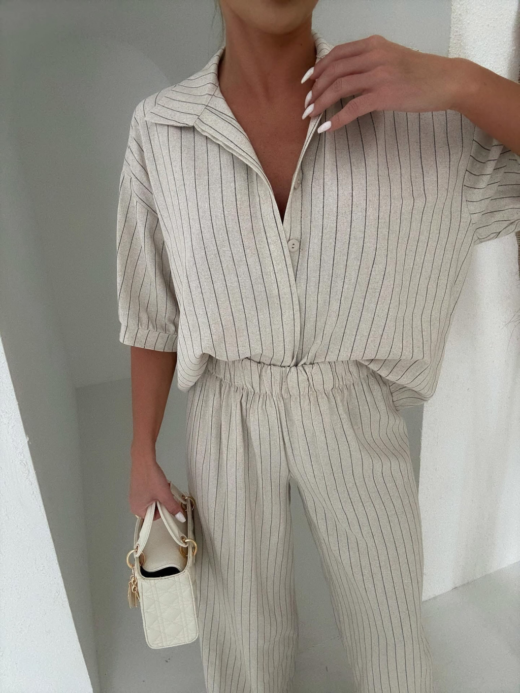 Béžový pruhovaný lněný dlouhý kalhotový komplet VELIOR
