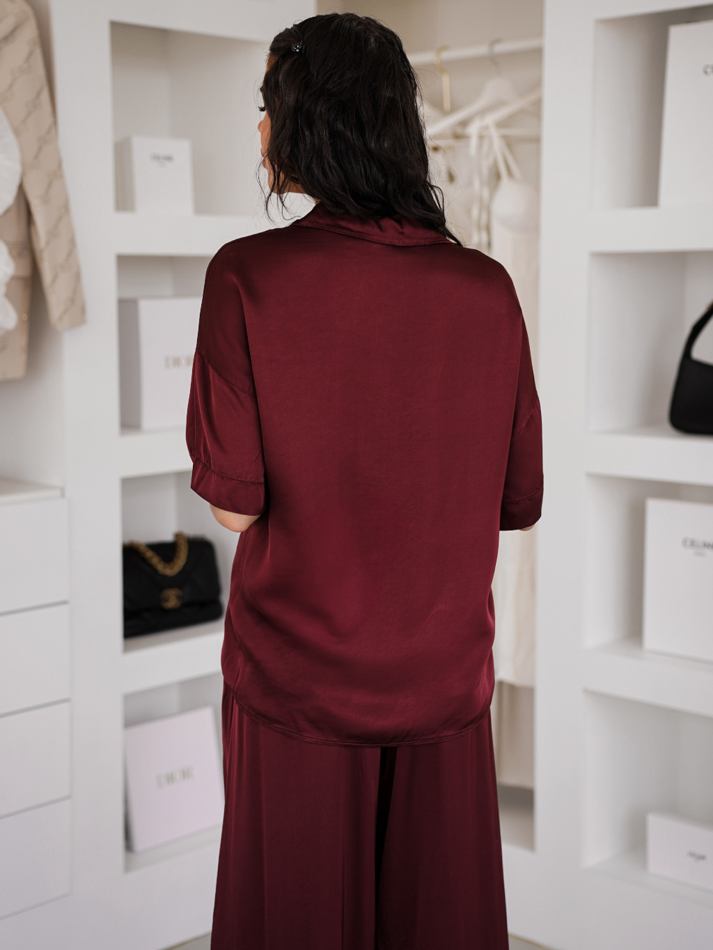 Vínová saténová letní košile JOLENE s krátkým rukávem