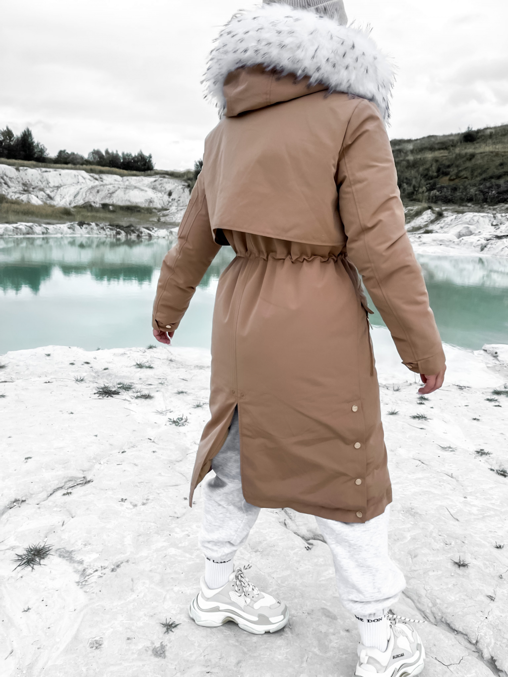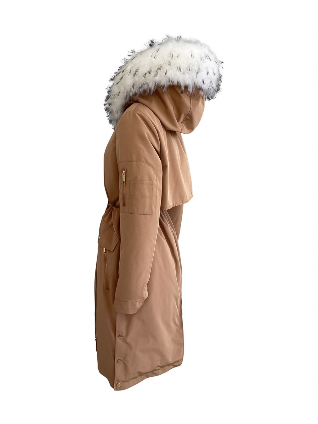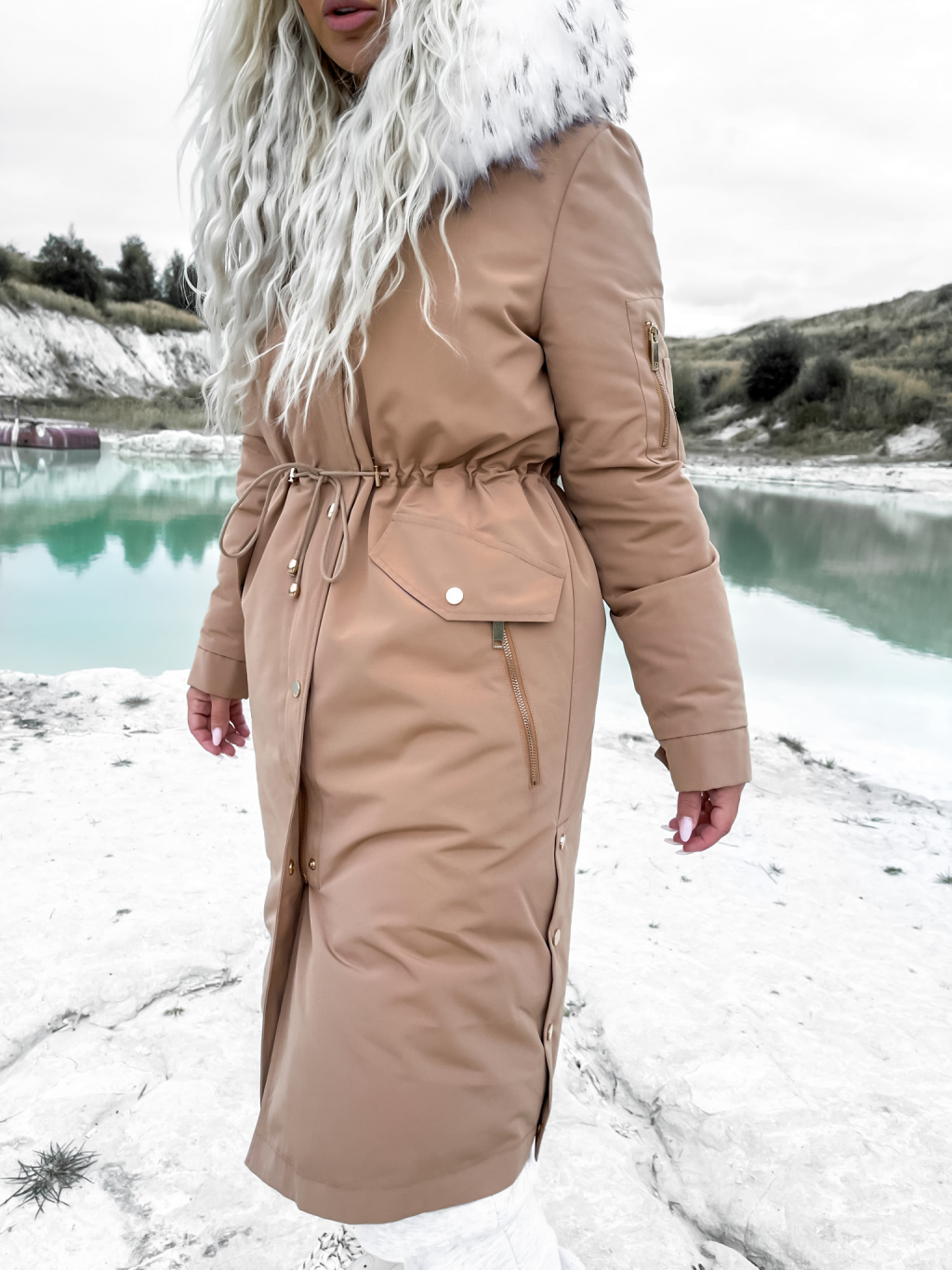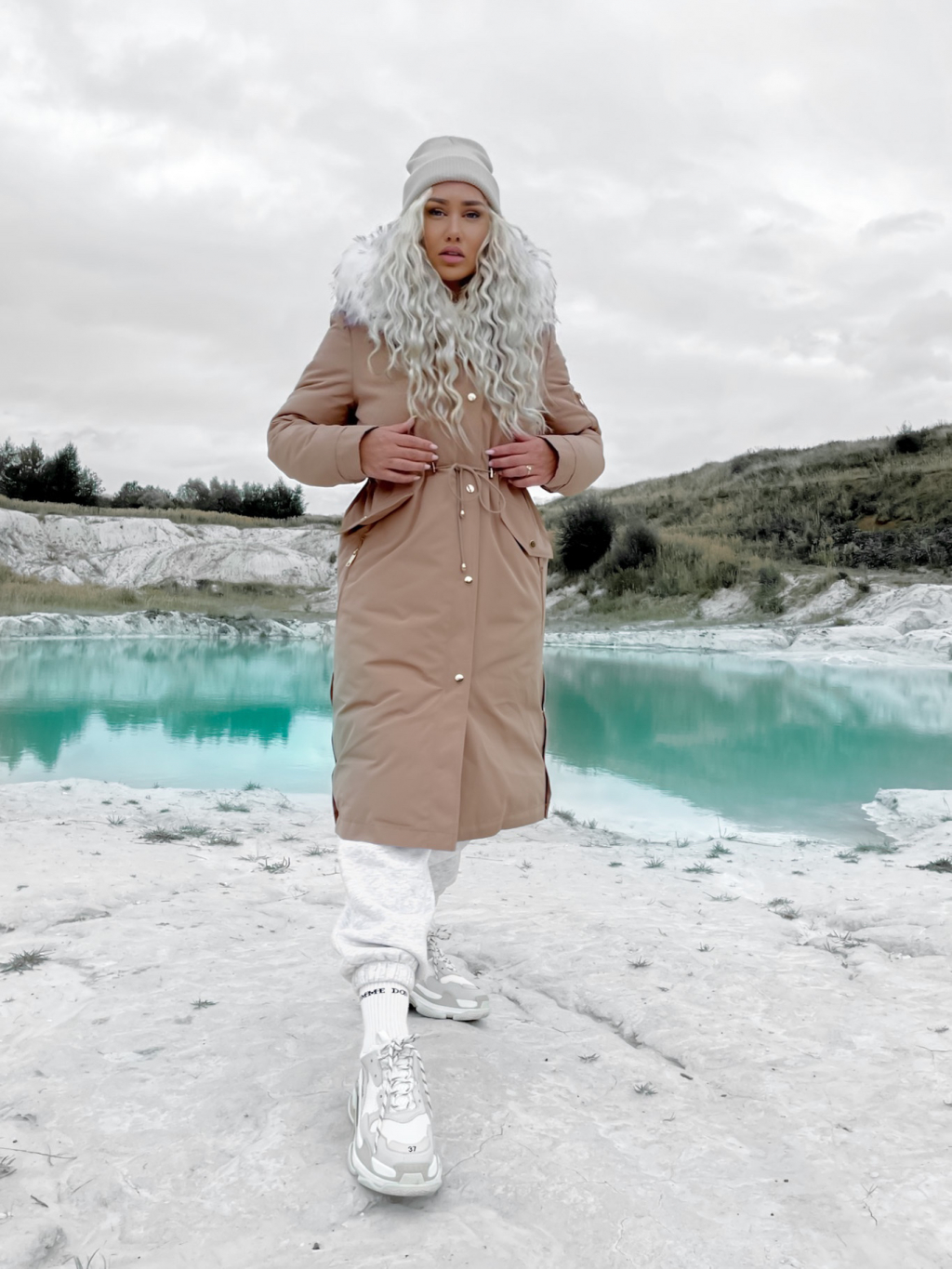 Tahle neskutečná béžová parka s propracovanými zlatými detaily tě bude opravdu bavit.