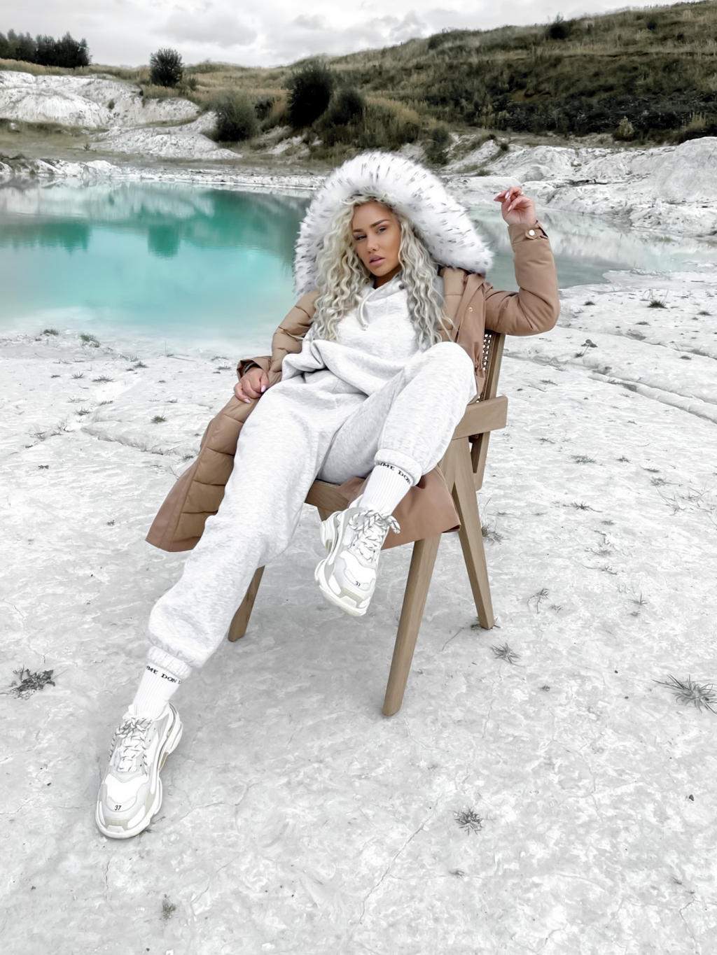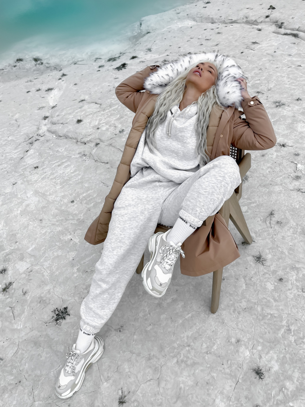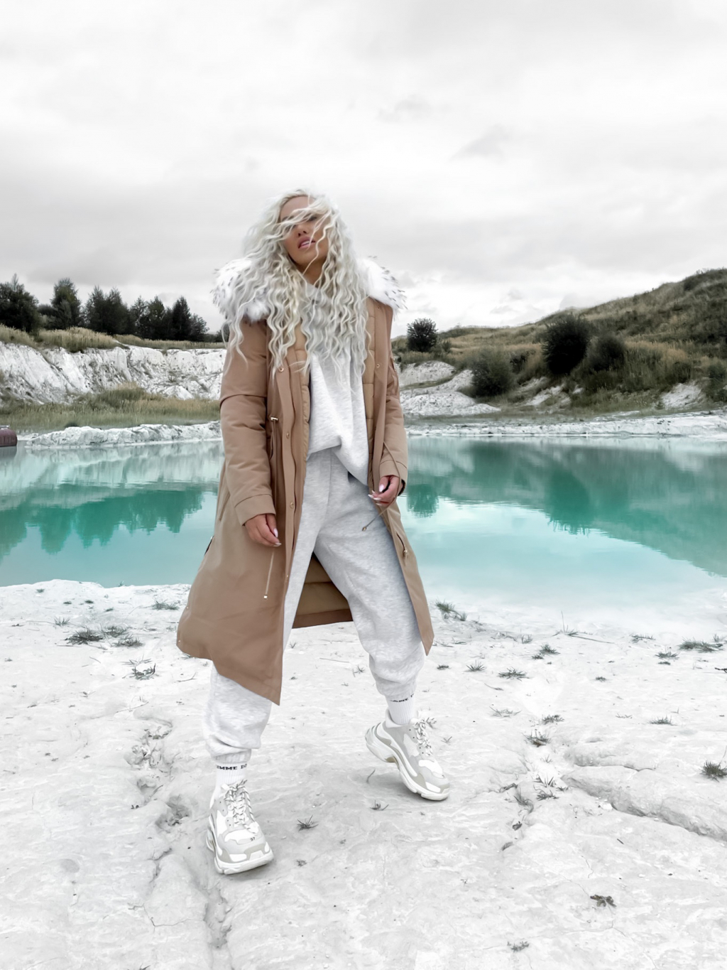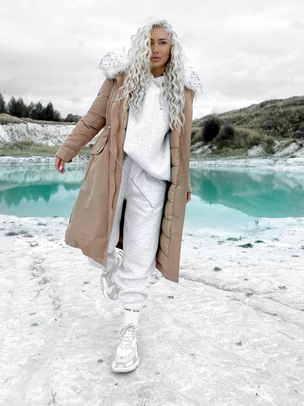 Tahle neskutečná béžová parka s propracovanými zlatými detaily tě bude opravdu bavit.