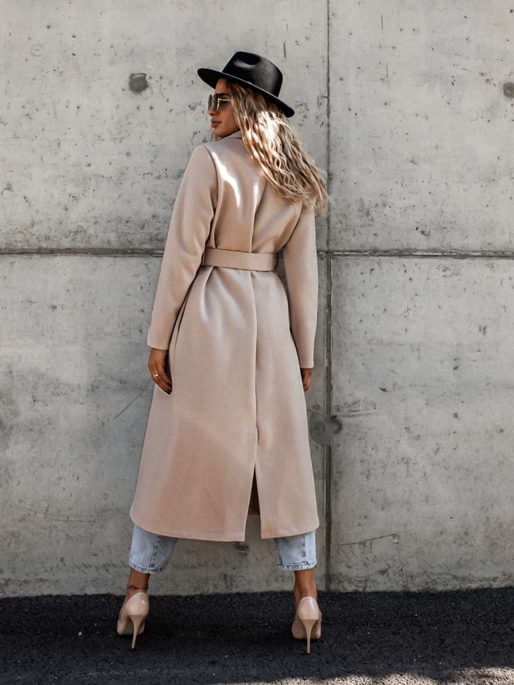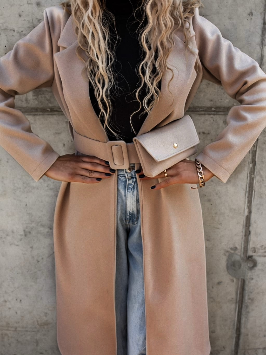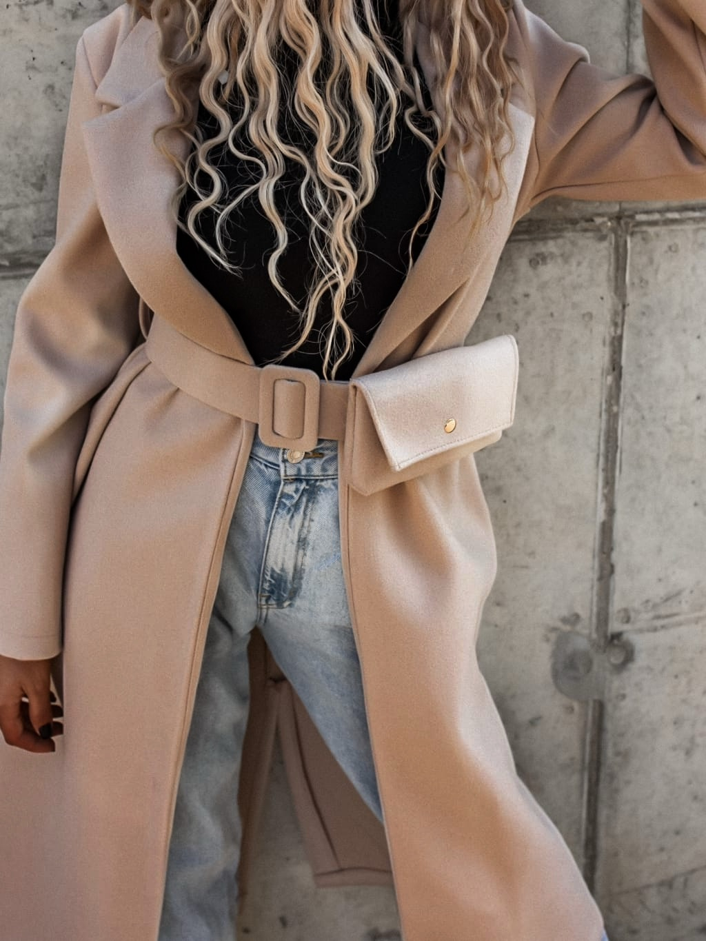 Béžový dlouhý kabát FASCINATE s páskem a kapsičkou