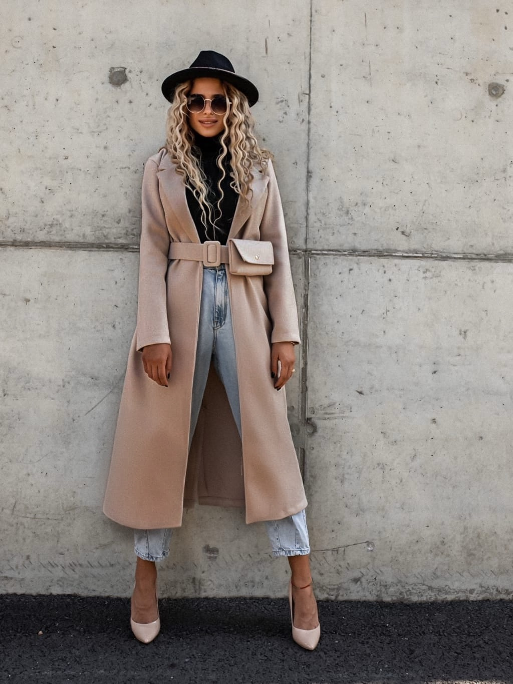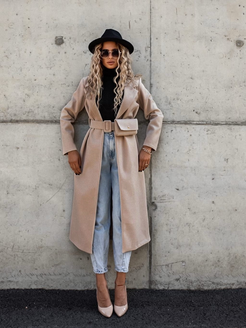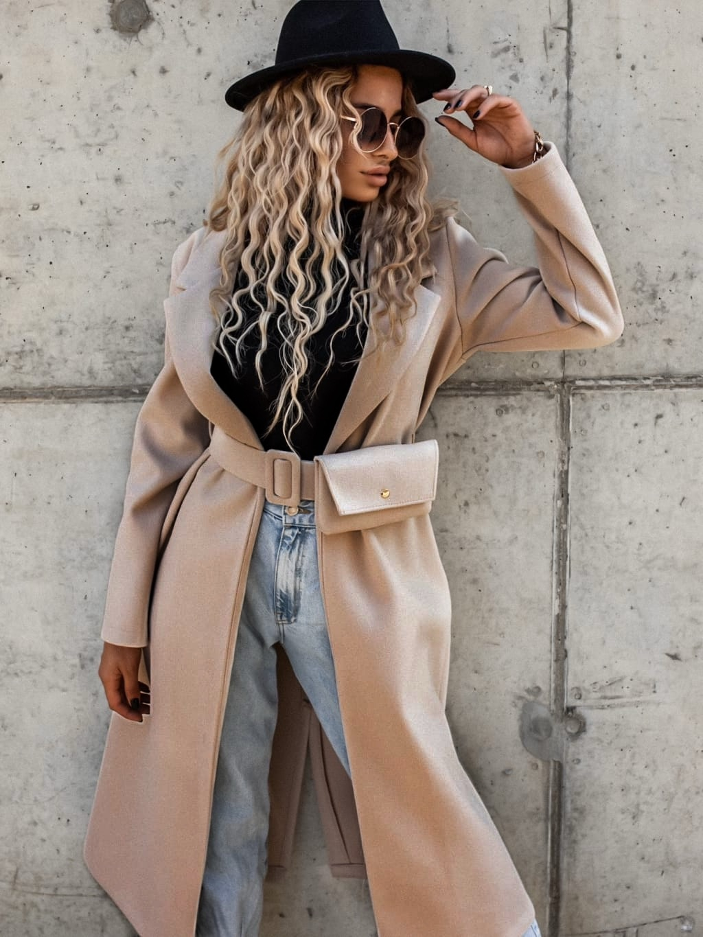 Béžový dlouhý kabát FASCINATE s páskem a kapsičkou