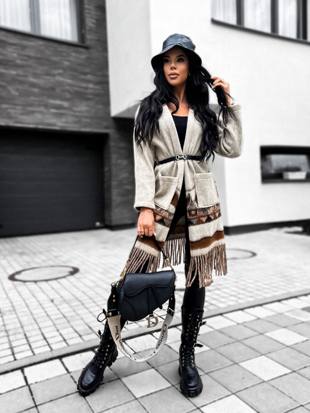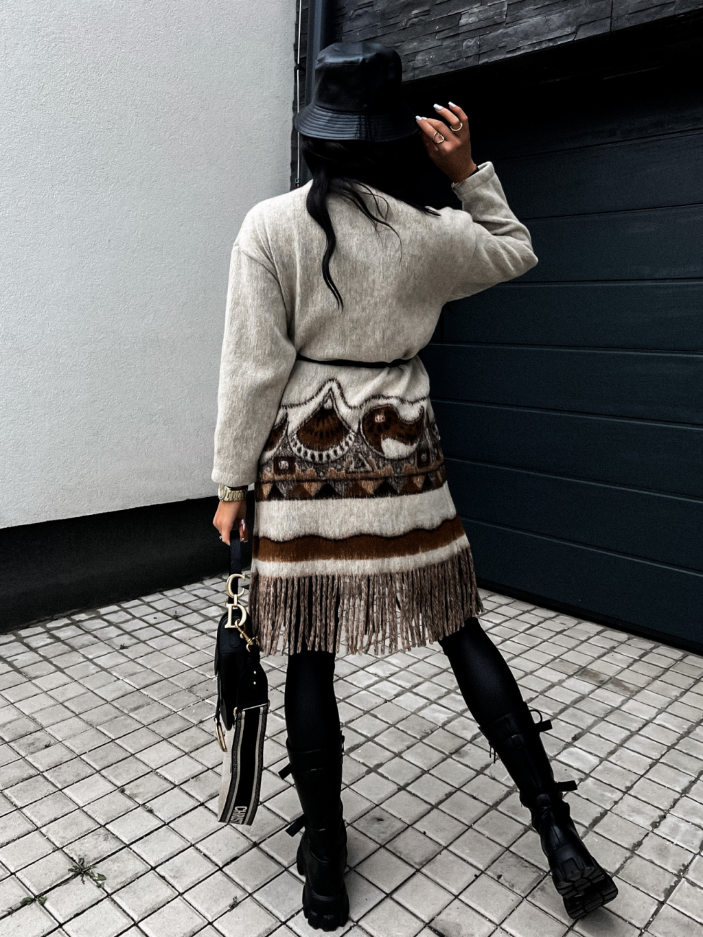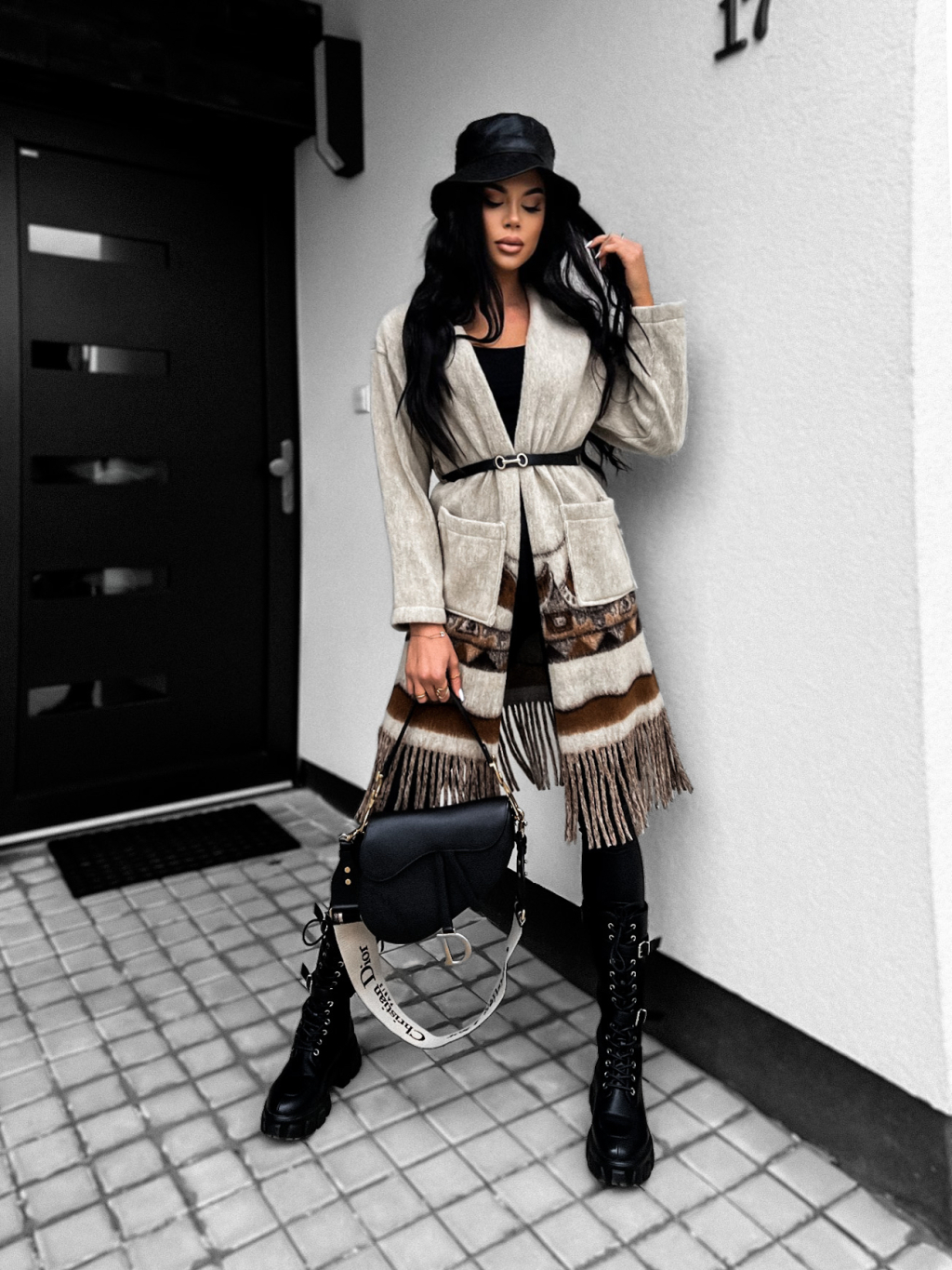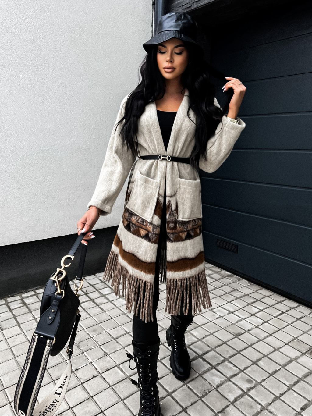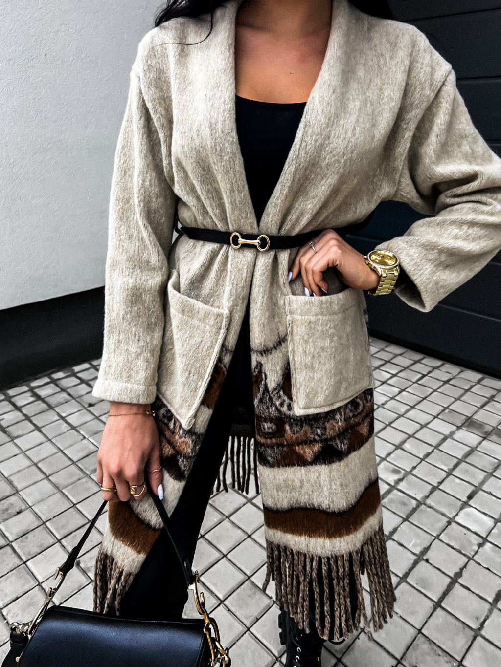 Béžový károvaný kabátek MOESTY s páskem
